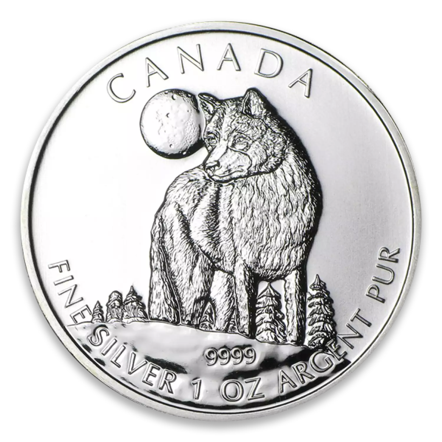 Each 2011 1 oz Canadian Silver Wildlife Series – Wolf is composed of 1 troy ounce of .9999 fine Silver. The spot price of silver tends to be more volatile than the spot price of gold and is one of the reasons that both silver premiums and spreads tend to be wider for silver coins and silver bars.