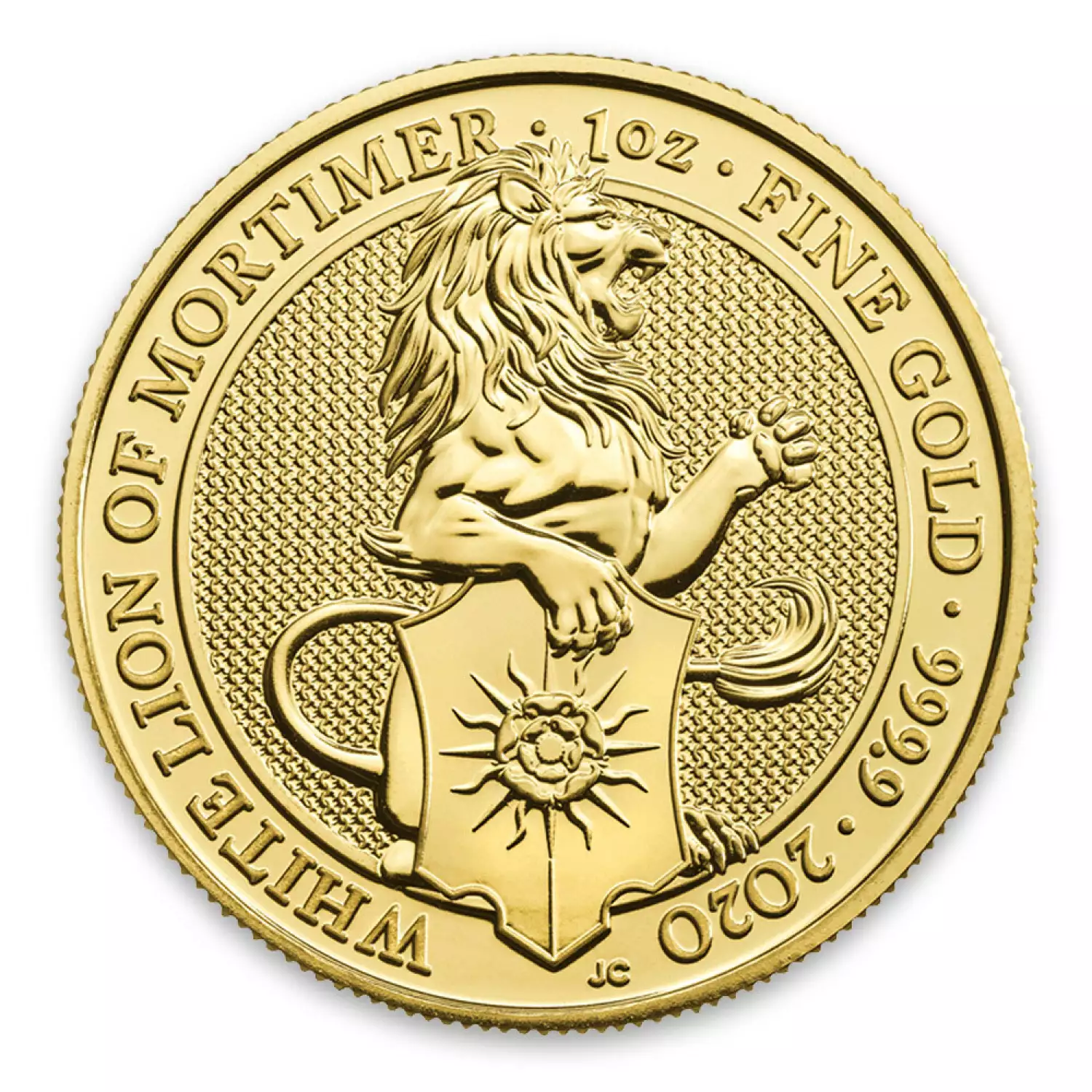 The 1 2020 Britain Queen's Beasts: The White Lion of Mortimer is the first release in an exciting new 10 coin series. The Britain Queen's Beasts celebrate the British Monarch and the centuries of fascinating heraldry. This gold coin contains 1 oz of .9999 fine Gold. The reverse, designed by Jody Clark, depicts a lion holding a shield with a rose on it, the symbol of York, along with the sun rays which symbolised good luck in the battles.