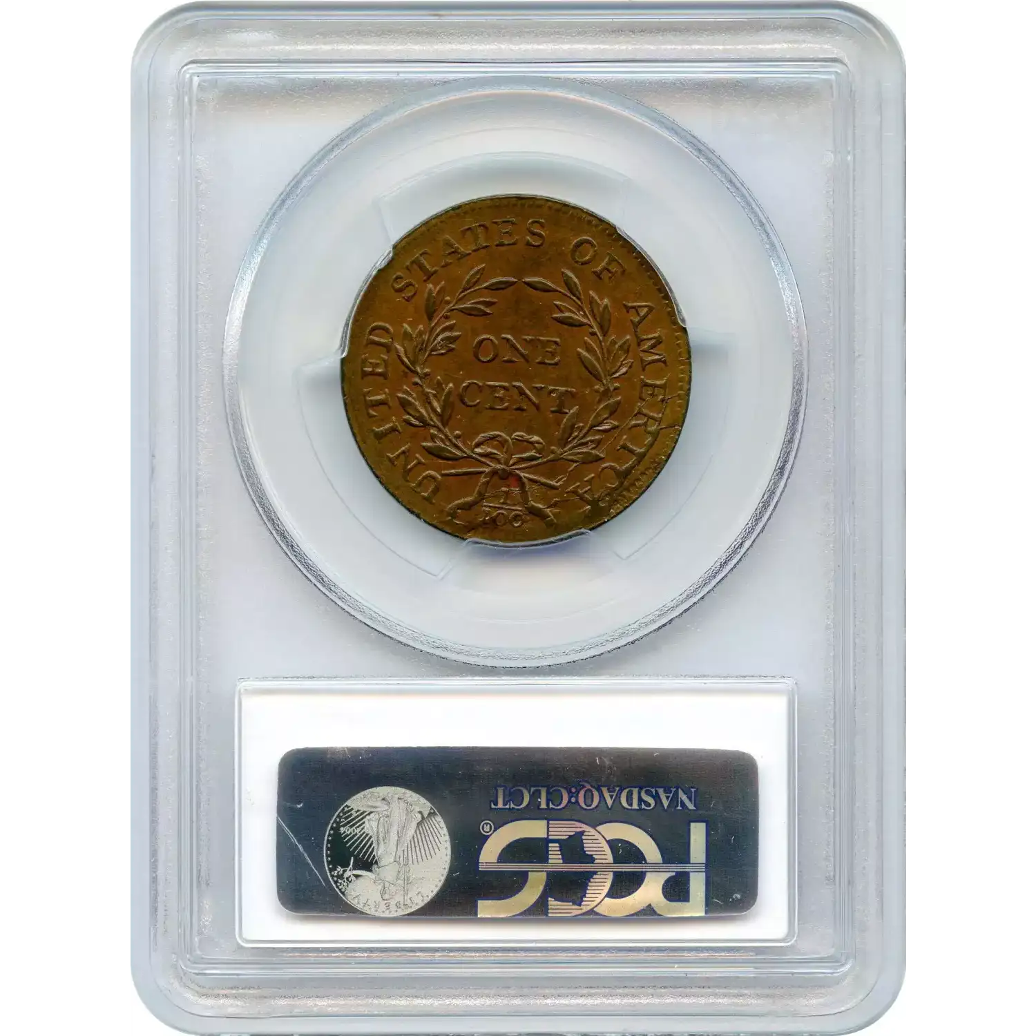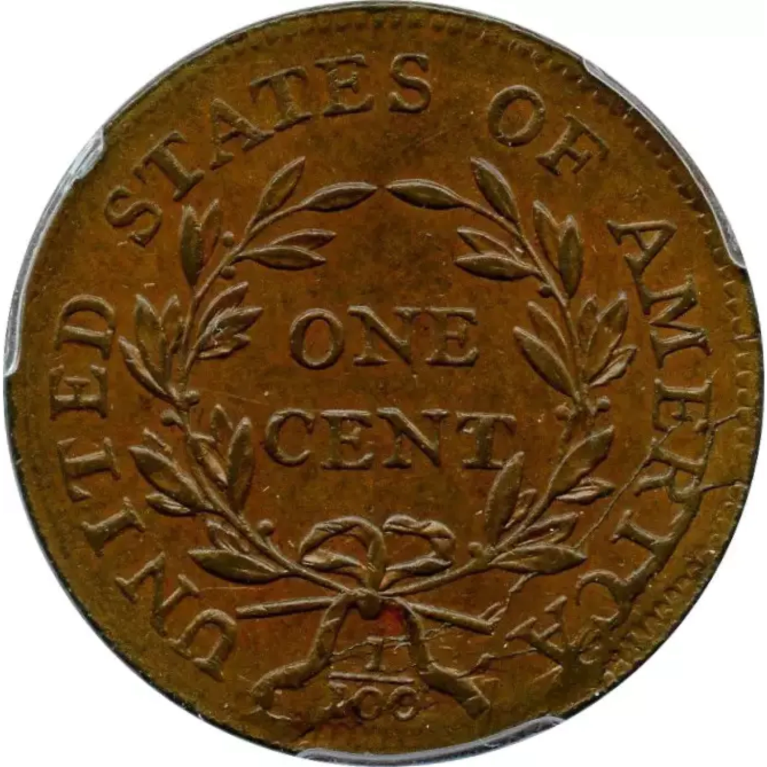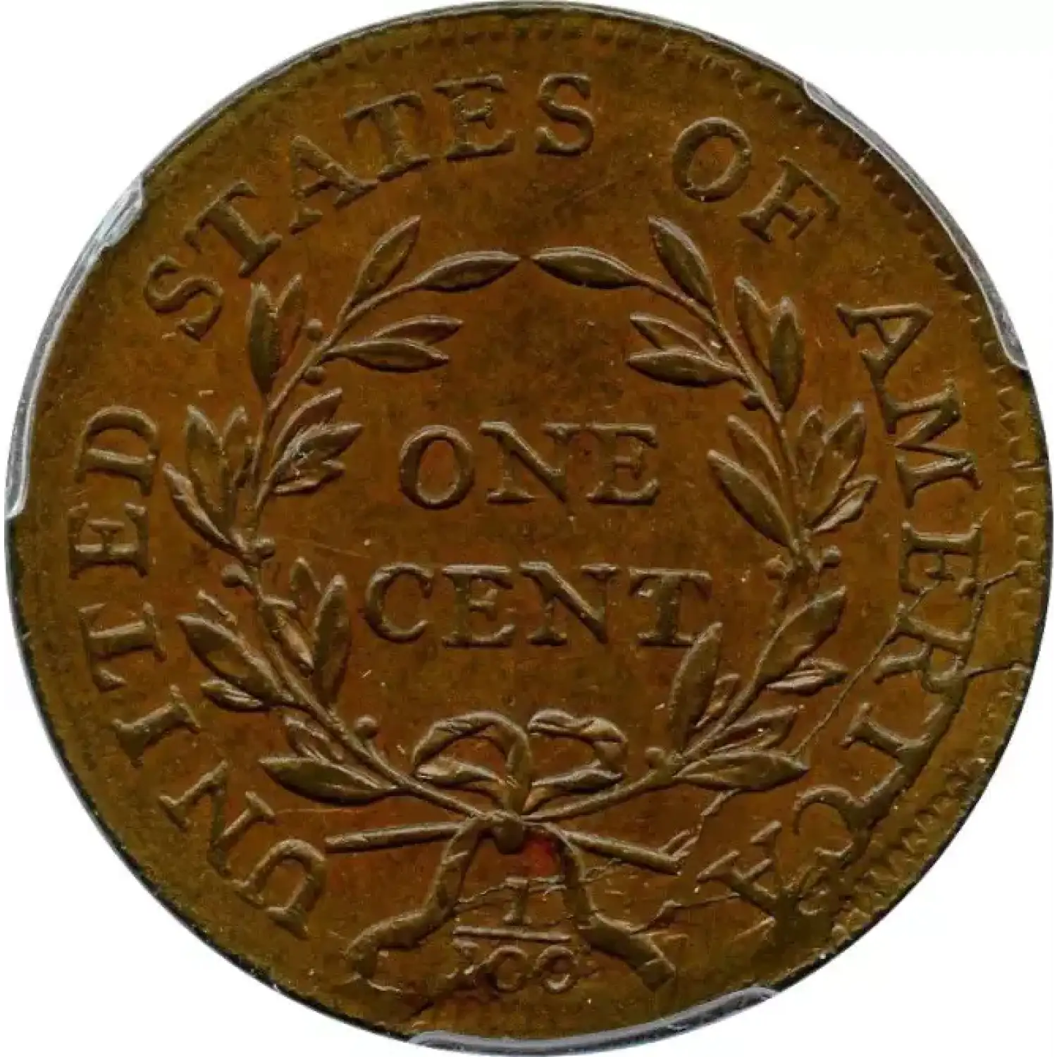 MDS, Breen state VI, with an irregular cud break at CA in AMERICA and a very thick die crack connecting the tops of RIC. Called MS60 and tied for CC#3 honors in the Bland census; Noyes photo #24081. This coin comes with an impressive provenance. The attribution and Ralls provenance are noted on the PCGS label. PCGS population 1; none finer. The only MS example graded by PCGS for the variety. (PCGS # 35816) .