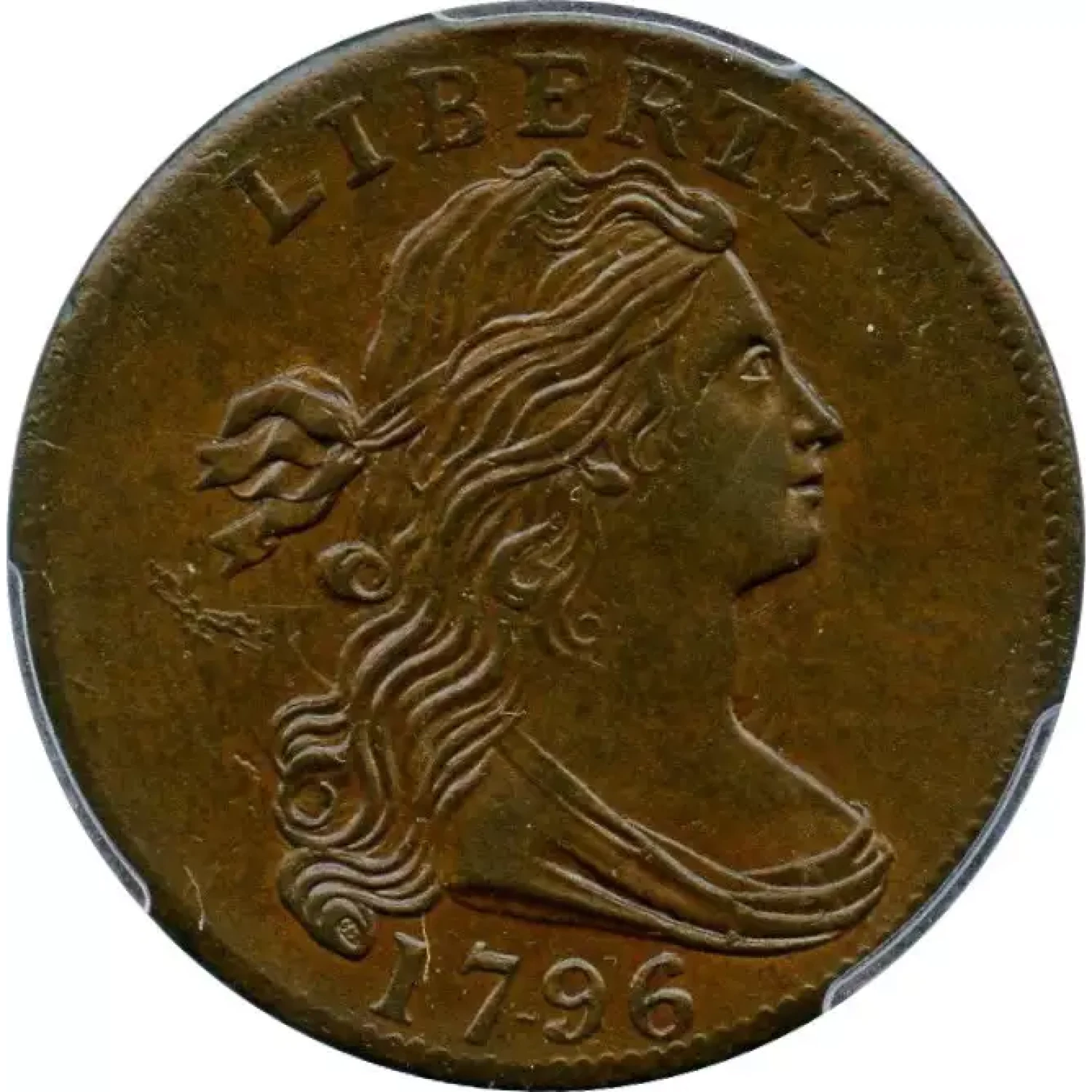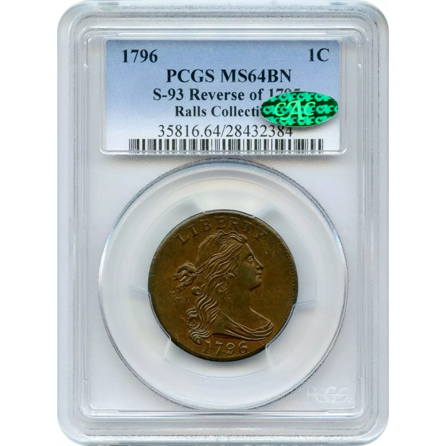 1796 S-93 R3 Draped Bust. PCGS graded MS-64 Brown. CAC Approved. Choice glossy uniform medium chocolate brown with peeps of lighter reddish brown faded down from mint red in protected areas on both sides. A gorgeous large cent, called an "Incredible Gem" by Dr. Ralls and "One of the Great Large Cents" by Del Bland. The only marks are so trivial as to be hardly worthy of mention, but a thin diagonal planchet void just left of the eye can help identify this cent.