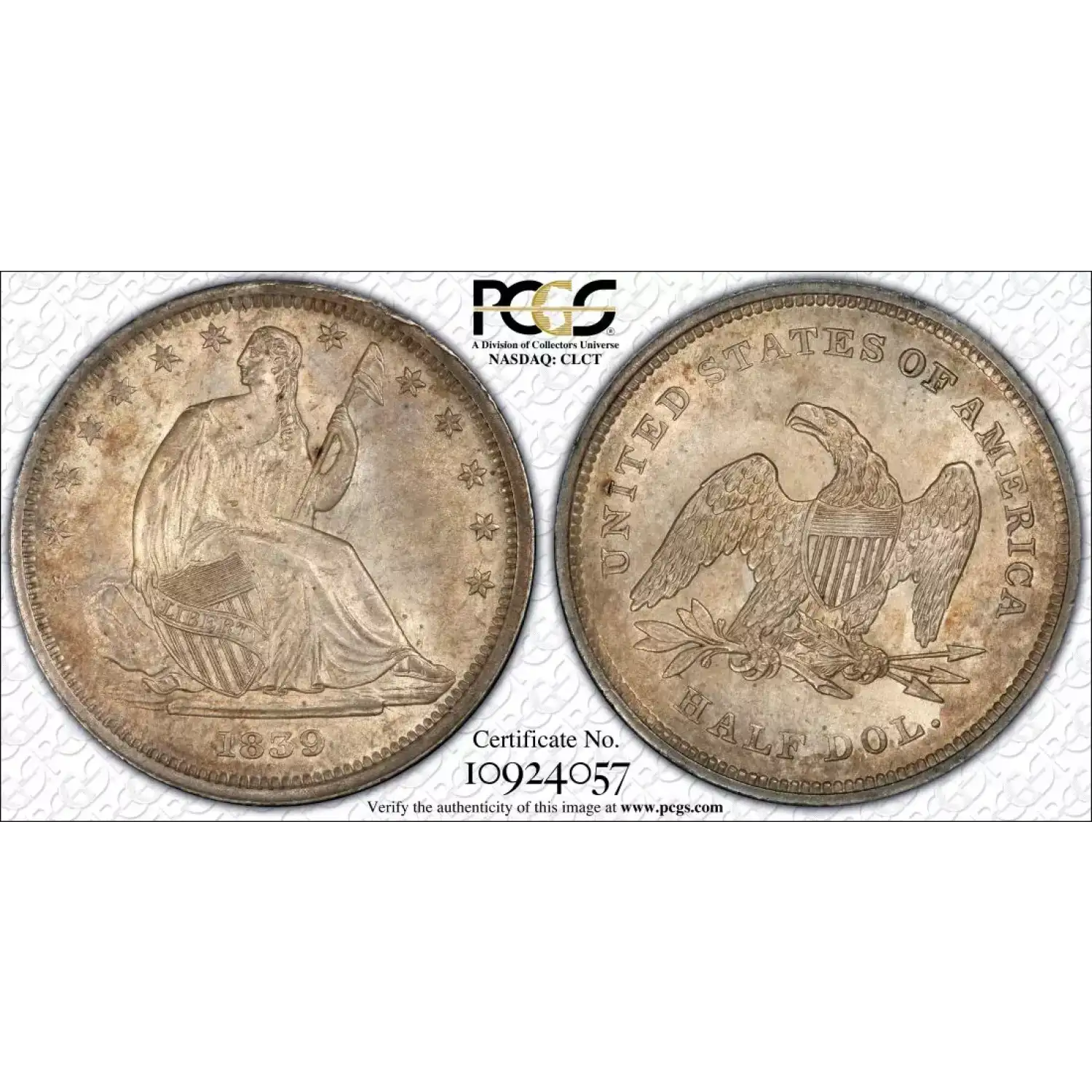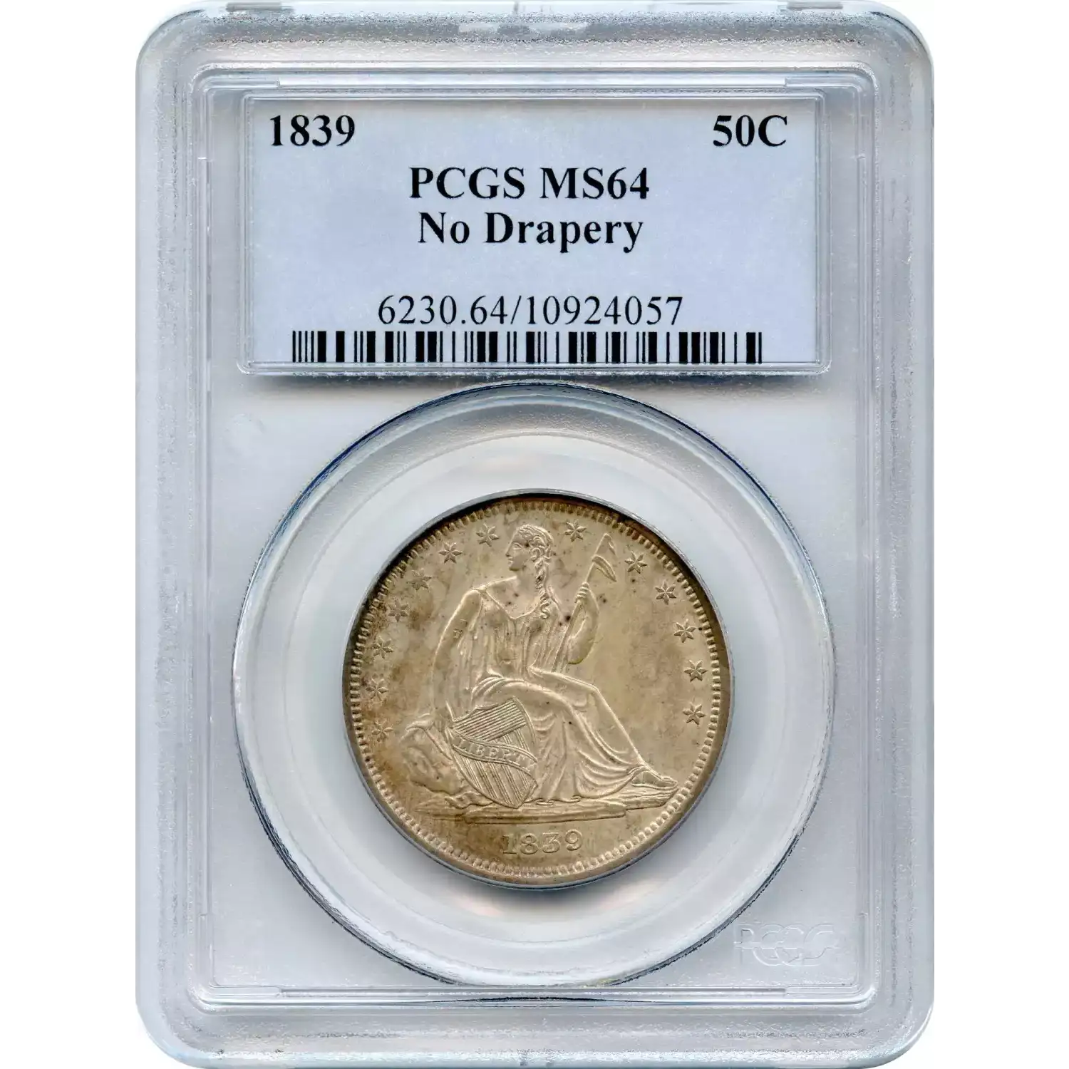 This 1839 Liberty Seated Half Dollar, No Drapery, is a rare and historically significant coin. Designed by Christian Gobrecht, this coin features a classic numismatic design. It is the important first-year issue of the Liberty Seated half dollar series. With a low mintage of 100,000, survivors, especially mint state survivors, are greatly cherished by sophisticated numismatists.
