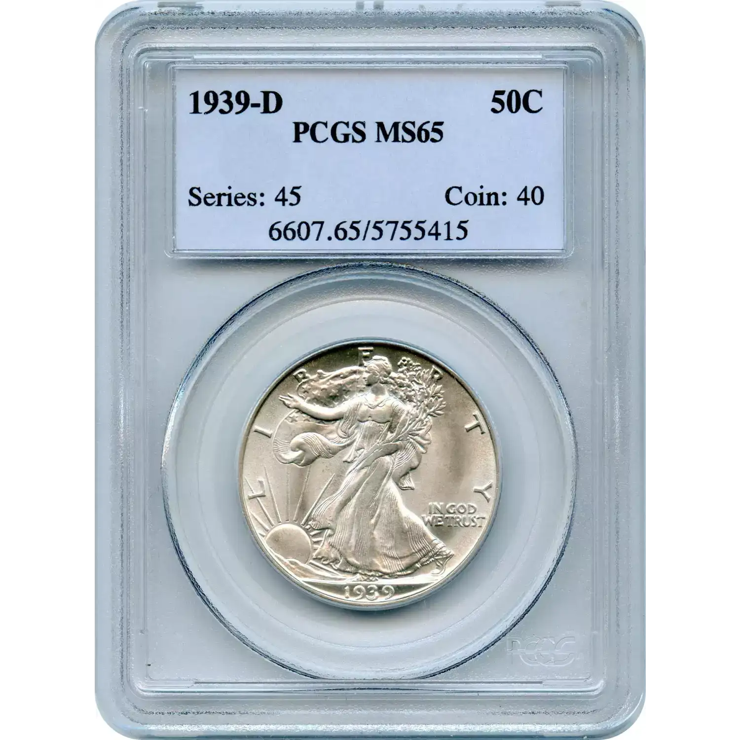 The 1939-D Walking Liberty Half Dollar represents the later phase of Adolph A. Weinman’s celebrated coin series, first introduced in 1916. PCGS has graded 2,411 as MS65 with 1,374 finer.