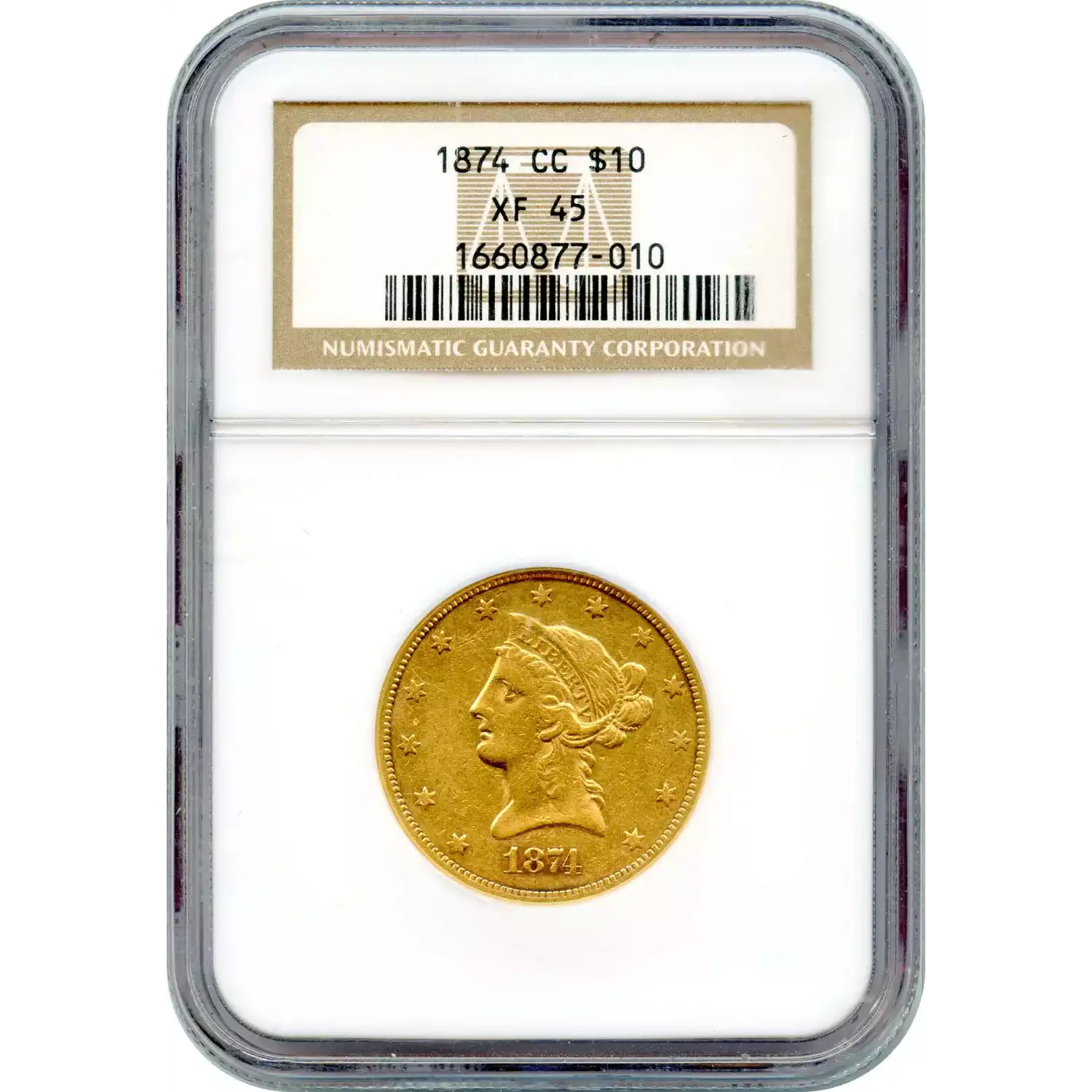 The 1874-CC $10 Liberty Head Eagle, graded NGC XF-45, is a significant artifact from the Carson City Mint. Designed by Christian Gobrecht, it features Liberty’s coroneted profile on the obverse, symbolizing freedom, and a heraldic eagle on the reverse, clutching arrows and an olive branch. The "CC" mintmark signifies its Nevada origin, a nod to the region’s gold and silver mining boom.