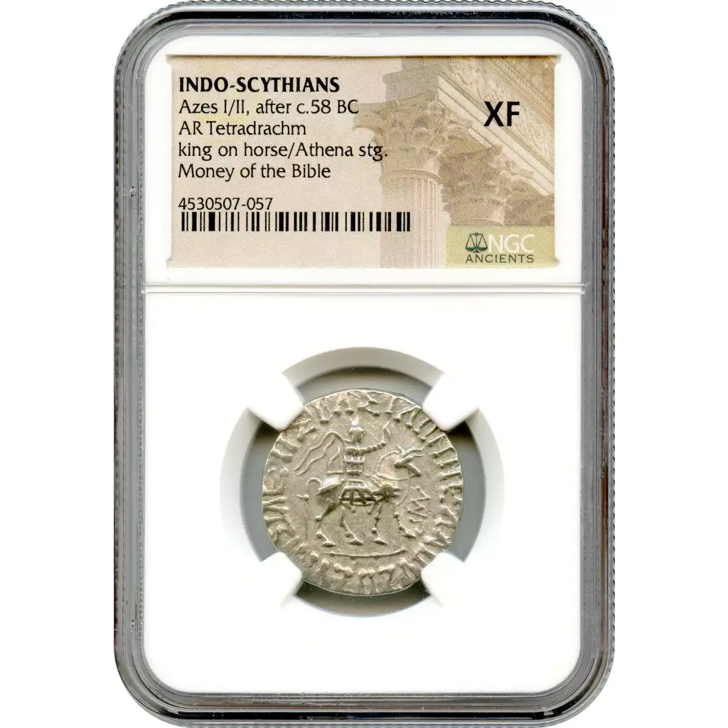 The silver tetradrachm or drachm of Azes I/II, struck after c. 58 BC in the Indo-Scythian Kingdom, is a bilingual coin tied to the biblical narrative of the "Three Wise Men." The obverse depicts King Azes (I or II) on horseback, holding a whip or spear, with a Greek inscription reading "ΒΑΣΙΛΕΩΣ ΒΑΣΙΛΕΩΝ ΜΕΓΑΛΟΥ ΑΖΟΥ" (The Great King of Kings Azes). The reverse shows Athena standing, holding a shield and spear, with a Kharoshthi inscription repeating the royal title, often alongside symbols like the Buddhist triratna. Graded examples, such as this NGC XF (Strike: 4/5, Surface: 3/5) or VF, weigh approximately 9.47 grams (tetradrachm) or 3.18 grams (drachm) and measure 23–28 mm. These coins, among the earliest bilingual issues, reflect Greek and Indian cultural fusion, inspired by Hellenistic designs.