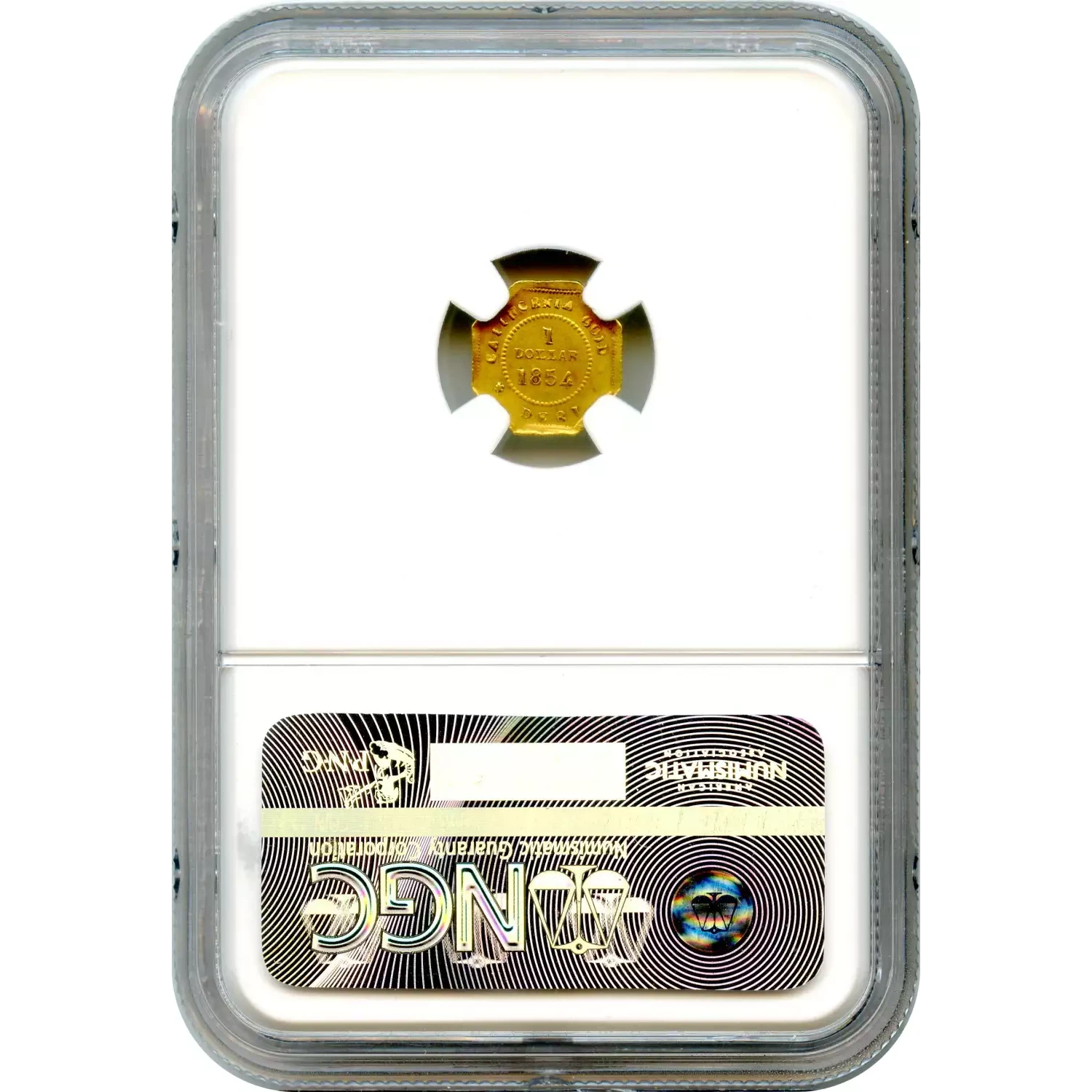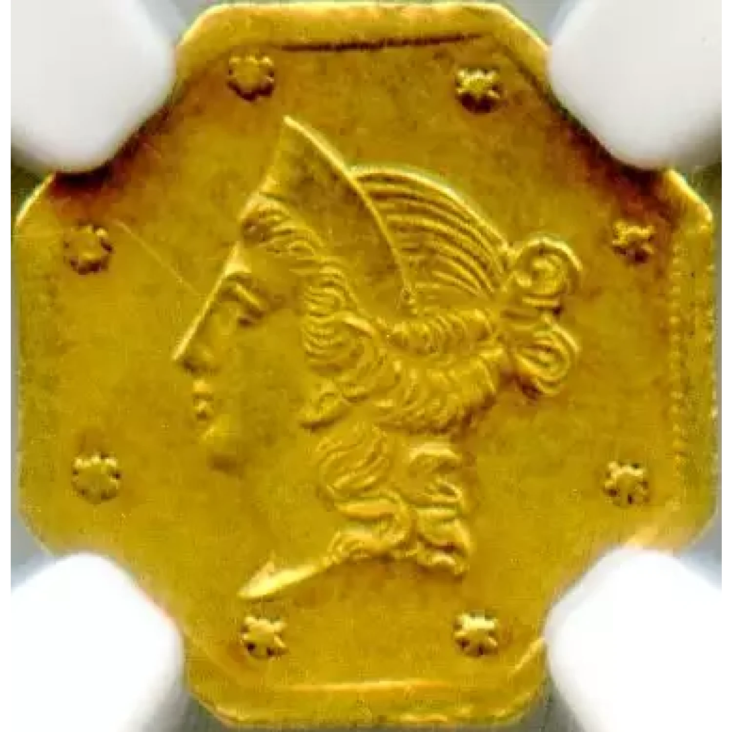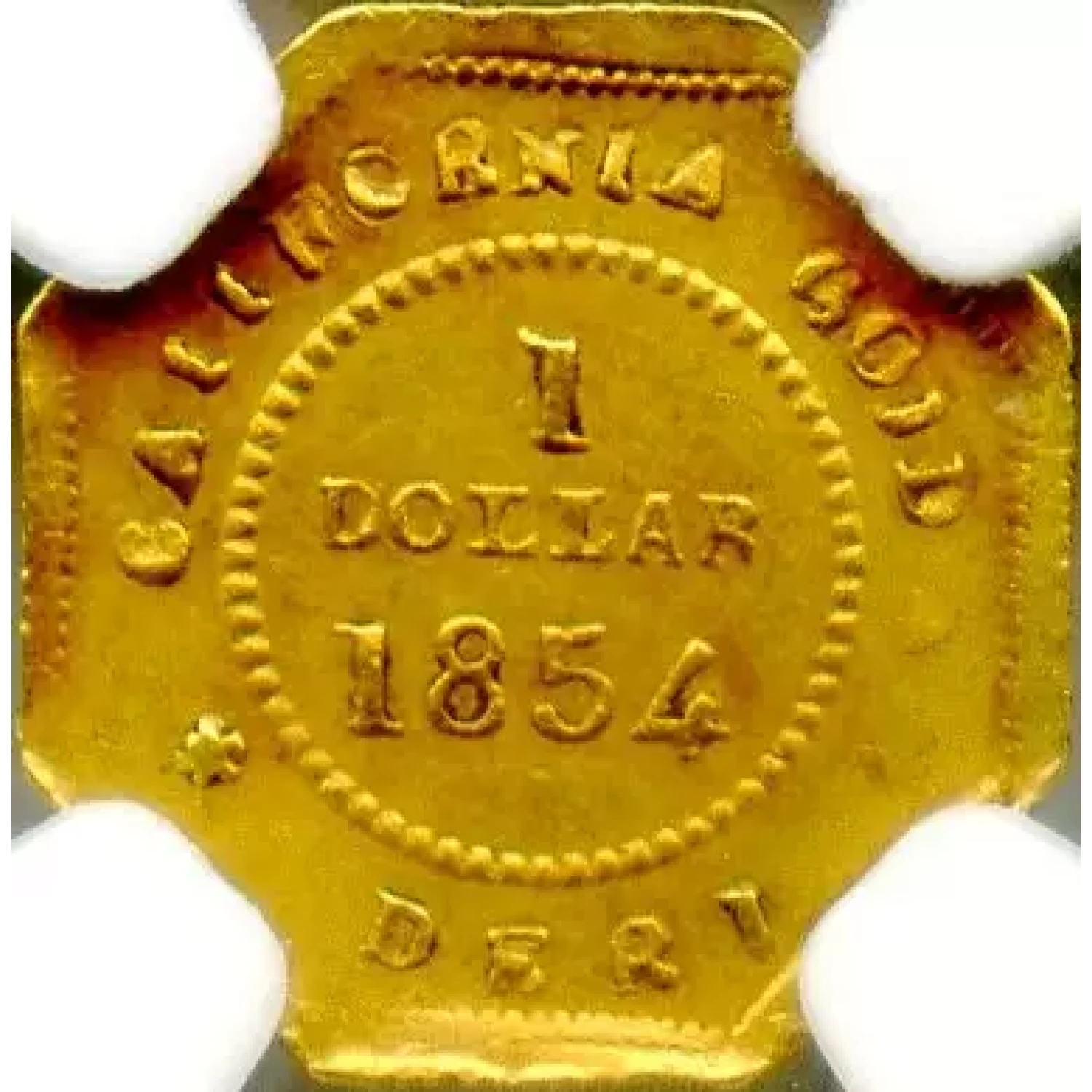 The BG-529, an octagonal $1 California fractional gold coin from 1854, is a remarkable rarity, distinguished as the finest known example, graded MS61 by NGC and the sole Mint State coin of its variety, with only four known specimens (two graded by PCGS at AU50 and AU58+, and two by NGC at AU58 and MS61). Struck with a single-use die, this coin features a Coronet-Liberty head obverse, surrounded by eight stars, mirroring federal gold coin designs, and a reverse with "CALIFORNIA GOLD" at the top, "DERI" (abbreviating M. Deriberpie) at the bottom, and "1 DOLLAR 1854" within a beaded circle, uniquely marked by two stars between "GOLD" and "DERI." Discovered in September 1980 by Jay Roe (AU50), its extreme scarcity and top-grade status make it a pinnacle for collectors, offered by AUCM and valued for its historical and numismatic significance in the expansive California fractional gold series.