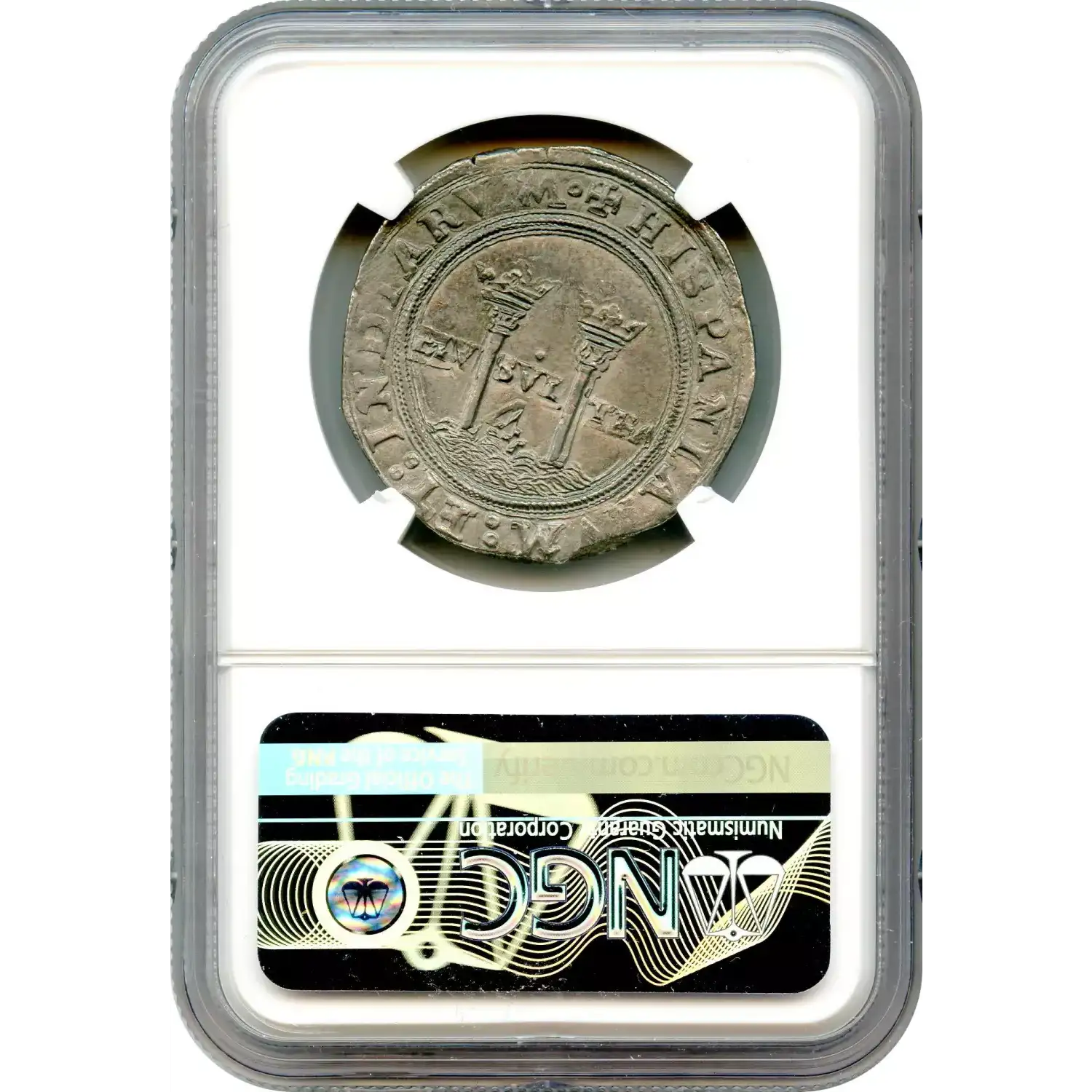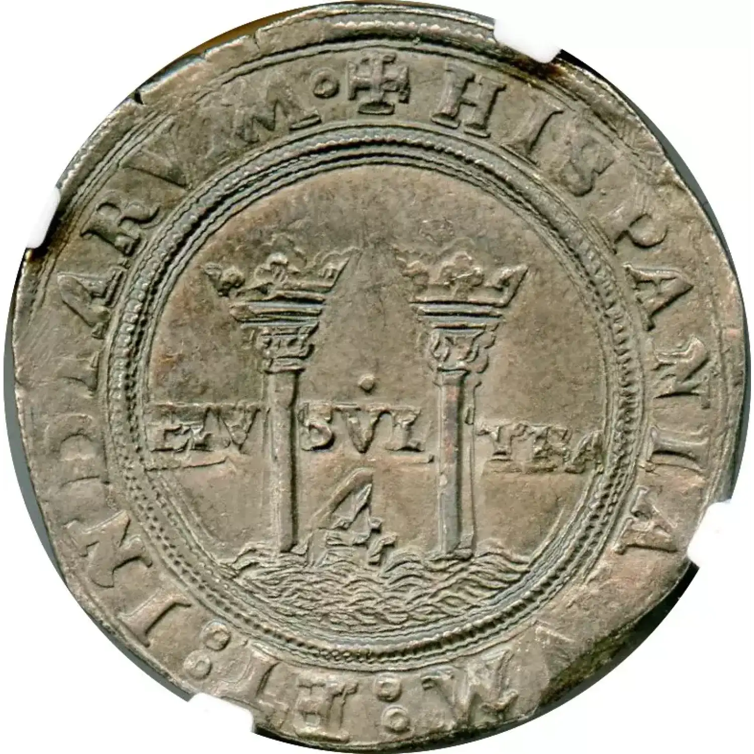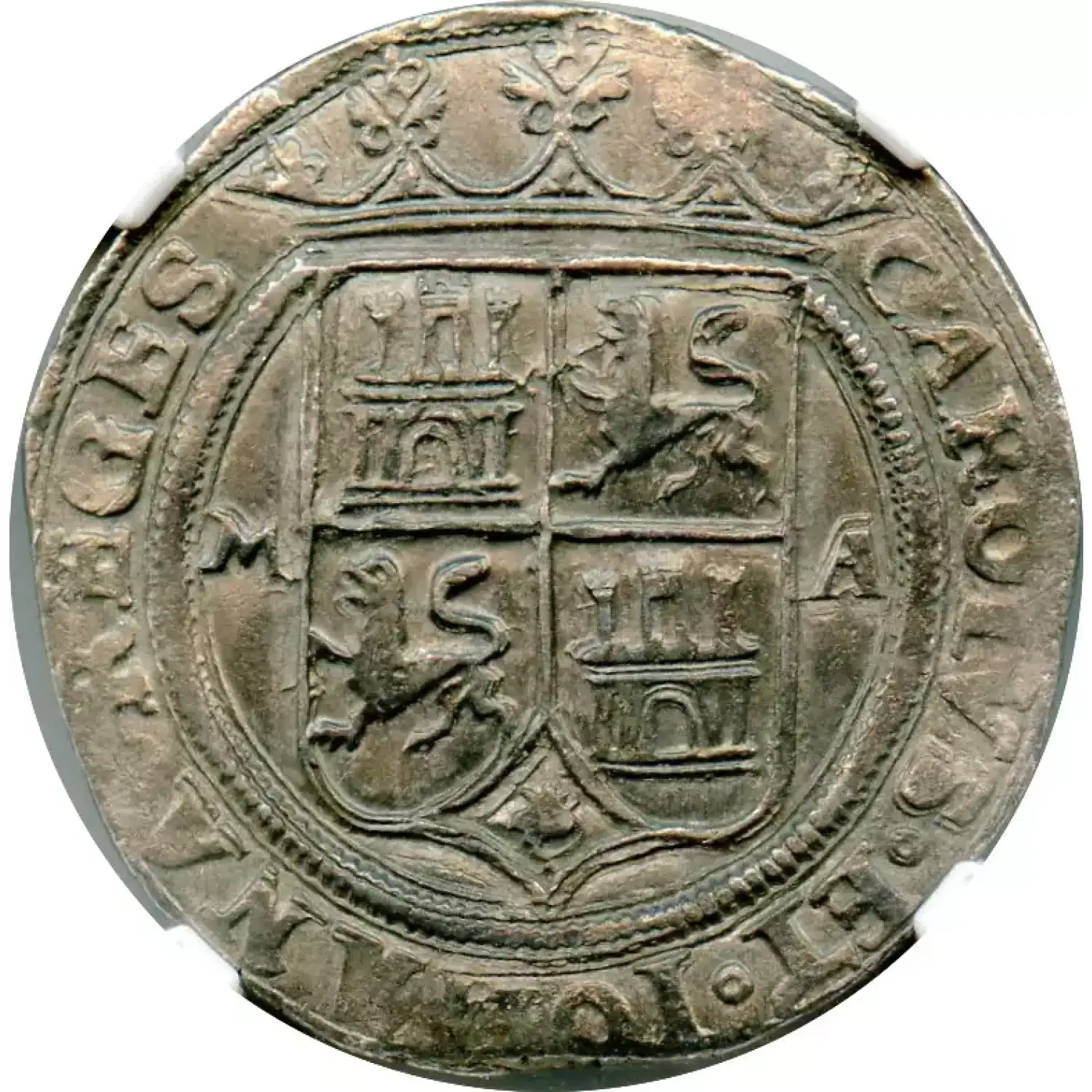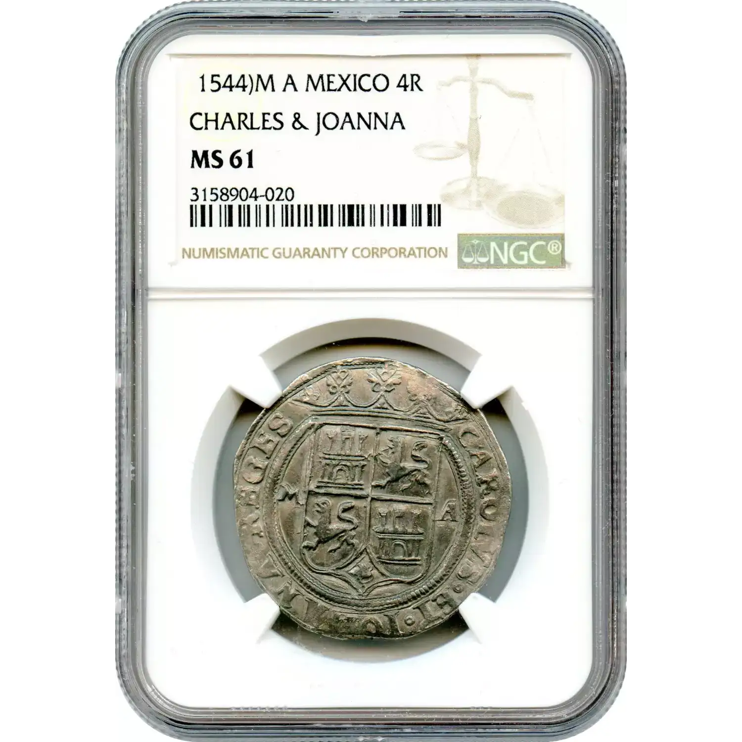In 1544, the silver 4 reales coin from Mexico, part of the Kingdom of New Spain during the Spanish Colonial Era, was a cob coin minted in Mexico City, the site of the first mint in the Americas established in 1535 under Charles I of Spain. These hand-struck coins, not milled, were crudely made by slicing metal bars into irregular blanks, weighing them, and hammering them with dies, resulting in uneven, often asymmetrical shapes with partial designs like the Habsburg shield or cross, mintmarks ("M" or "oM" for Mexico City), and assayer marks (e.g., "A" for Alonso de Villaseca). Unlike later milled coins introduced in the 1730s, these early cobs had inconsistent edges and weights, around 13.5 grams for a 4 reales, but were widely used in global trade, reflecting the primitive minting techniques of the early colonial period.