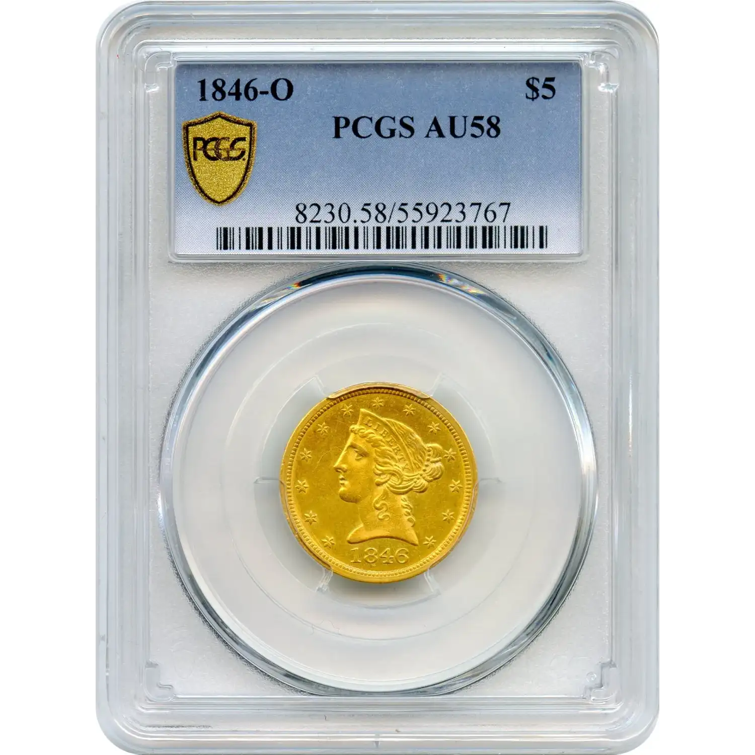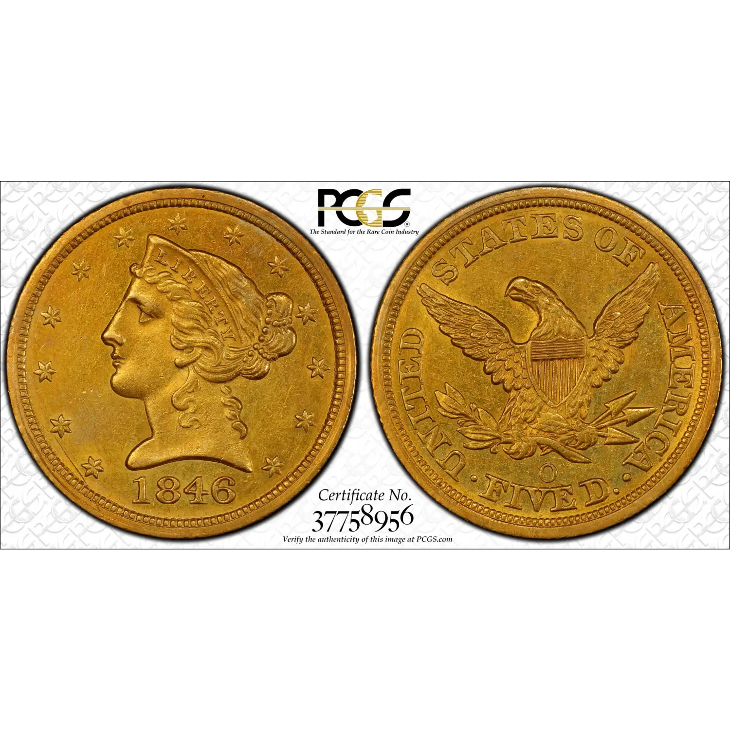 The New Orleans Mint produced 58,000 of these coins in 1846, making it scarcer than Philadelphia issues but more common than Charlotte or Dahlonega mints for that year. The 1846-O Half Eagle is considered scarce, particularly in higher grades. Most surviving examples are in Very Fine (VF) to Extremely Fine (EF) condition, with About Uncirculated (AU) examples being rare and Uncirculated (MS) coins extremely rare. Estimated surviving population is 100-125 coins, with only a few in AU50-AU55 and six or seven in Uncirculated, including a single NGC MS63 and a few MS62s. Collectors value it for its rarity, especially in choice condition with original color and surfaces, as many have been abraded or cleaned.