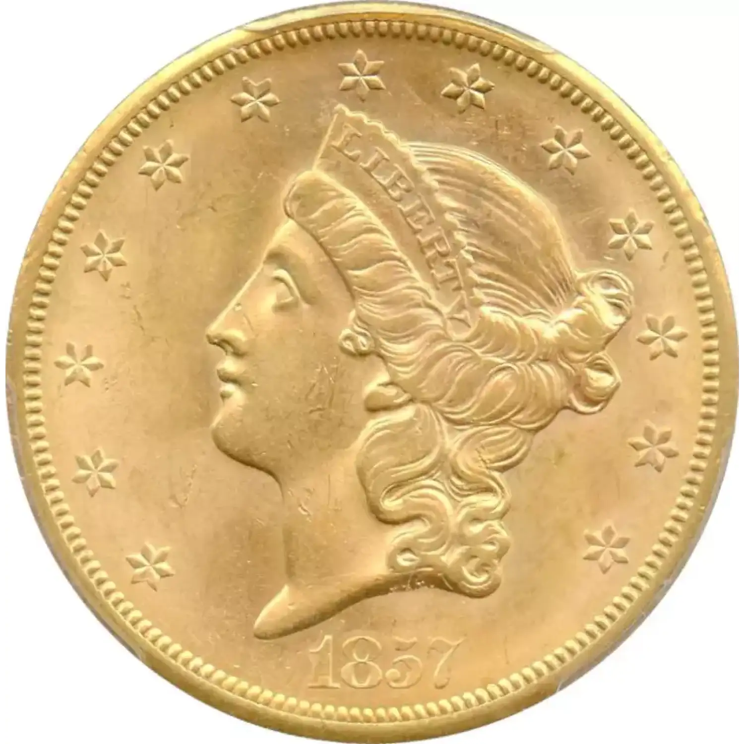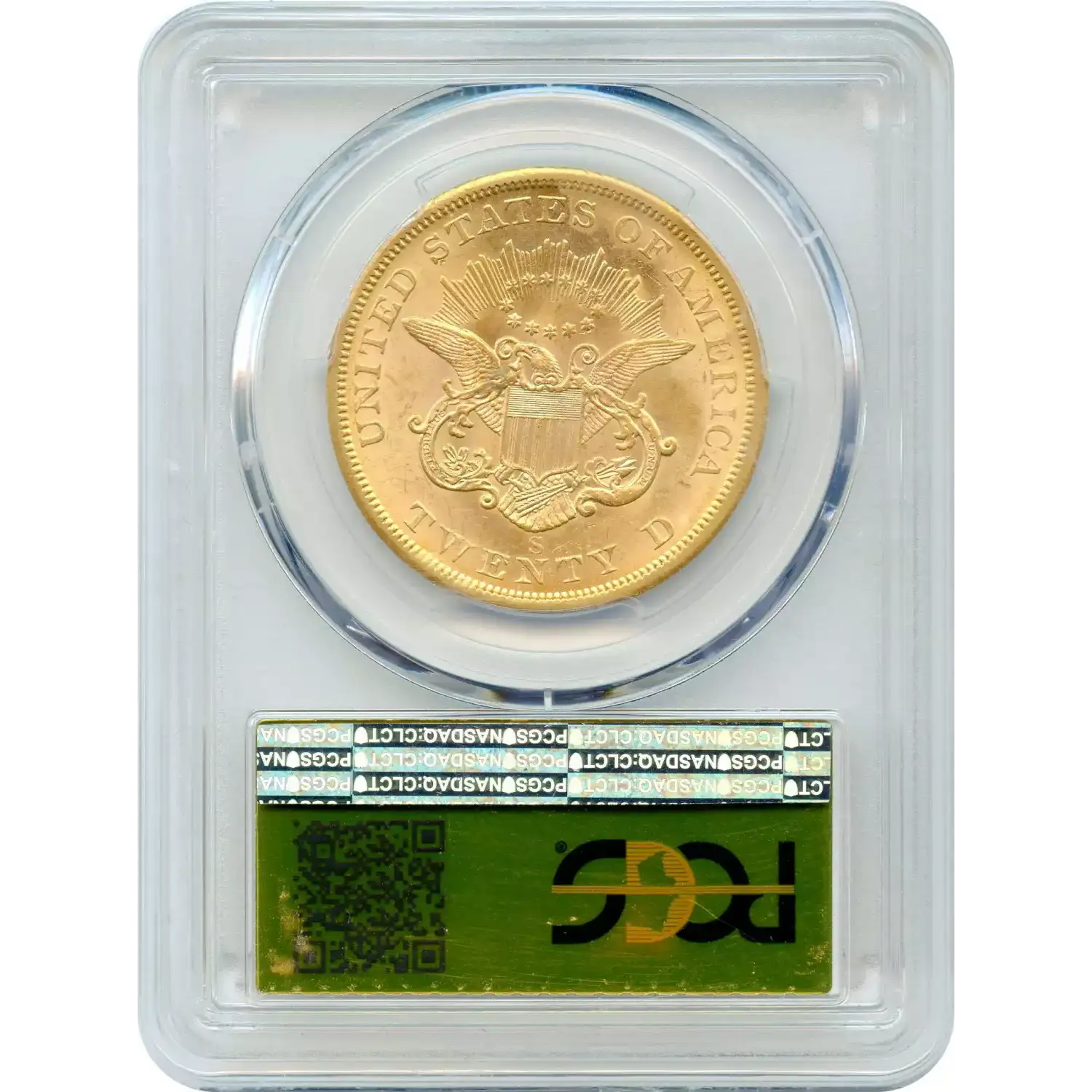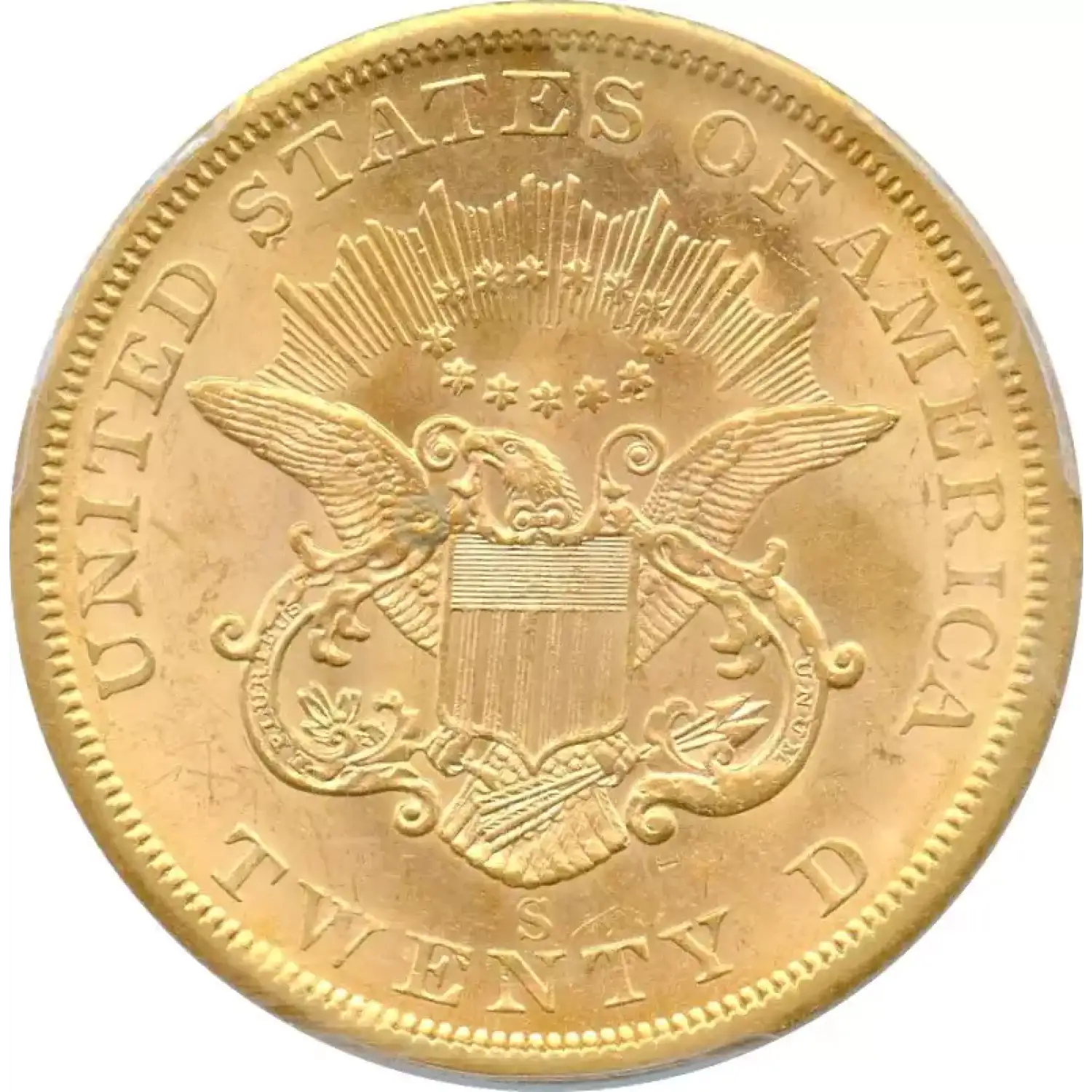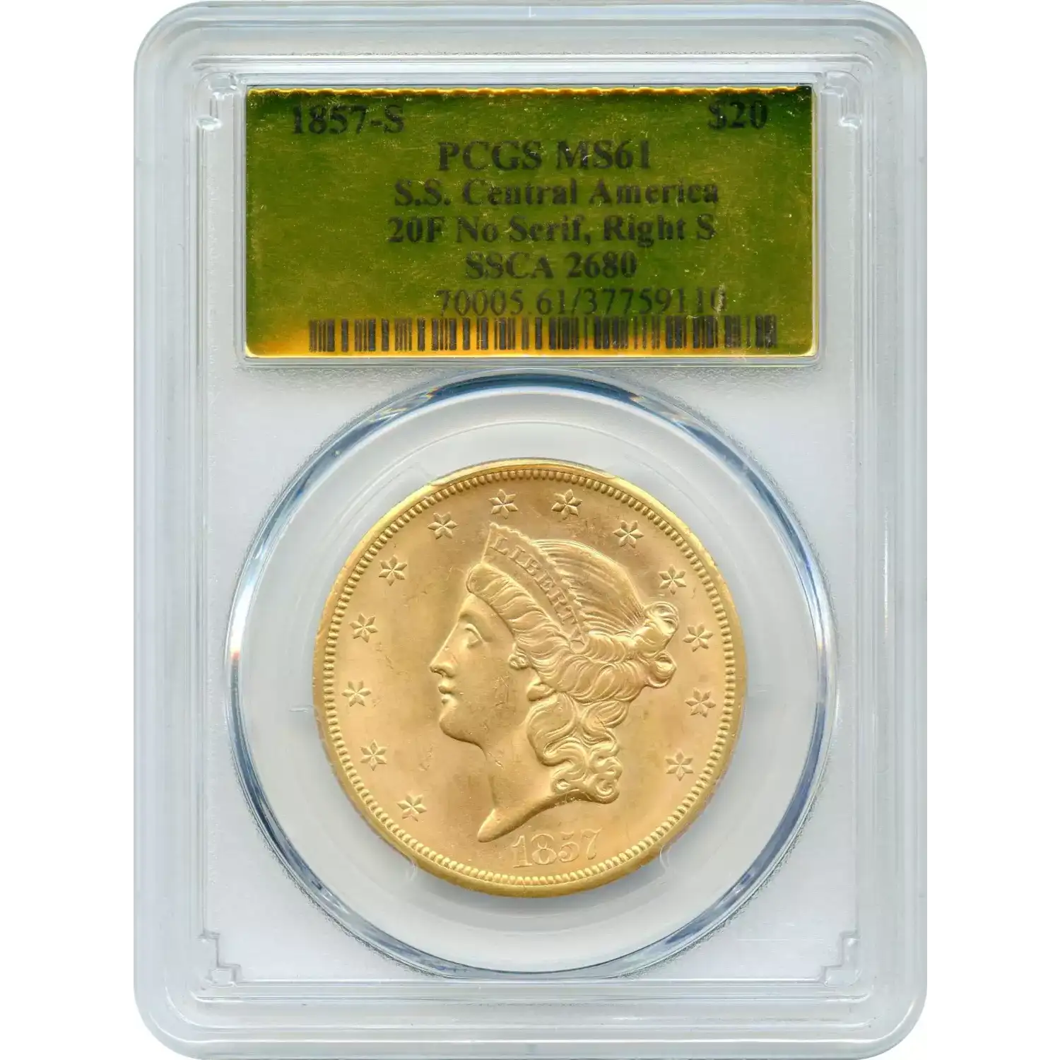 Ex.SS Central America. Of the 5,311 examples of the 1857-S $20 certified by PCGS from the first recovery, a mere 258 are of this "20F, No Serif, Right S" variety. That's almost 5% of the initial recovery. During the second recovery (c.2014), NO EXAMPLES of the 20F variety were added to the population report. We conclude these coins must have all been recovered together and most likely, all contained in the same receptacle when it went down. It's entirely possible that this was a single striking on a single day.