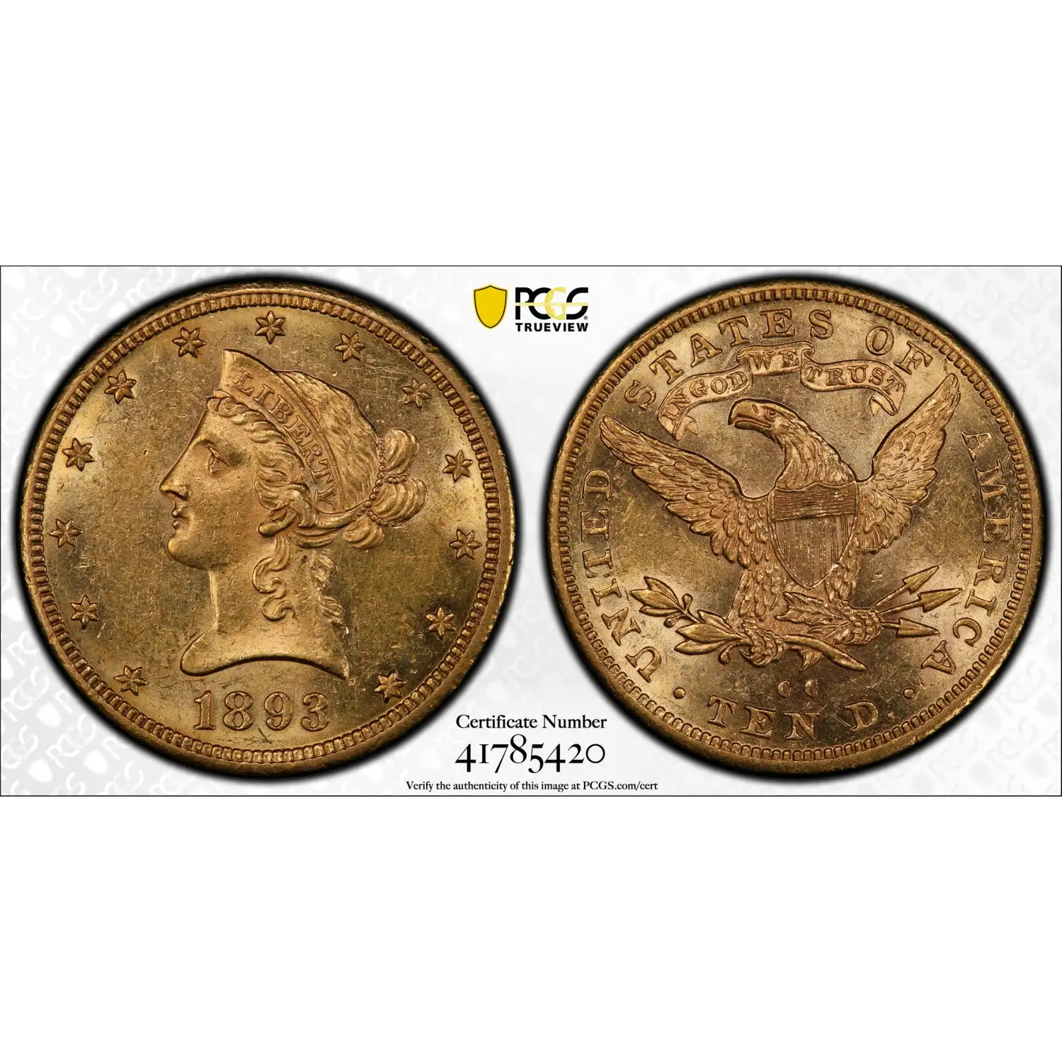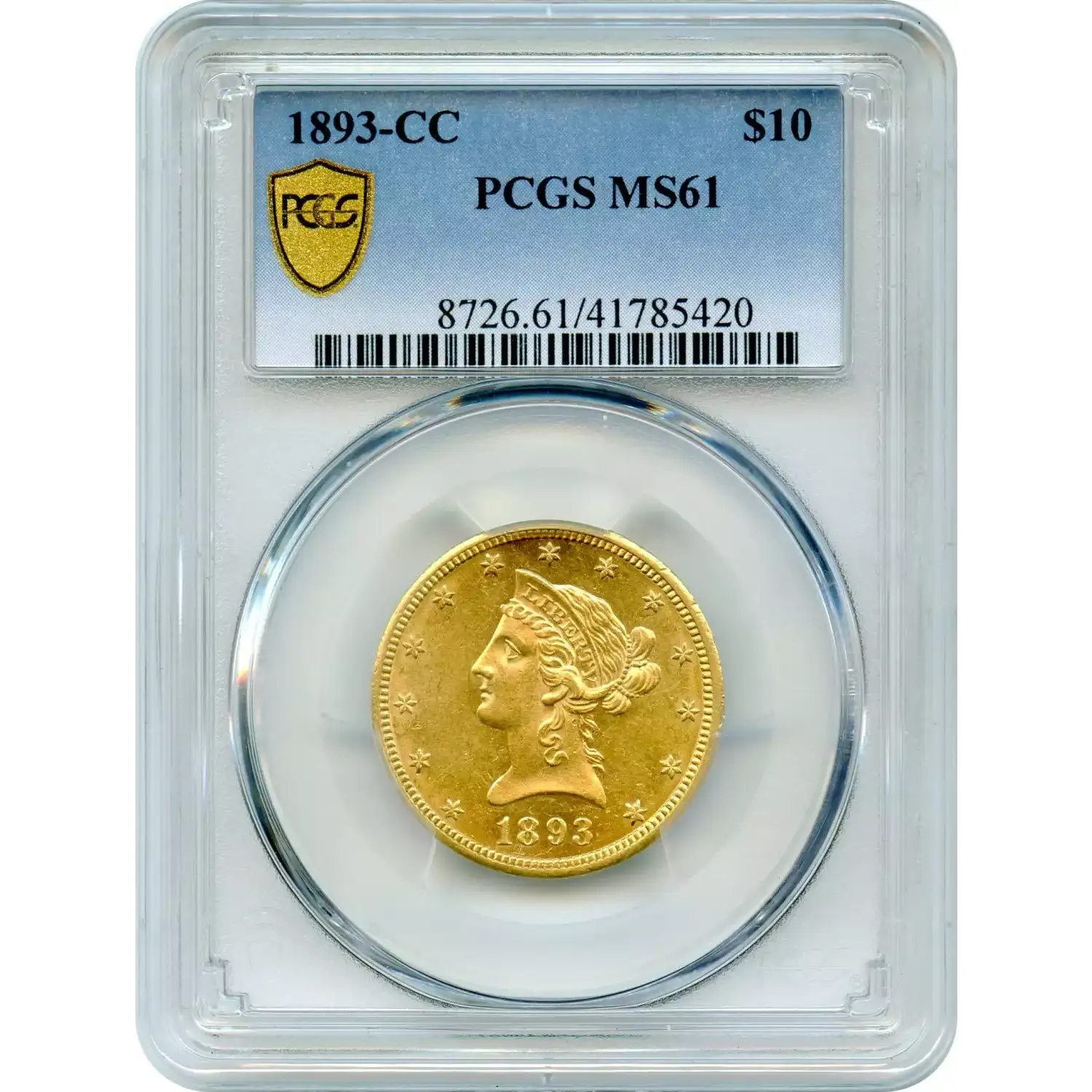 The 1893-CC $10 Liberty Head Eagle, graded PCGS MS-61, is an outstanding piece from the Carson City Mint, known for its limited mintages. The “CC” mintmark signifies its origin, tying it to the rugged, frontier-era West. Its MS-61 grade indicates a coin with full mint luster but minor surface marks, preserving its sharp details and bold strike.