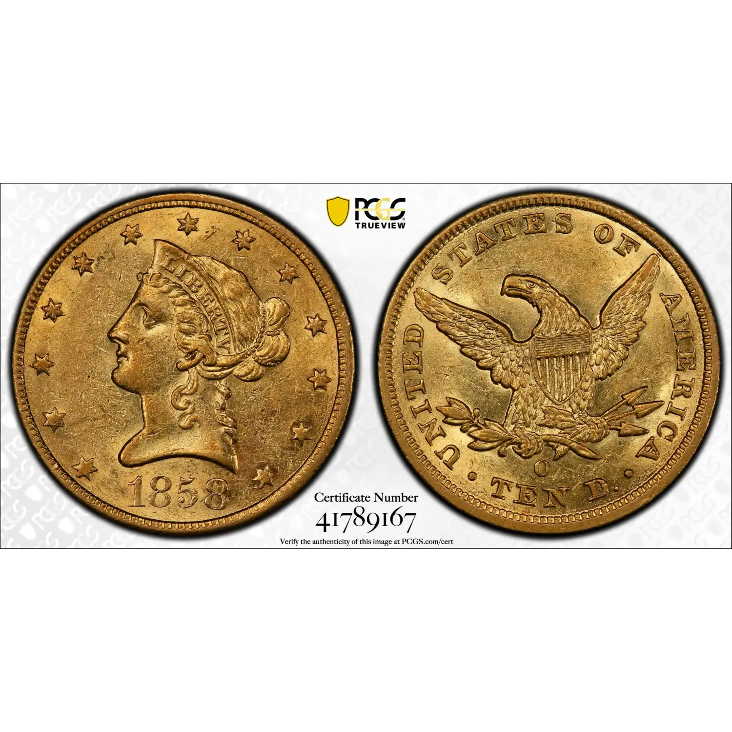 The 1858-O $10 Liberty Head Eagle, graded PCGS AU-58 with CAC approval, is a notable example of an American gold coin from the Antebellum period. PCGS has graded 22 as AU58 with 15 finer. In CAC, there are 7 in AU58 with 4 finer.