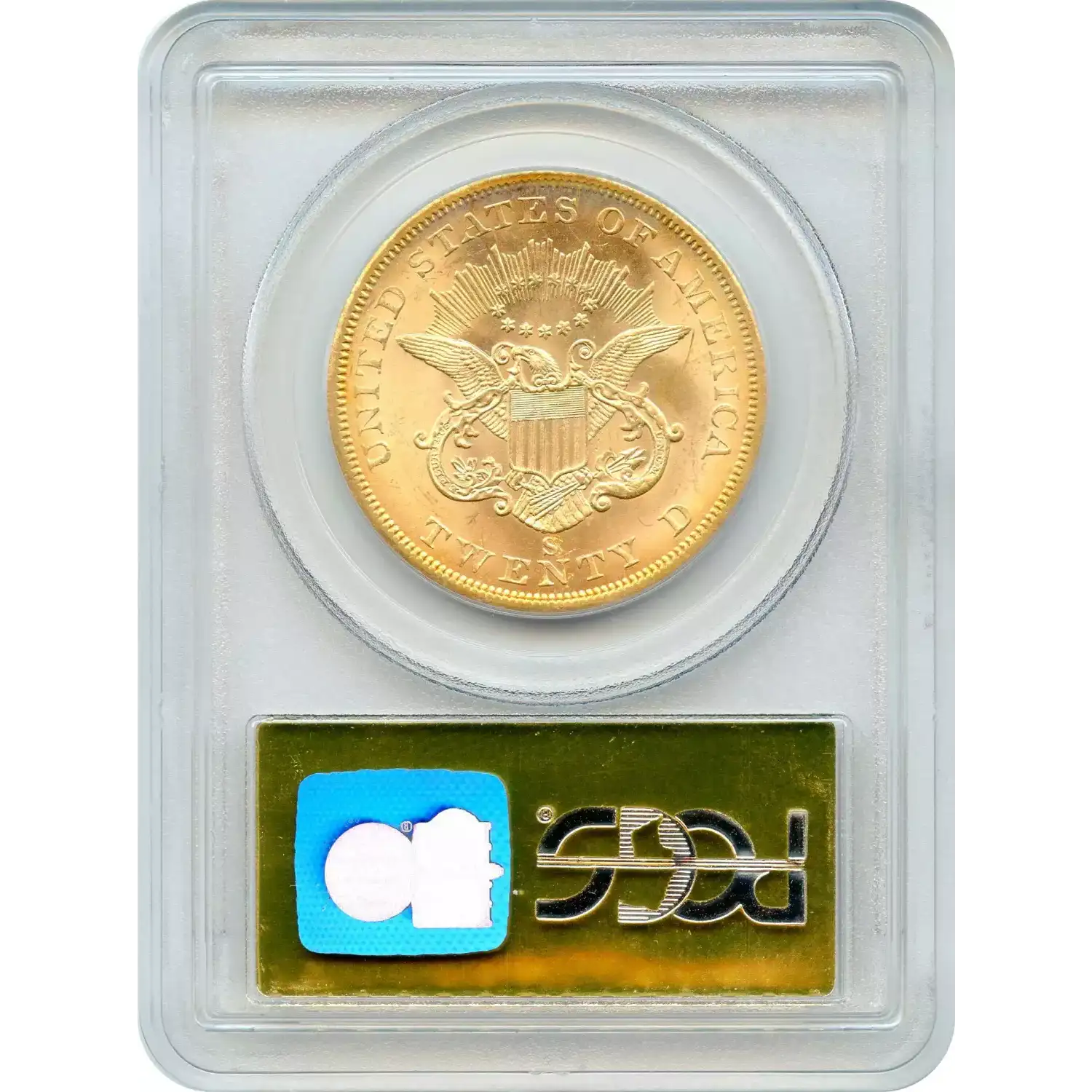 Ex.SS Central America, 20B variety with a bold "S" and with an original population of a total of 1,131 coins in all grades. In Choice Mint State-63 grade, the 2003 population report claimed 165 certified with the original gold foil (no barcode).