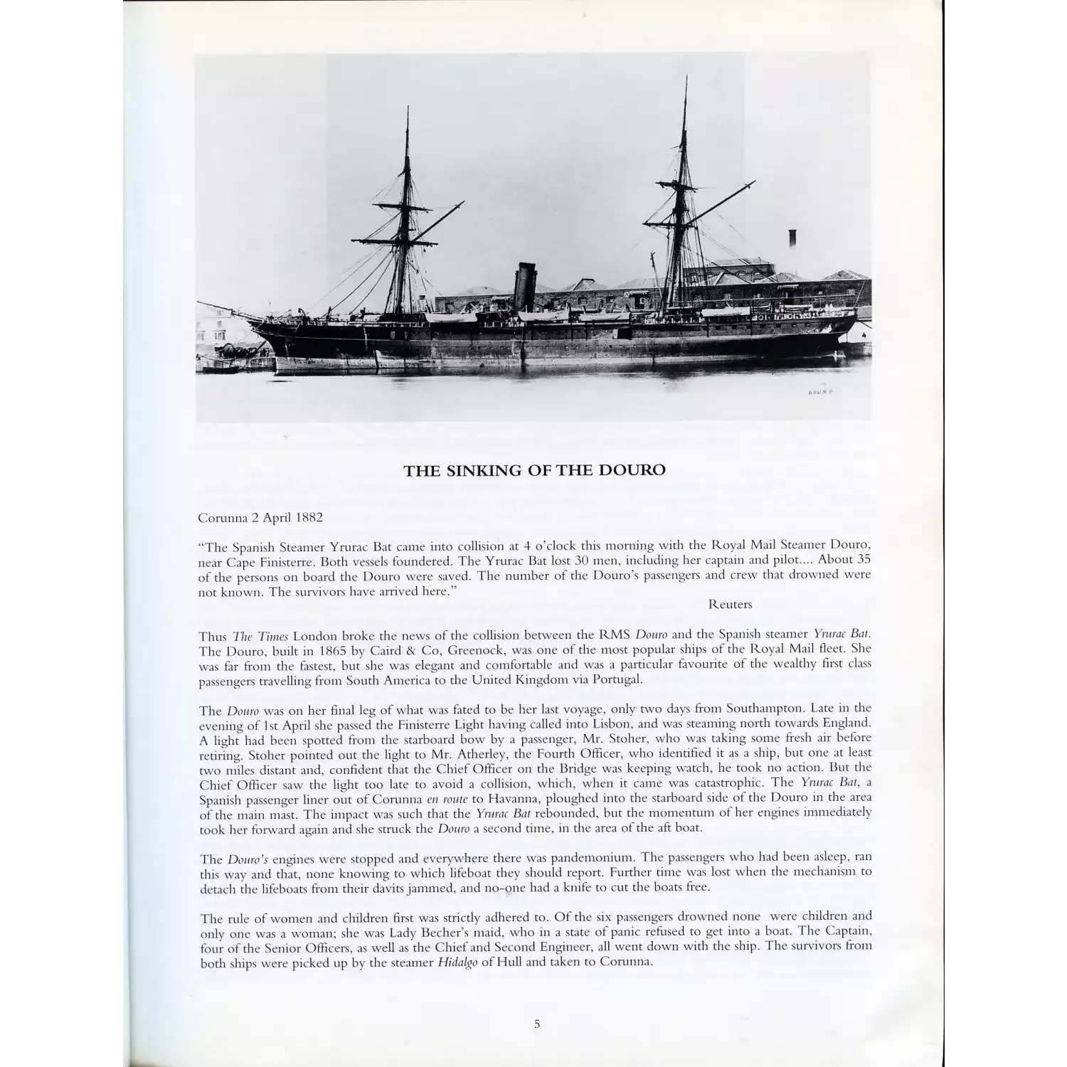 The RMS Douro was a British passenger liner operated by the Royal Mail Steam Packet Company from 1865 to 1882. Built in Scotland, the iron-hulled steamship was known for its luxury, speed, and reliability, accommodating 313 passengers and 80 crew. It initially served UK-West Indies routes before switching to Southampton-Buenos Aires in 1869, carrying mail, newspapers, and valuable cargo like gold. On April 1, 1882, it sank after colliding with the Spanish steamer Yrurac Bat off Cape Finisterre, resulting in six crew deaths. Its gold treasure was recovered in 1995.