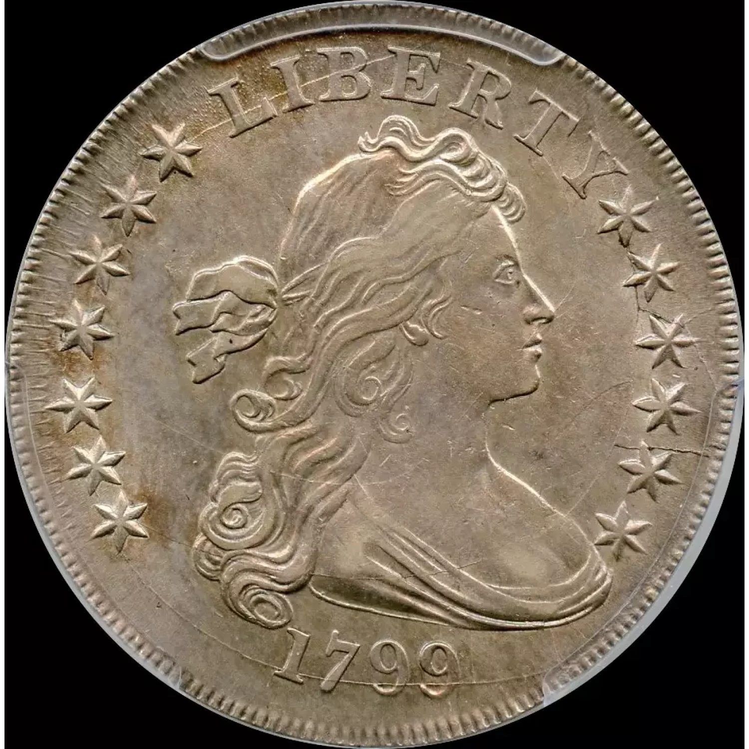 The coin exhibits BB Die State II, a near-terminal state with extensive obverse die cracks. The 15-star reverse is a captivating numismatic tale. During engraving, the die maker mistakenly added extra stars to the top and middle rows, resulting in 15 stars instead of the intended 13. To correct this error without discarding the costly die, the engraver cleverly extended two clouds to cover parts of the extra stars along the eagle’s wings, creating a distinctive and cherished variety in the early dollar series. This coin is the only example of its variety graded AU-58 by PCGS, making it a true standout for collectors.