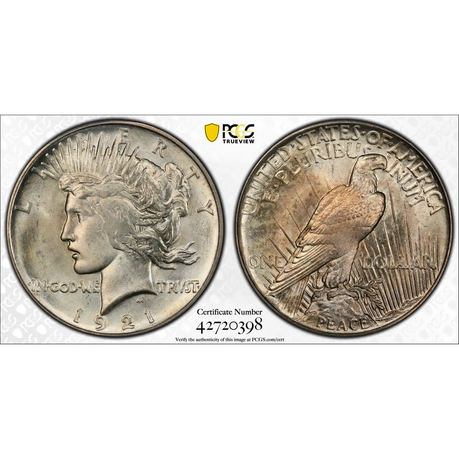 Upon its release, a newspaper in Philadelphia wrote, “Liberty is getting younger. Take it from the new 'Peace Dollar,' put in circulation yesterday, the young woman who has been adorning silver currency for many years, never looked better than in the 'cart wheel' that the Philadelphia Mint has just started to turn out. The young lady, moreover, has lost her Greek profile. [Hellenic] beauty seems to have been superseded by the newer 'flapper' type."| Product ID | 555770 |