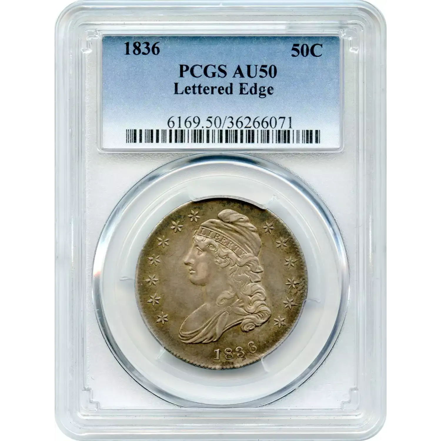 The 1836 Capped Bust Half Dollar marks the final year of the classic Lettered Edge design introduced in 1807. PCGS has graded 232 as AU50 with 965 finer.