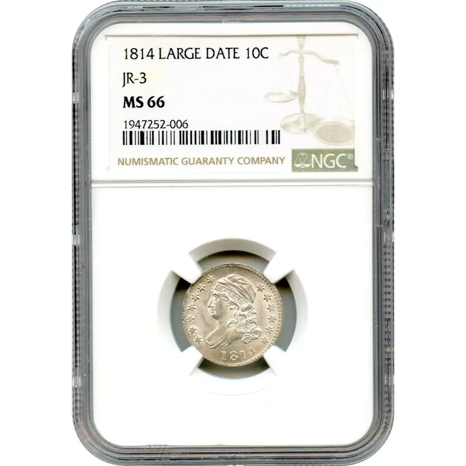 The 1814 Capped Bust Dime, graded NGC MS-66 JR-3 with a Large Date, is a stunning example of early American silver coinage. Designed by John Reich, this dime features a Liberty portrait with a Phrygian cap and a dramatic eagle on the reverse. The JR-3 variety, identified by its large date, is one of several die varieties from the 1814 mintage of 421,500 at the Philadelphia Mint. An MS-66 grade indicates exceptional preservation, with brilliant luster and minimal imperfections.