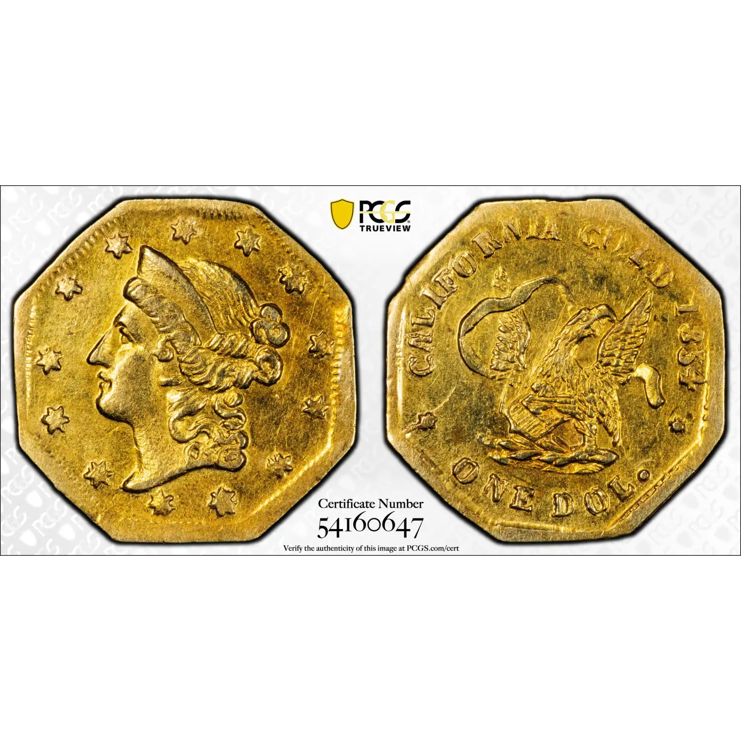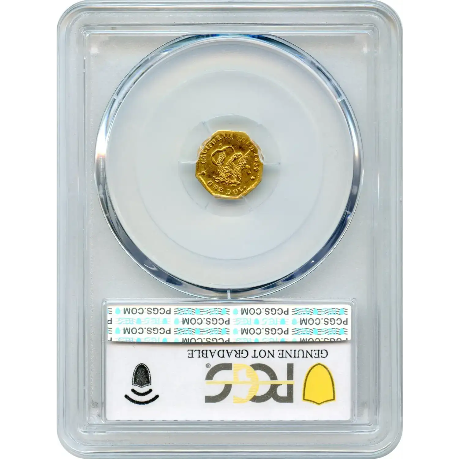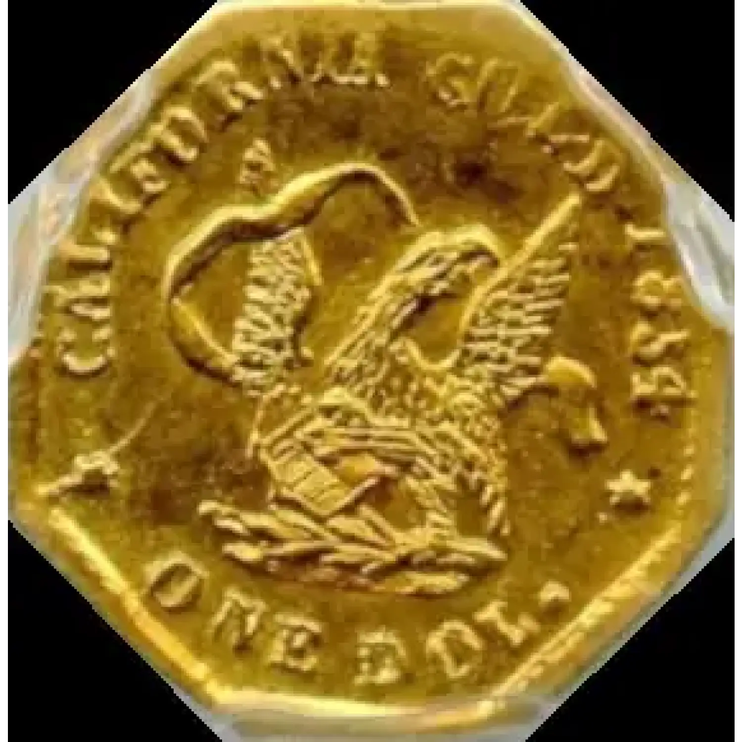 The coin's obverse features a coroneted Liberty Head, inspired by contemporary U.S. federal designs, encircled by 10 stars symbolizing California's place in the Union. The reverse showcases an eagle with outstretched wings, clutching arrows and an olive branch, which is a nod to the "Humbert" style from earlier pioneer gold pieces.