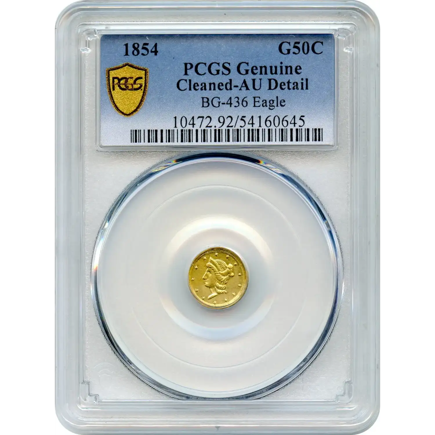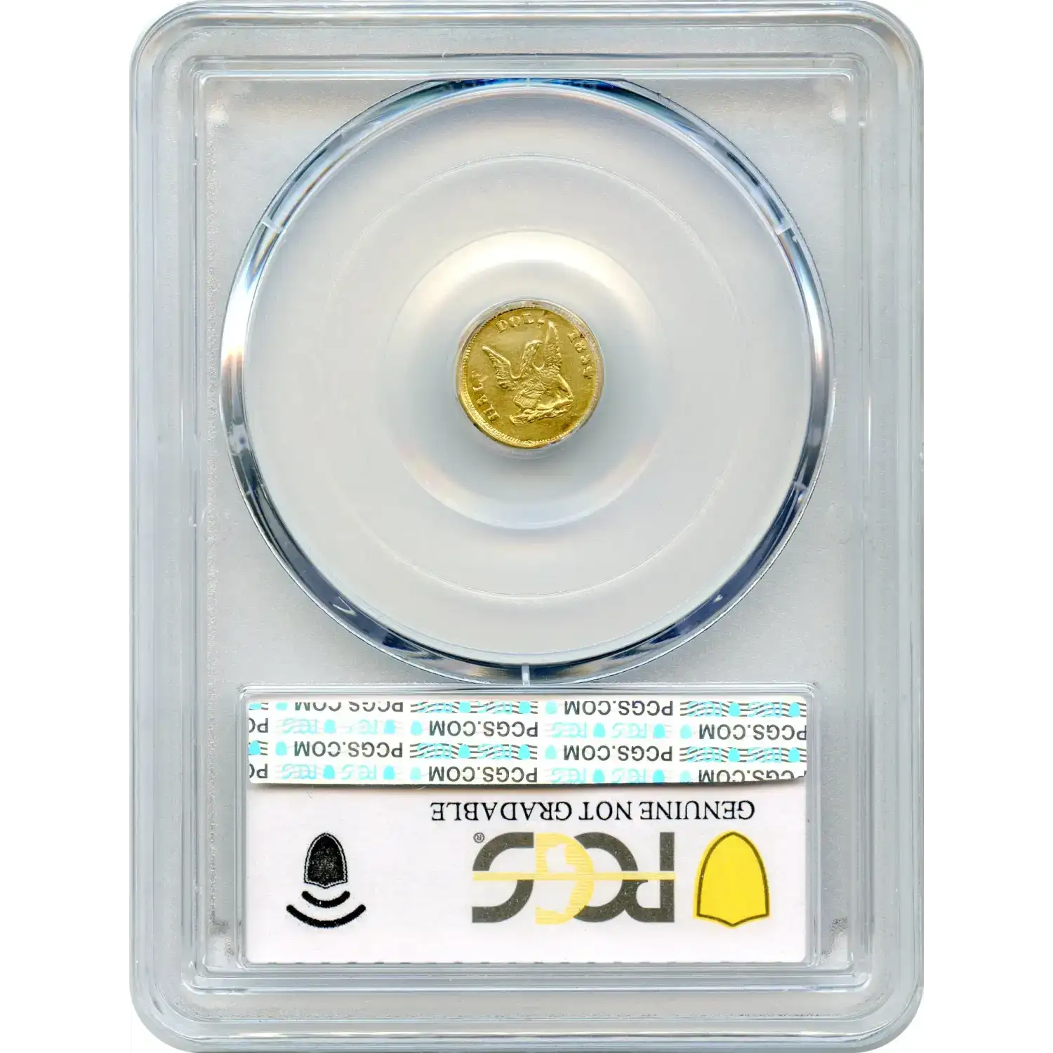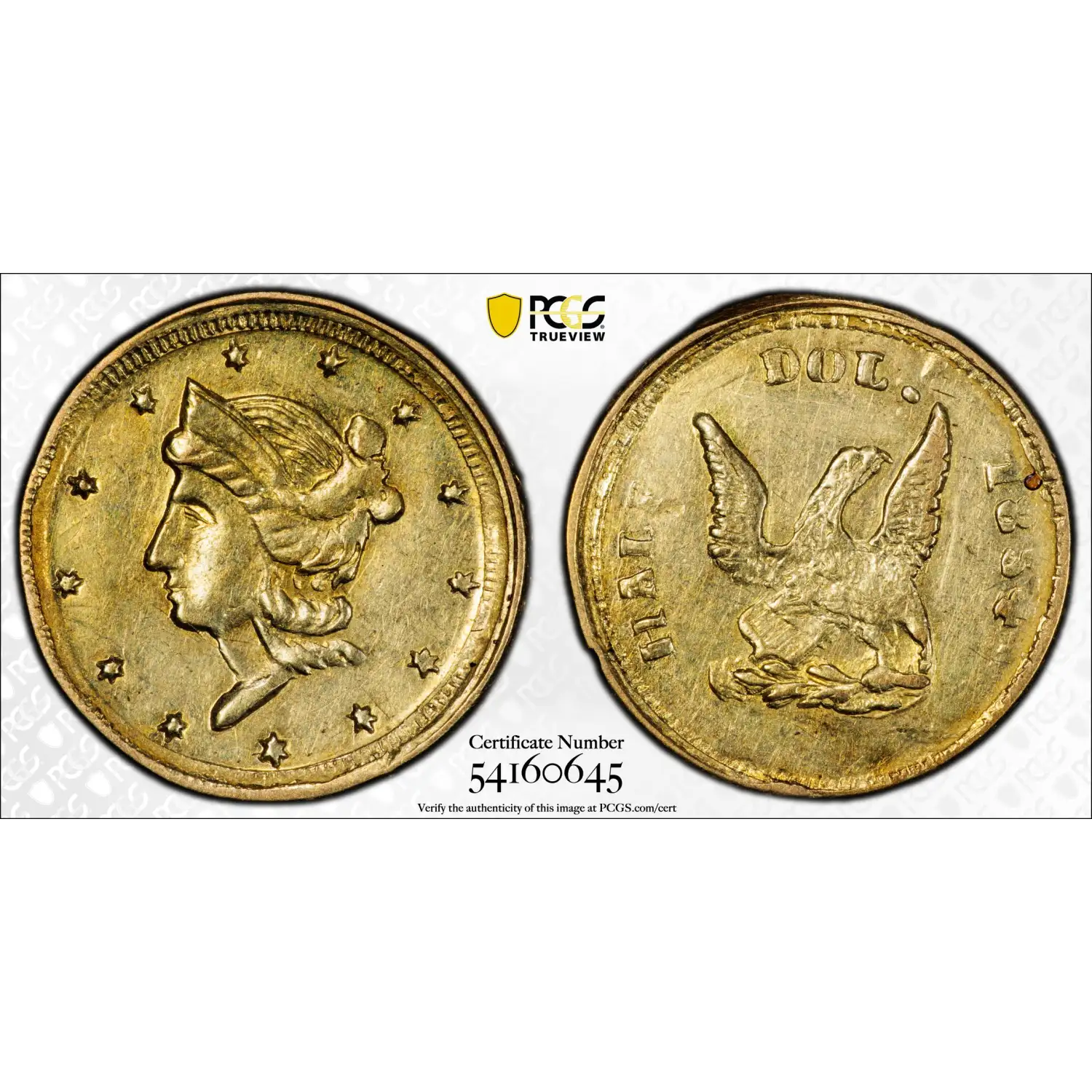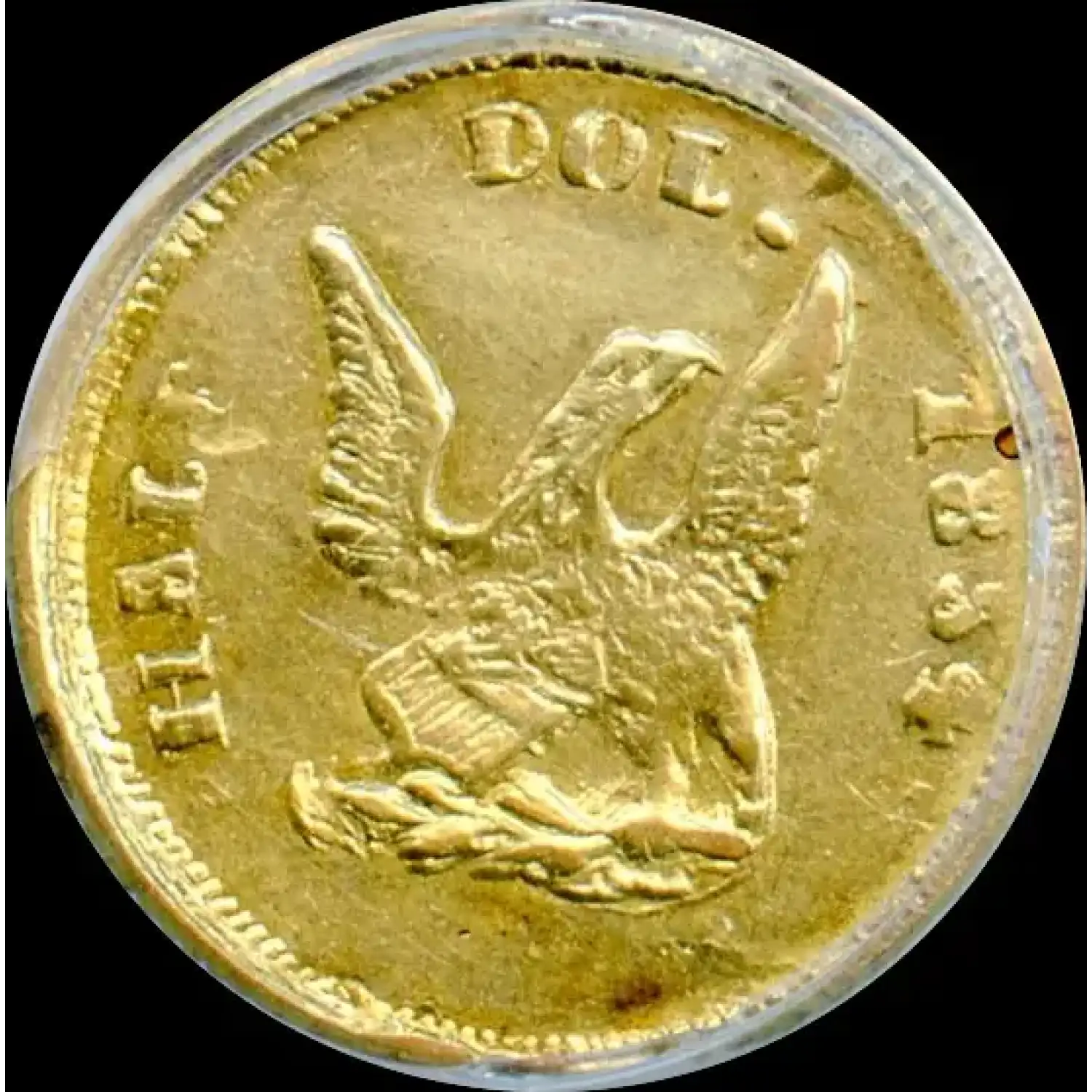 The rare BG-436 (R.6) is one of the few fractional gold varieties to portray the eagle from the Humbert fifty-dollar obverse, and the only such variety without the scroll (alternately called a ribbon or banner) about the eagle. The Liberty head and eagle exhibit an intermediate level of skill, and the Breen-Gillio standard reference ventures the engraver to be Auguste Dubois. The fact that PCGS has graded only 17 original pieces of this variety points to its rarity.