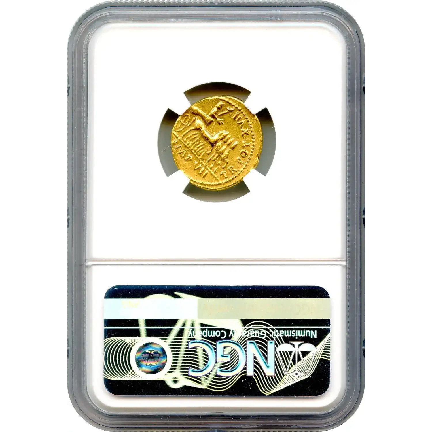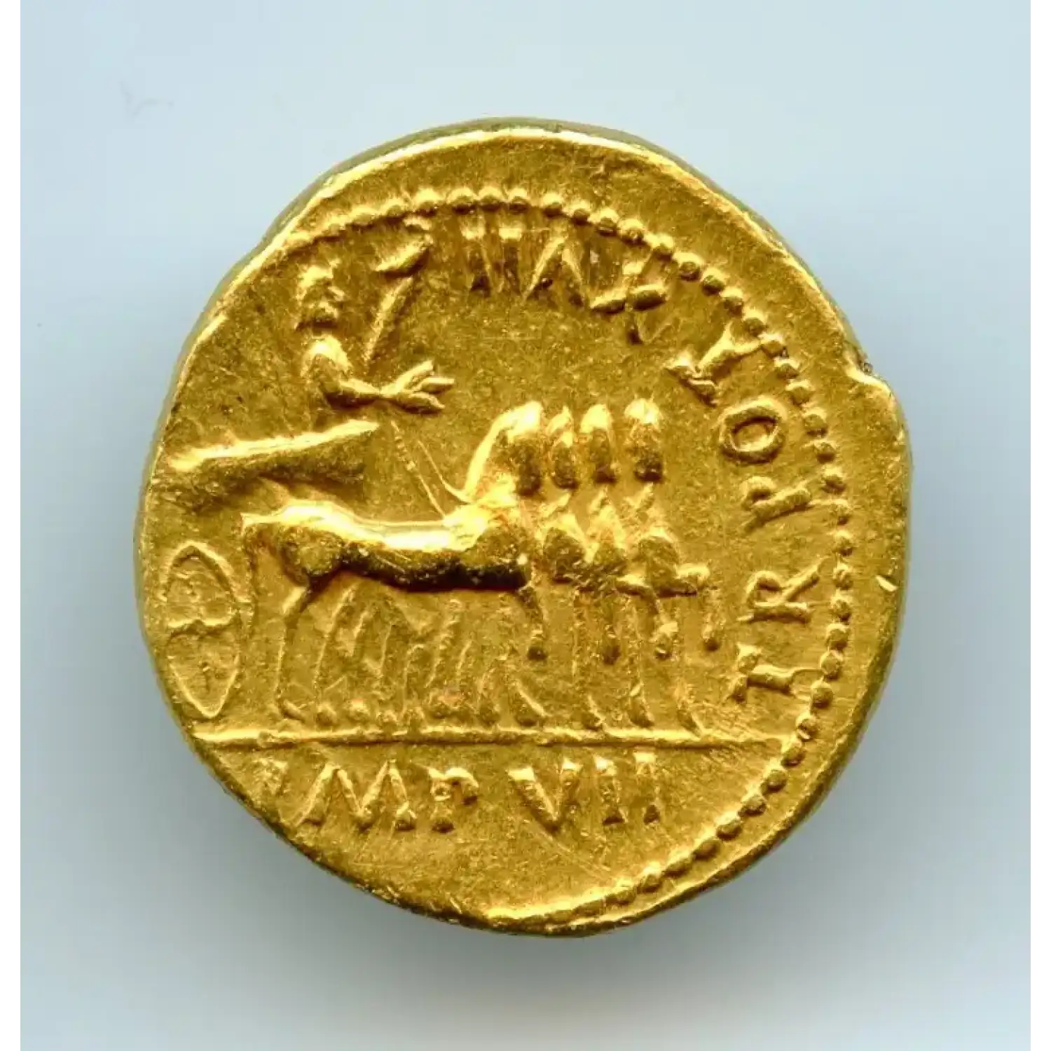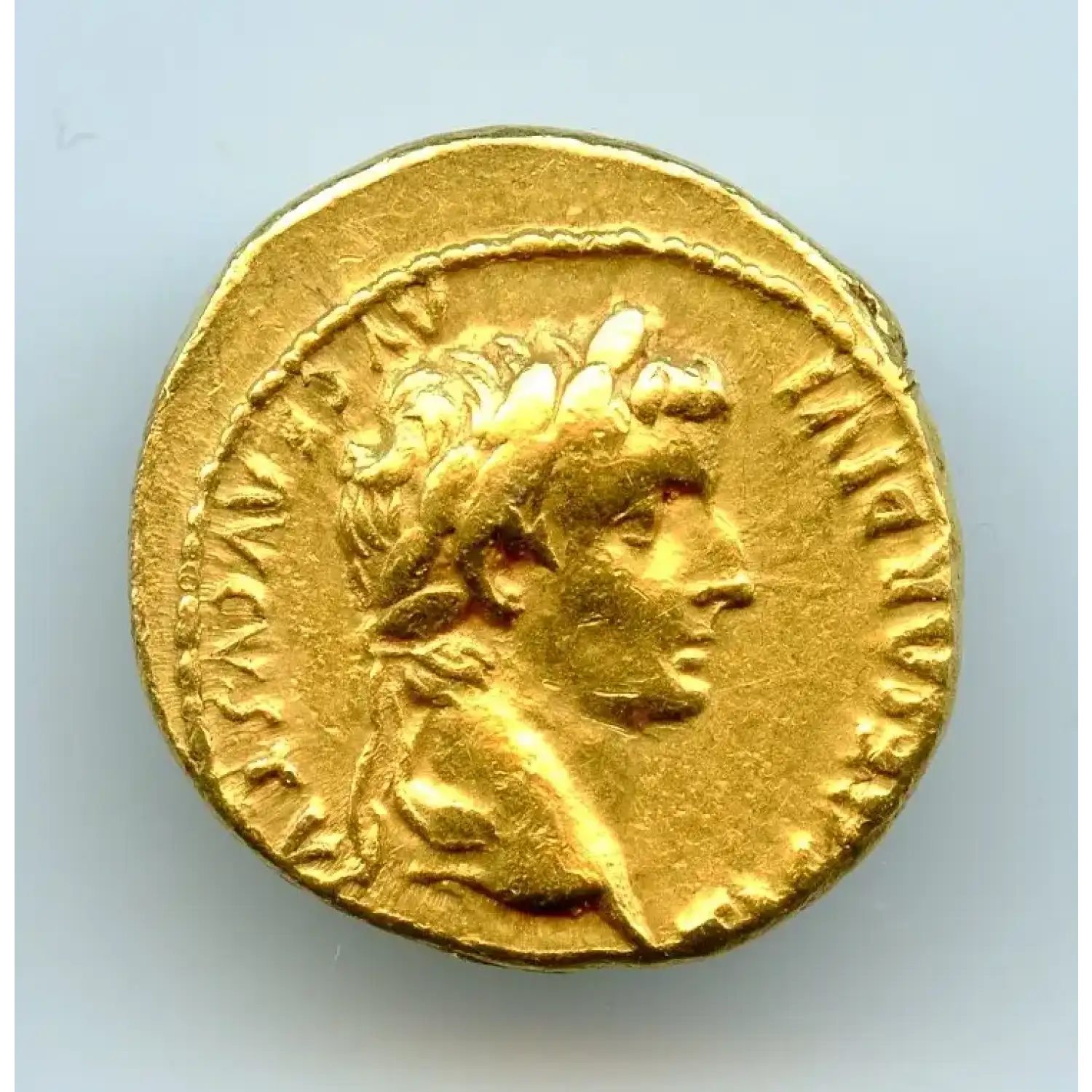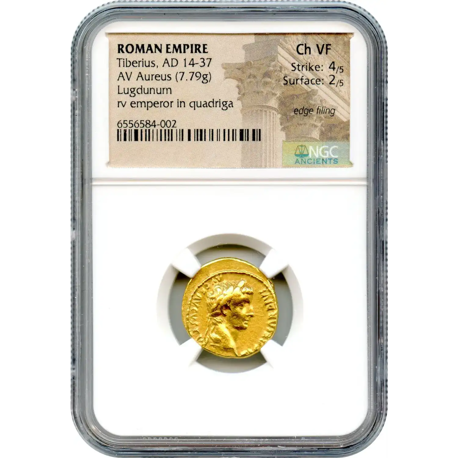 One of the "Coins of the Bible." Tiberius (AD 14-37). AV aureus (20mm, 7.57 gm, 11h). Struck at the Lugdunum mint at the beginning of his reign, AD 14-15. The obverse features TI CAESAR DIVI-AVG F AVGVSTVS, laureate head of Tiberius right. The reverse features TR•POT•XVI, Tiberius standing in triumphal quadriga right, laurel branch in right hand, scipio aquila in left, all four horses looking right; •IMP•VII• in exergue. RIC I 1. Calicó 307. This is a very scarce but popular design due to the reverse imagery. Well struck on bright flan. Light orange toning around the devices. Slighlty off-center obverse,