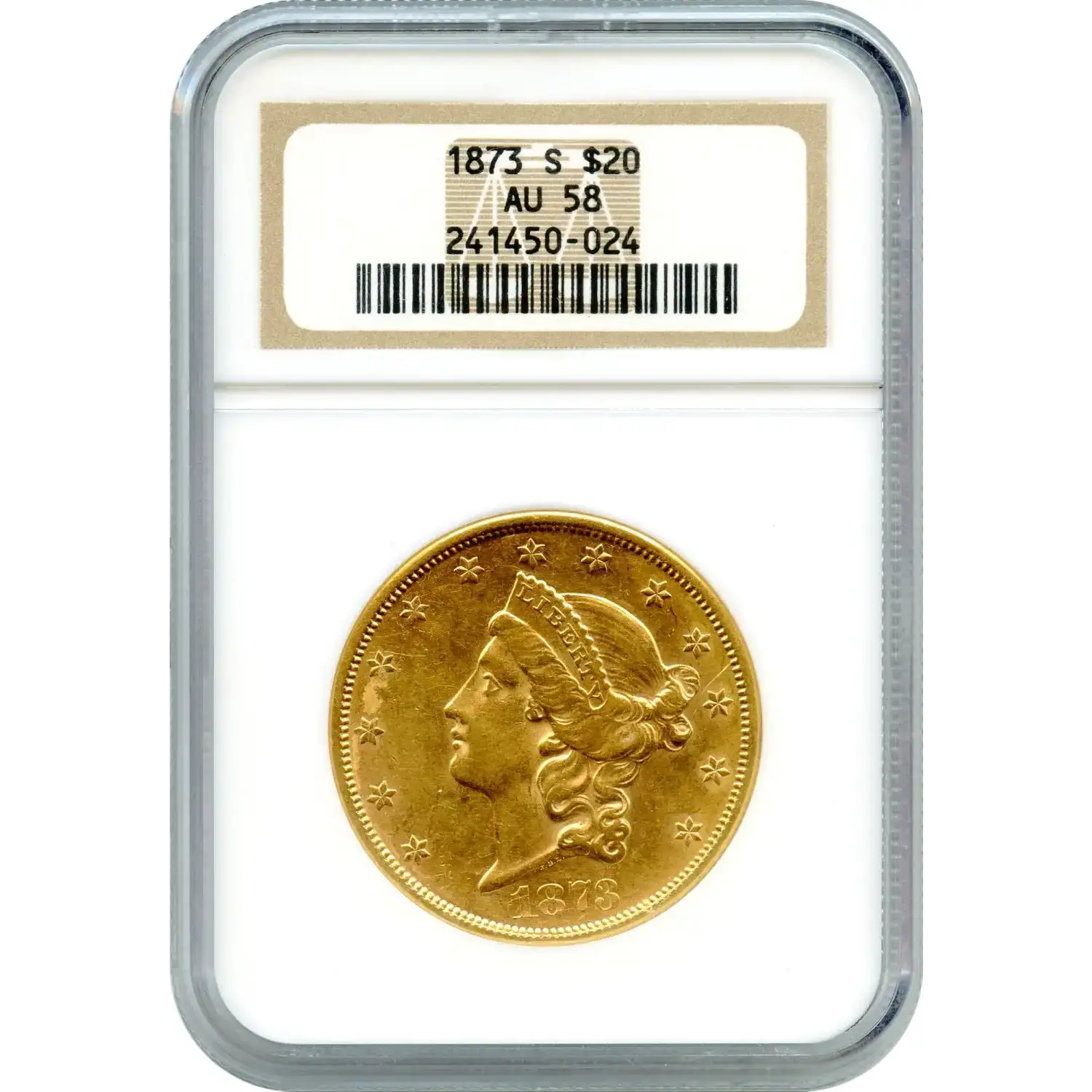 1873-S Open 3, is a Type 2 U.S. Liberty Double Eagle. Since the underlying spot gold market has accelerated recently due, in part, by the floundering US dollar, the premiums paid for scarce to very scarce $20 gold pieces like this have all but evaporated. For example, there are only 347 coins graded for this 1873-S $20 by NGC as AU58 with 123 finer (as uncirculated - finest being MS62). By comparison, the 1904 $20 gold piece - which sells for the same amount in this grade - has 1,125 coins graded by NGC as AU58 with 254,674 finer (as uncirculated - finest being MS67)