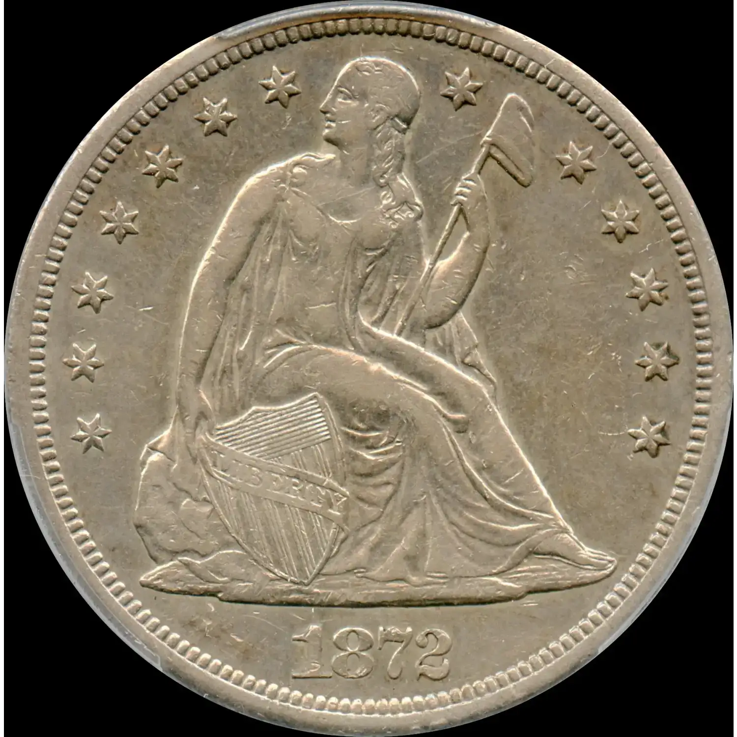 Minted during the post-Civil War Reconstruction period, this coin reflects the nation's economic recovery and westward expansion, as the San Francisco facility catered to California's gold rush boom. With a modest mintage of just 9,000 pieces, the 1872-S is one of the scarcest dates in the Liberty Seated dollar series (1840-1873), making it highly sought after by collectors for its historical significance and low survival rate.