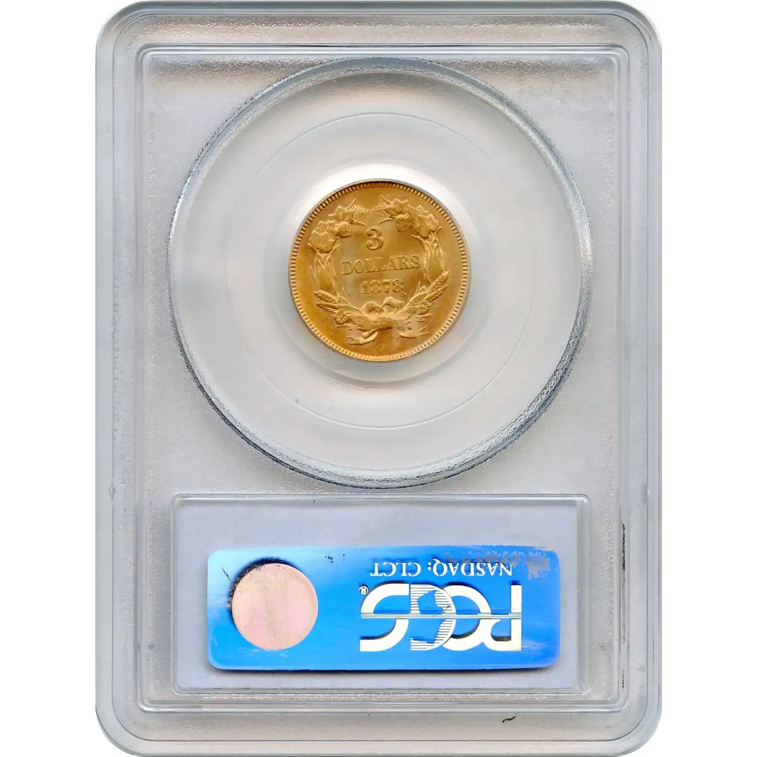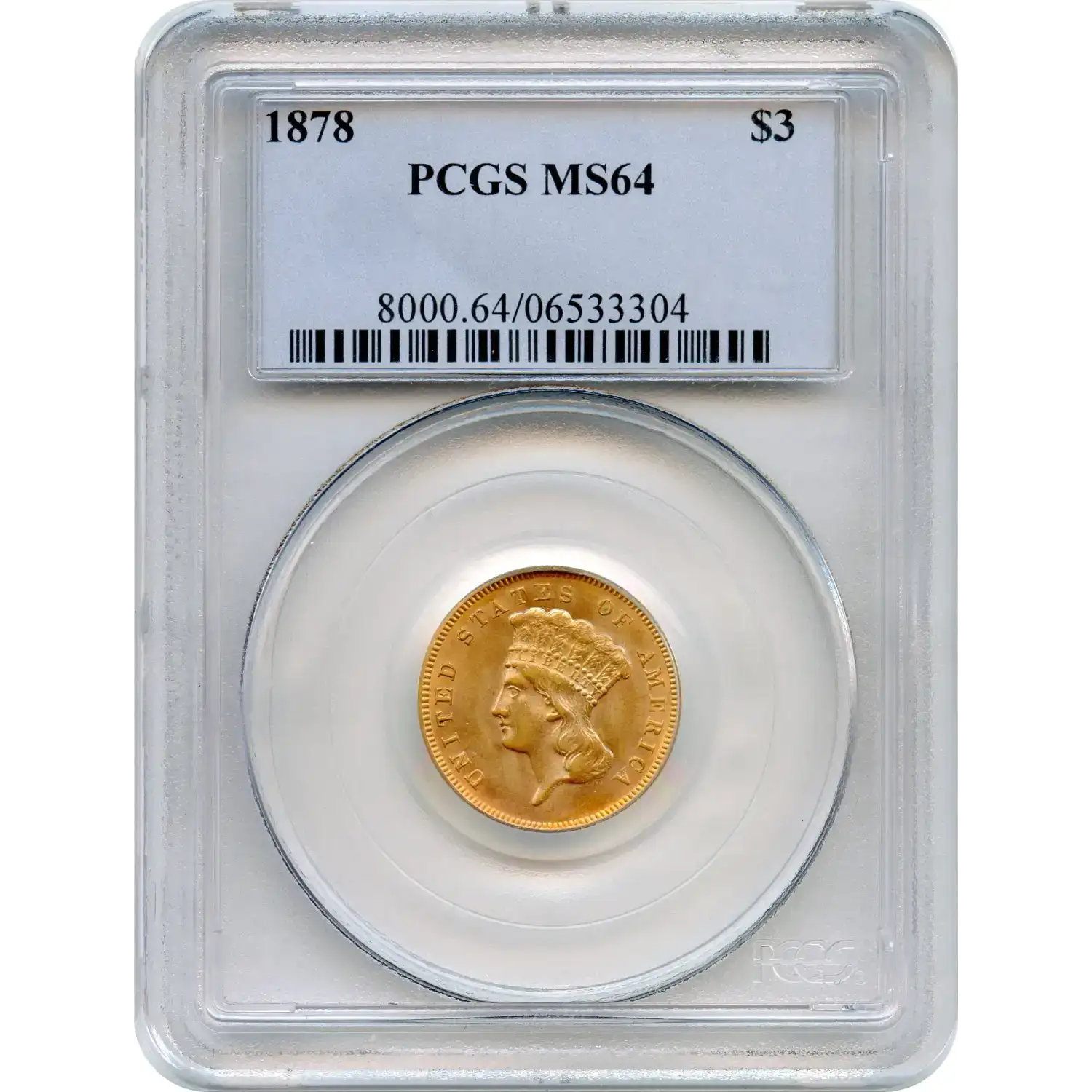 The 1878 $3 Indian Princess Gold Coin, minted in Philadelphia, features a design by James B. Longacre depicting Liberty as an Indian princess in a feathered headdress on the obverse, with a reverse showing "III" in a wreath of corn, wheat, tobacco, and cotton. With a mintage of 82,304 pieces, it was produced amid post-Civil War efforts to bolster gold reserves for specie resumption, even though the denomination saw limited circulation.