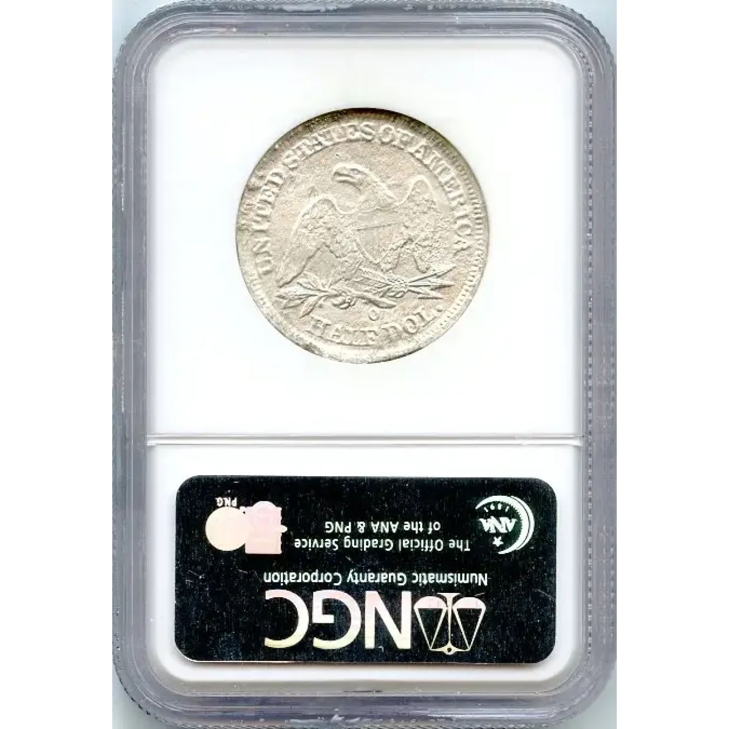 Shipwreck immersion profoundly alters silver coins through prolonged exposure to seawater. Saltwater accelerates corrosion, forming silver chloride crusts that adhere to surfaces, often obscuring details. On this half dollar, such encrustations appear as irregular white or gray patches, particularly in protected areas like lettering and recesses.