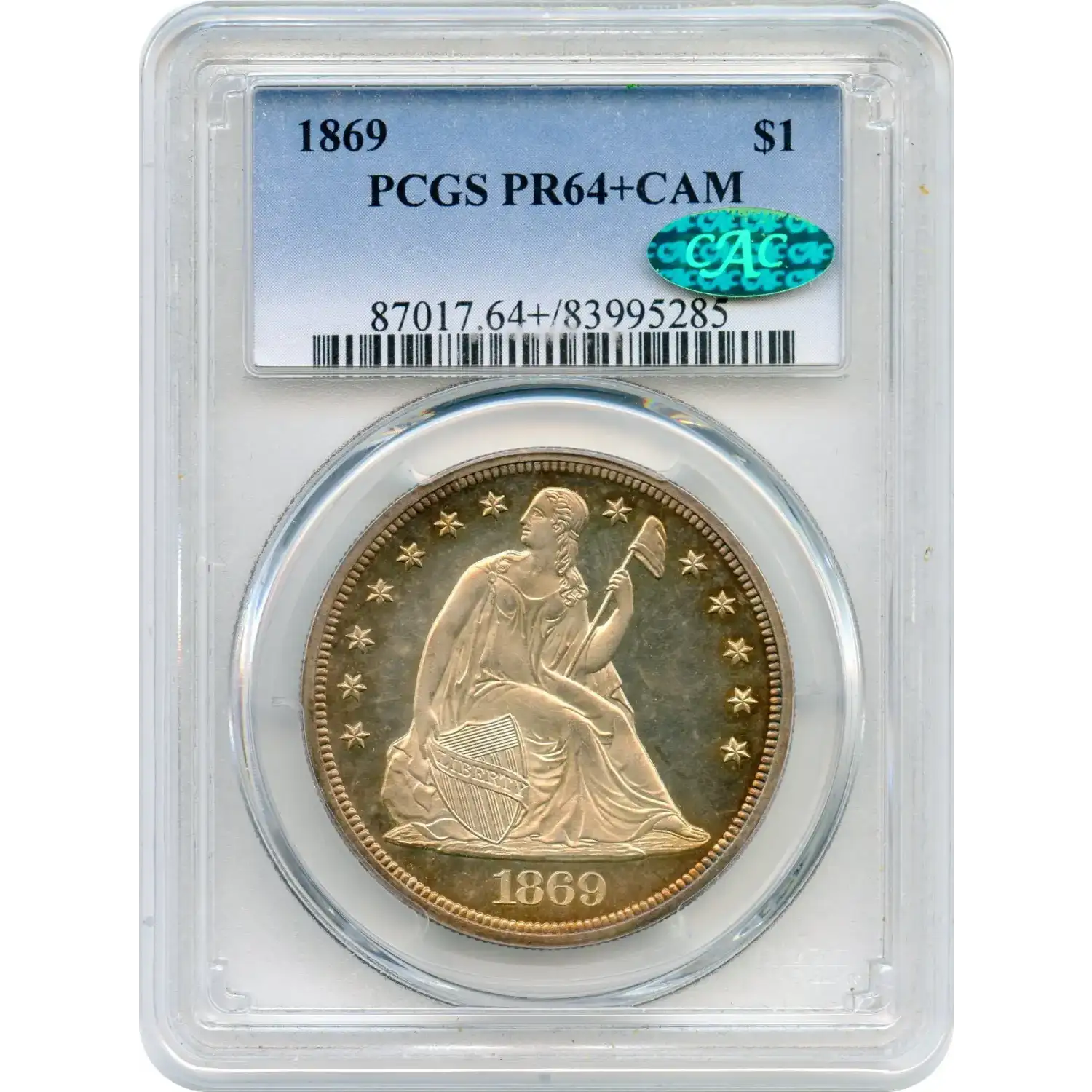 This specific specimen, graded PCGS PR-64+ Cameo, showcases the coveted "Cameo" contrast where frosted devices dramatically pop against mirrored fields, enhancing its visual appeal. The "+" designation indicates superior quality within the PR-64 range, while the green CAC sticker affirms exceptional eye appeal and value, as verified by the Certified Acceptance Corporation. Only about 20% of 1869 proofs exhibit Cameo effects, making this rarer than standard strikes.