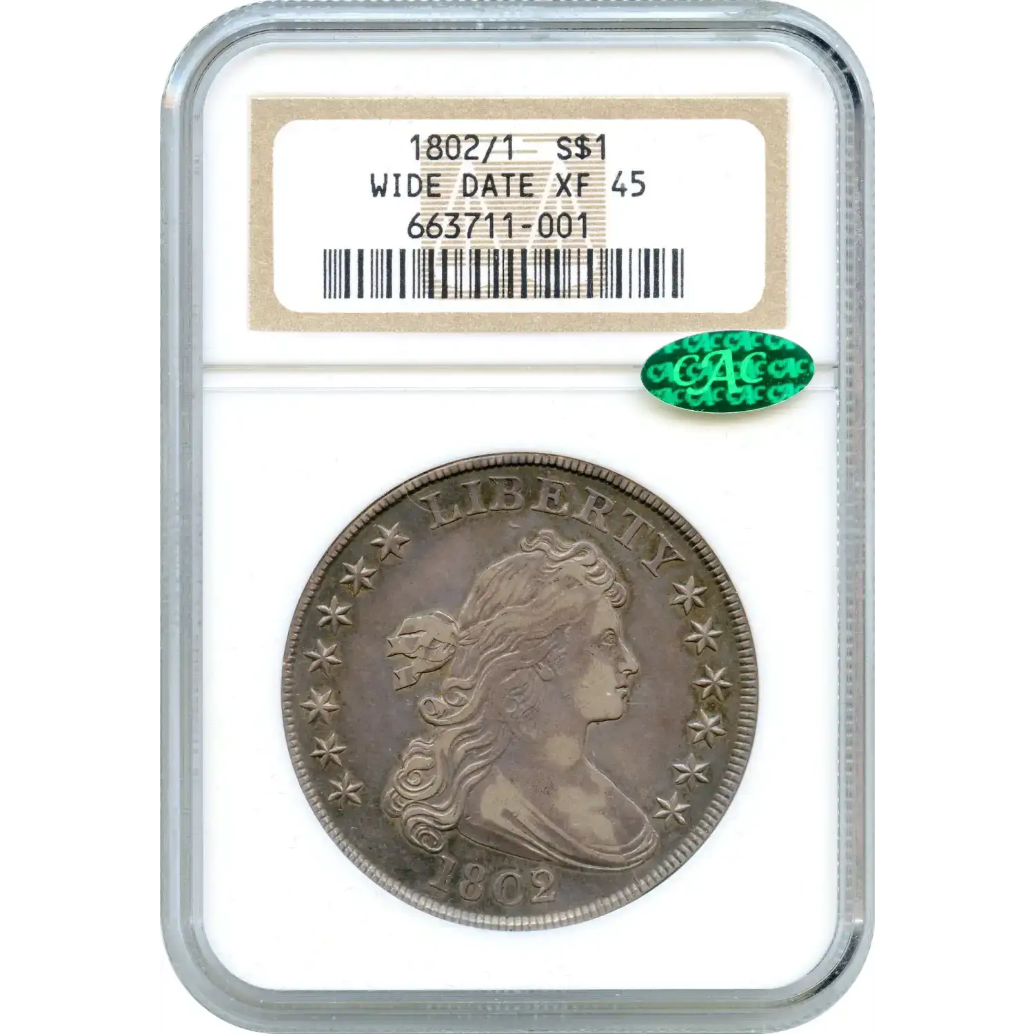 The 1802/1 Draped Bust Silver Dollar (BB-233, Wide Date) stands as a pinnacle of early American numismatics, struck at the Philadelphia Mint. NGC has graded 44 as XF45 with 59 finer. In CAC, there are 4 in XF45 with 7 finer.