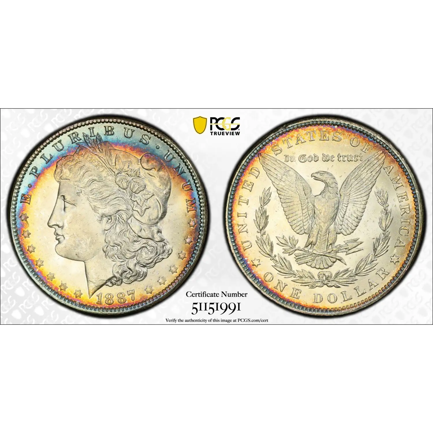 The 1887 $1 Morgan Silver Dollar, graded PCGS MS-66+ with CAC approval, is a standout example of one of the most iconic coin series in American numismatics. Designed by George T. Morgan, this silver dollar features Lady Liberty’s profile on the obverse and a heraldic eagle on the reverse, struck in 90% silver. The 1887 issue, minted in Philadelphia, had a high mintage of over 20 million, making it relatively common in lower grades but quite desirable in MS-66+ condition.