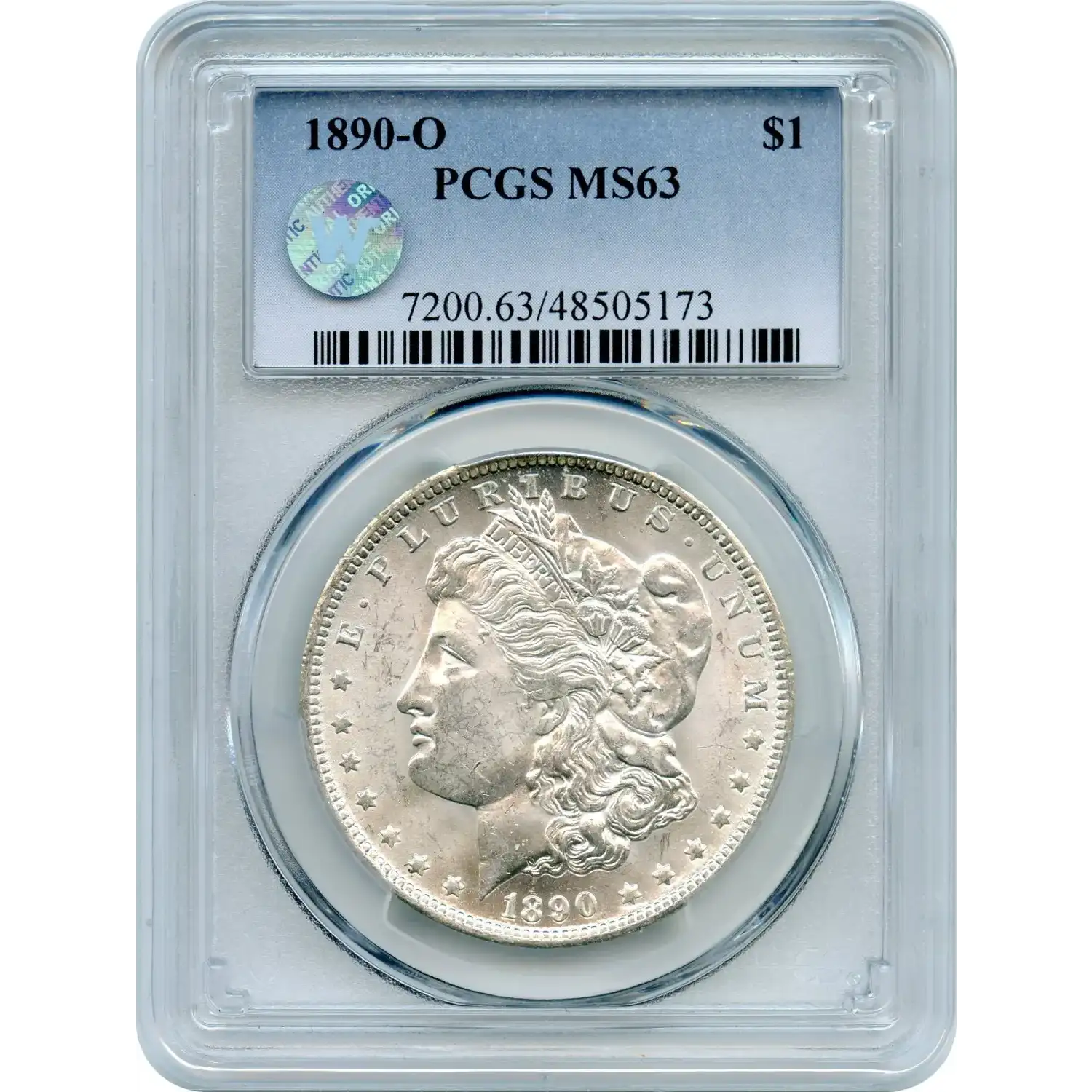 At MS-63, the coin shows typical light abrasions in the fields and slight weakness on Liberty’s cheek and the eagle’s breast feathers—common for the issue—yet retains sharp detail and crisp luster. It is an original 1890-O Morgan that stands out for its brilliant, unmarked appearance rather than extreme rarity or technical perfection.