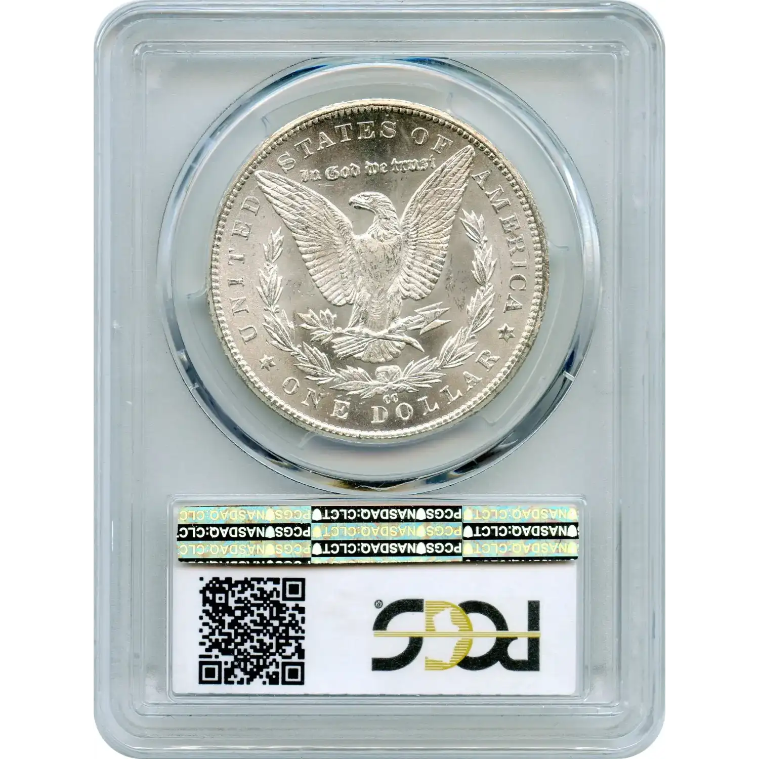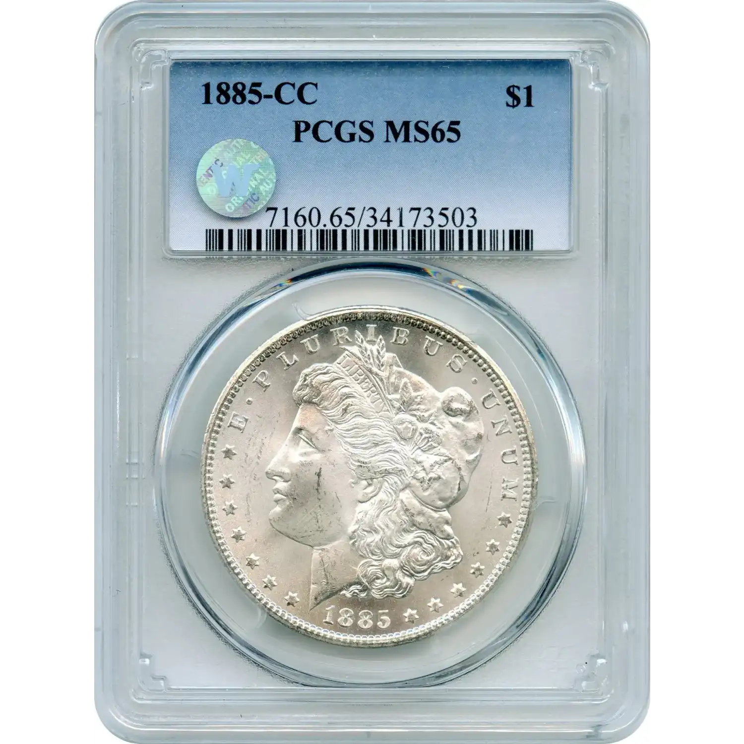 The 1885-CC Morgan Silver Dollar, graded PCGS MS-65 designated "Sight White," is a gem uncirculated example with blast white luster and exceptional eye appeal. PCGS has graded 4,712 as MS65 with 2,029 finer. Numismatic author Q. David Bowers writes of this coin: "Most examples are brilliant, lustrous, and attractive to the eye .... Most are well struck with brilliant, frosty lustre."