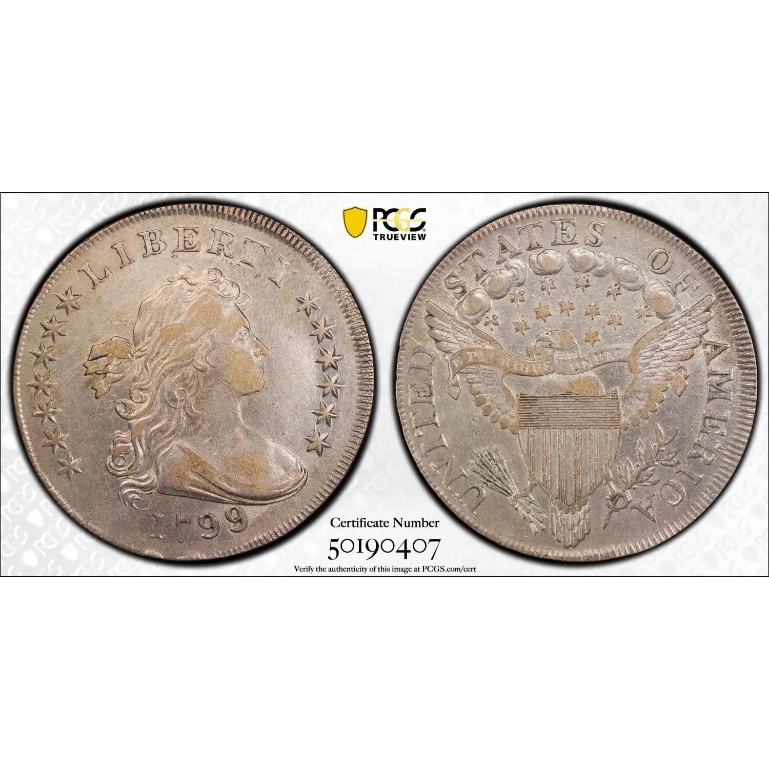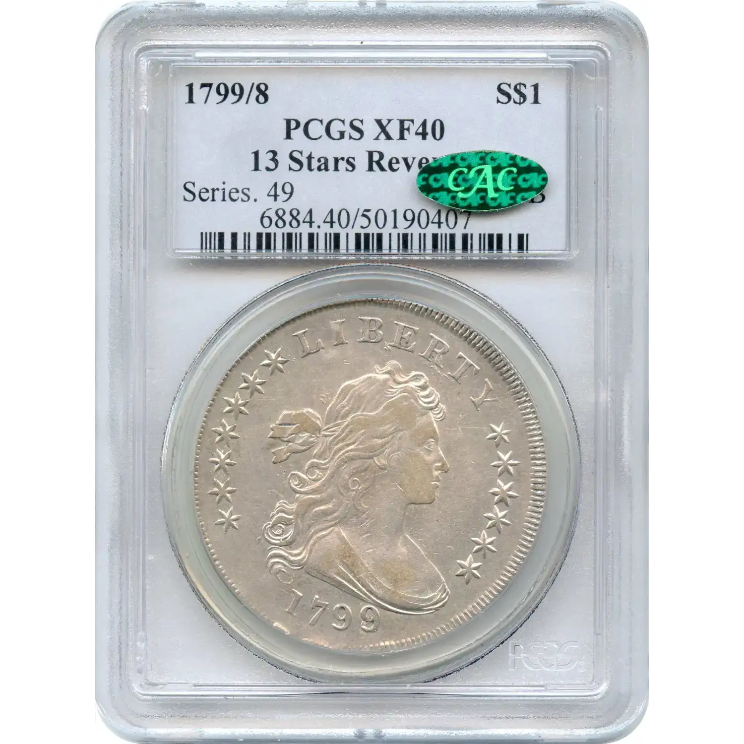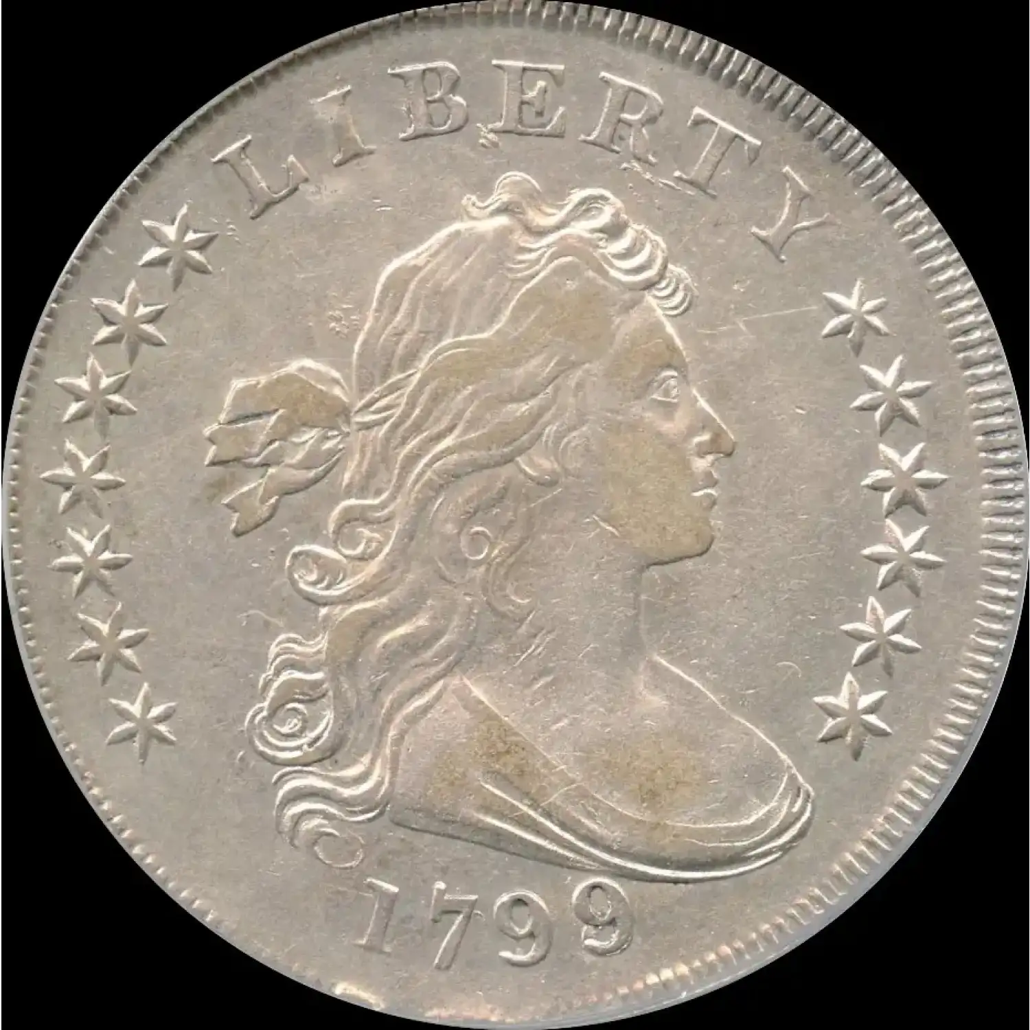 Minted at the Philadelphia Mint with an original mintage of 423,515 for 1799, there are few survivors of the BB-143. PCGS has graded only 15 examples of this rare variety. Of those, there is one in XF40 with just 5 finer. In CAC, there is one in XF40 with just one finer.