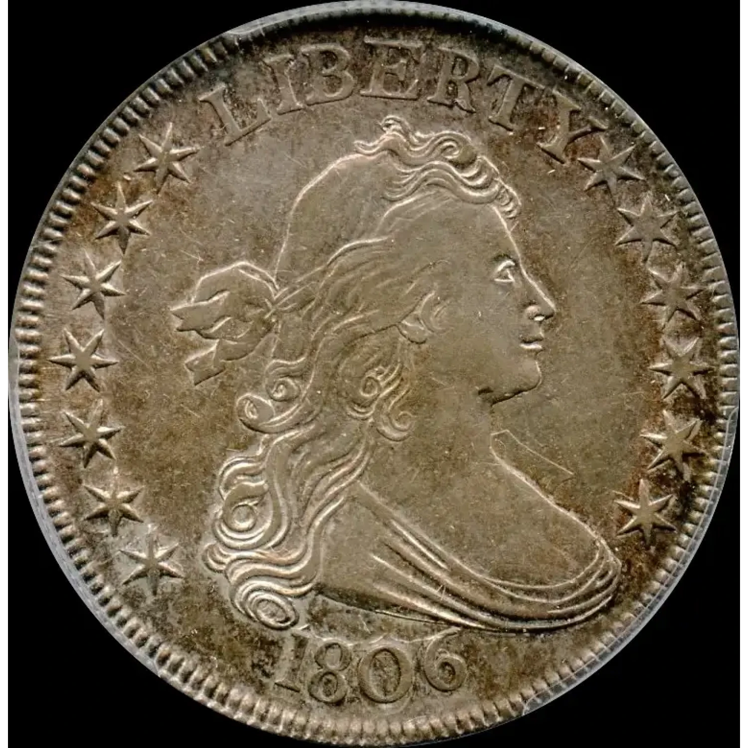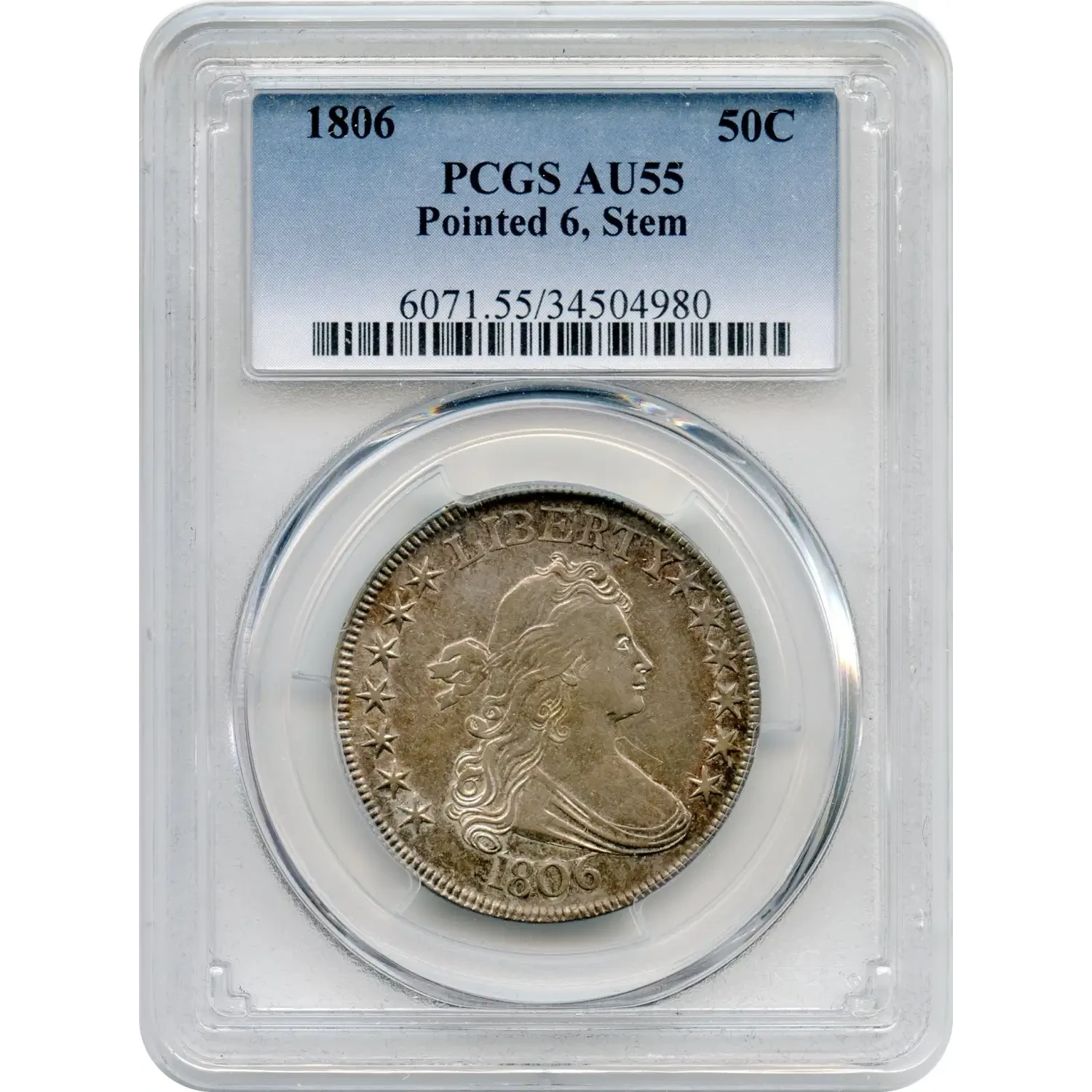 The 1806 Draped Bust Half Dollar, “Pointed 6, Stem” variety, represents a zenith of early American numismatic artistry. PCGS has graded 50 as AU55 with 102 finer. Collector’s Universe (CU) prices this issue at $5,750 in AU55. Therefore, you will save $1,100 off the CU price when you buy this coin!