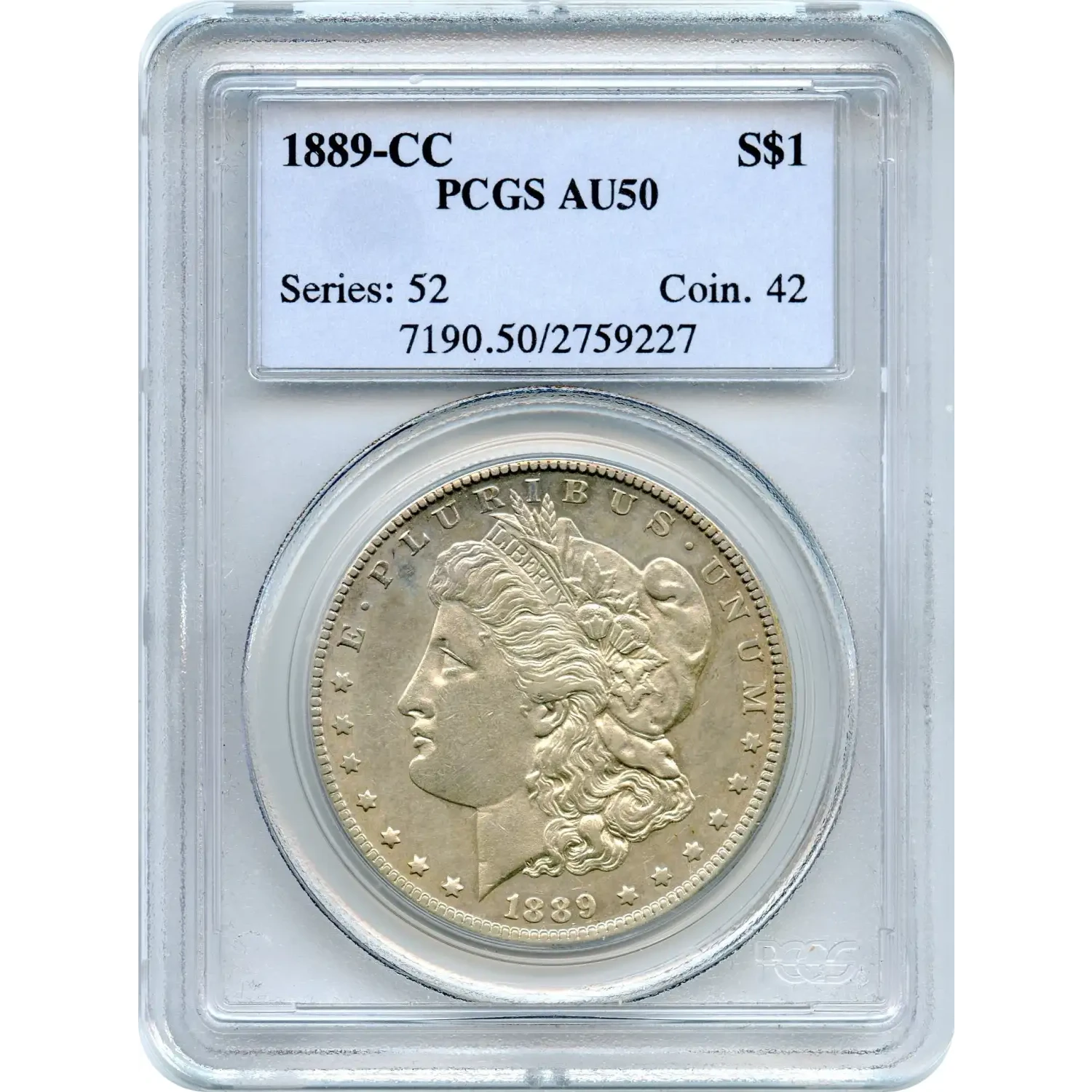 The 1889-CC Morgan Silver Dollar, minted at the Carson City Mint, stands as a numismatic treasure from America's Silver Rush era. The mintage of this key date was 350,000. PCGS has graded 368 as AU50 with 1,295 finer. Collector’s Universe (CU) gives this issue a price of $10,000 in AU50. Buy this coin and you will save $1,750 off the CU price!