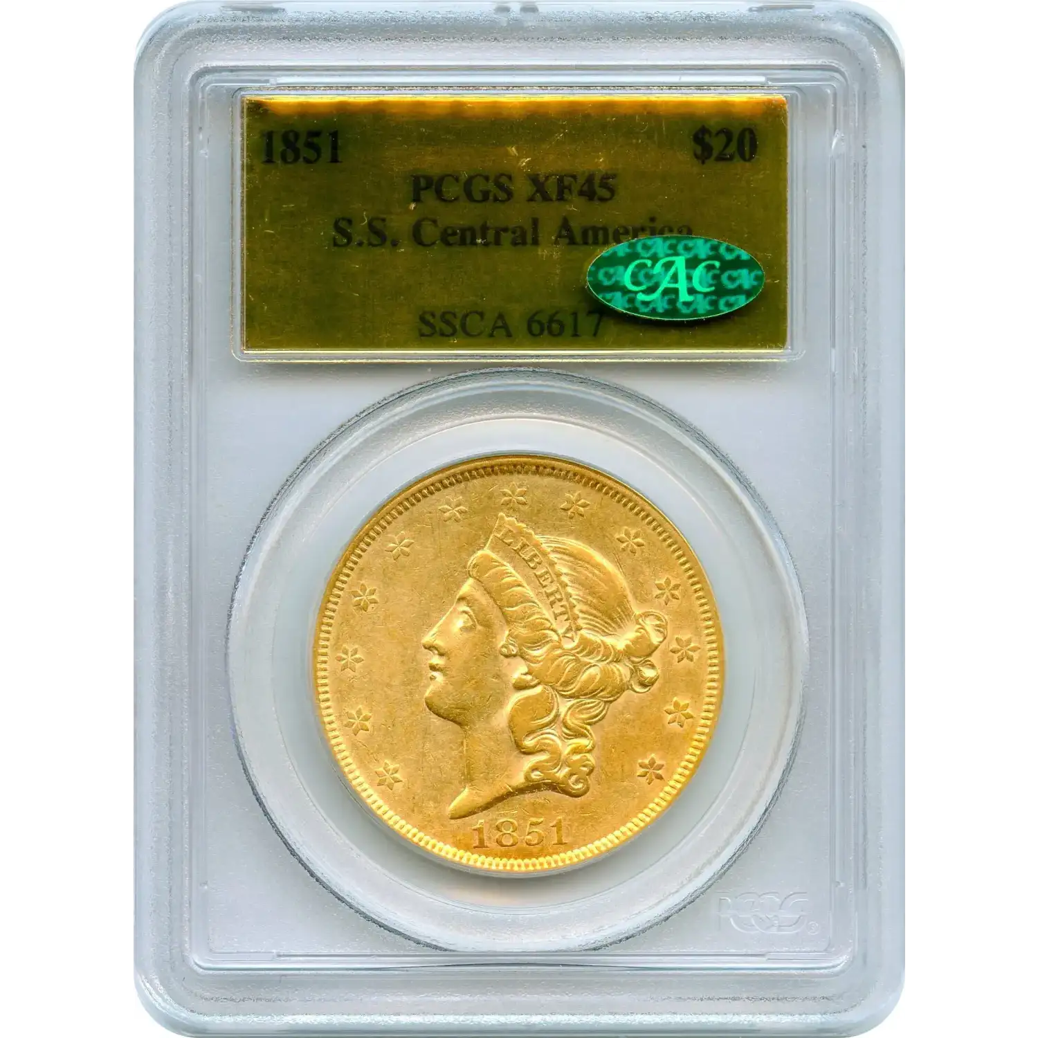 CAC. The 1851 $20 Liberty Head Double Eagle, the second issue of its series, emerged from the Philadelphia Mint during the California Gold Rush’s peak. Nearly an ounce of .900 fine gold, it bears Christian Gobrecht’s iconic design: Liberty in a coronet encircled by thirteen stars on the obverse, and a majestic heraldic eagle clutching arrows and olive branch on the reverse.