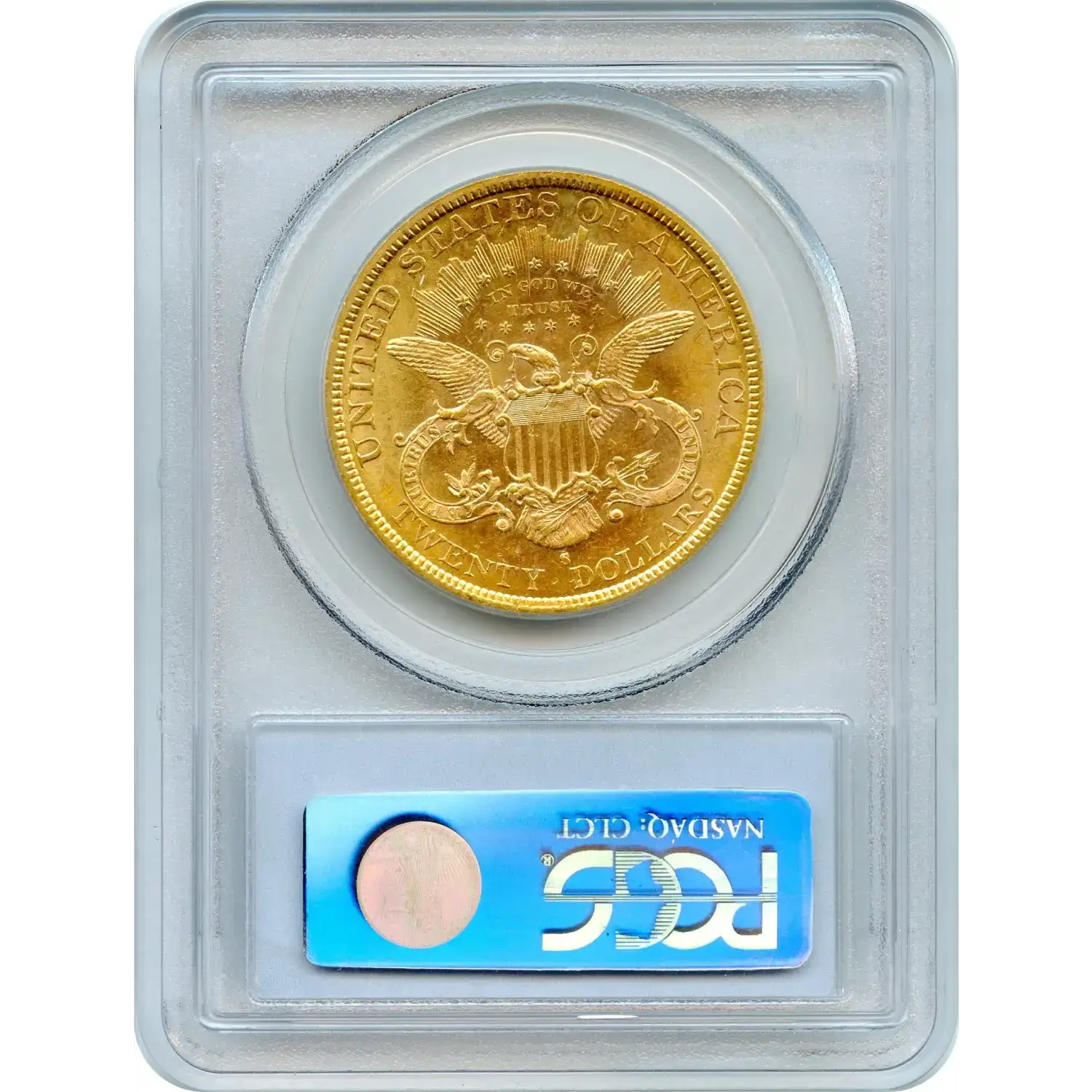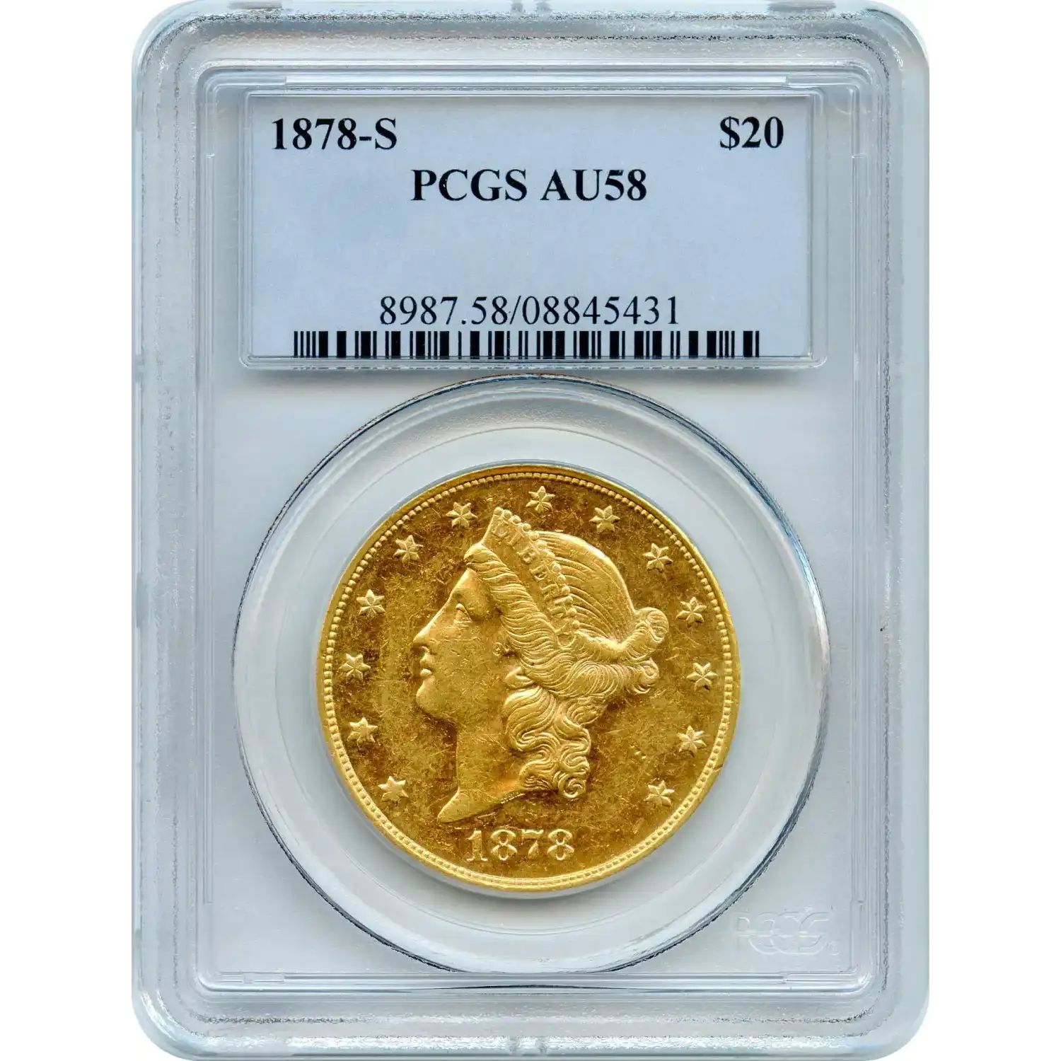 The 1878-S $20 Liberty Head Double Eagle marks a key shift in San Francisco Mint production. Unlike earlier dates with inconsistent striking quality, this issue shows refined hubbing that produced sharper details on Liberty's coronet and hair. The reverse eagle's feathers and scroll work stand out more crisply than in Philadelphia-minted counterparts, reflecting improved dies.
