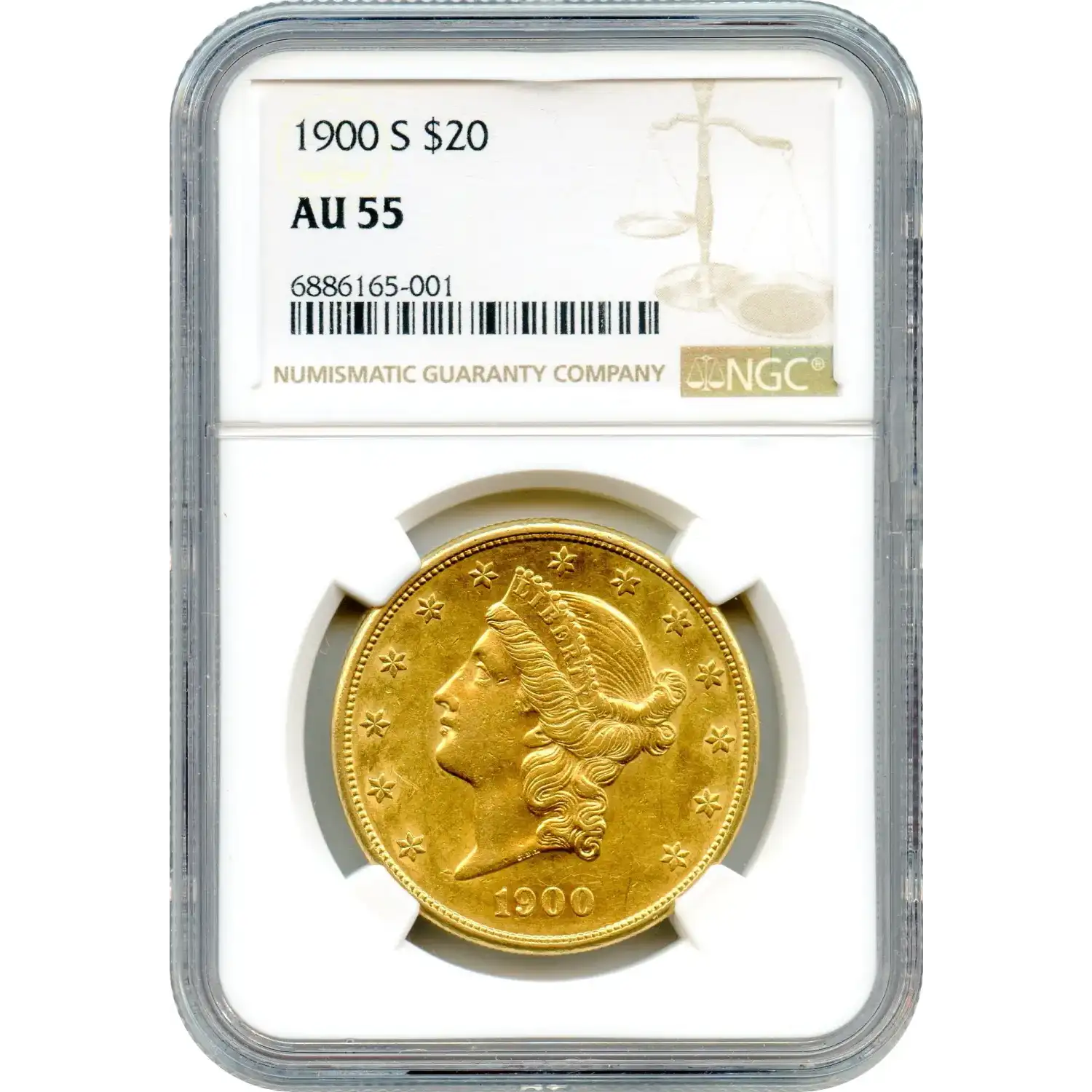 The 1900-S Liberty Head Double Eagle, struck at the San Francisco Mint, is a desirable artifact of American gold coinage during the Gilded Age. NGC has graded 97 as AU55 with 8,246 finer.