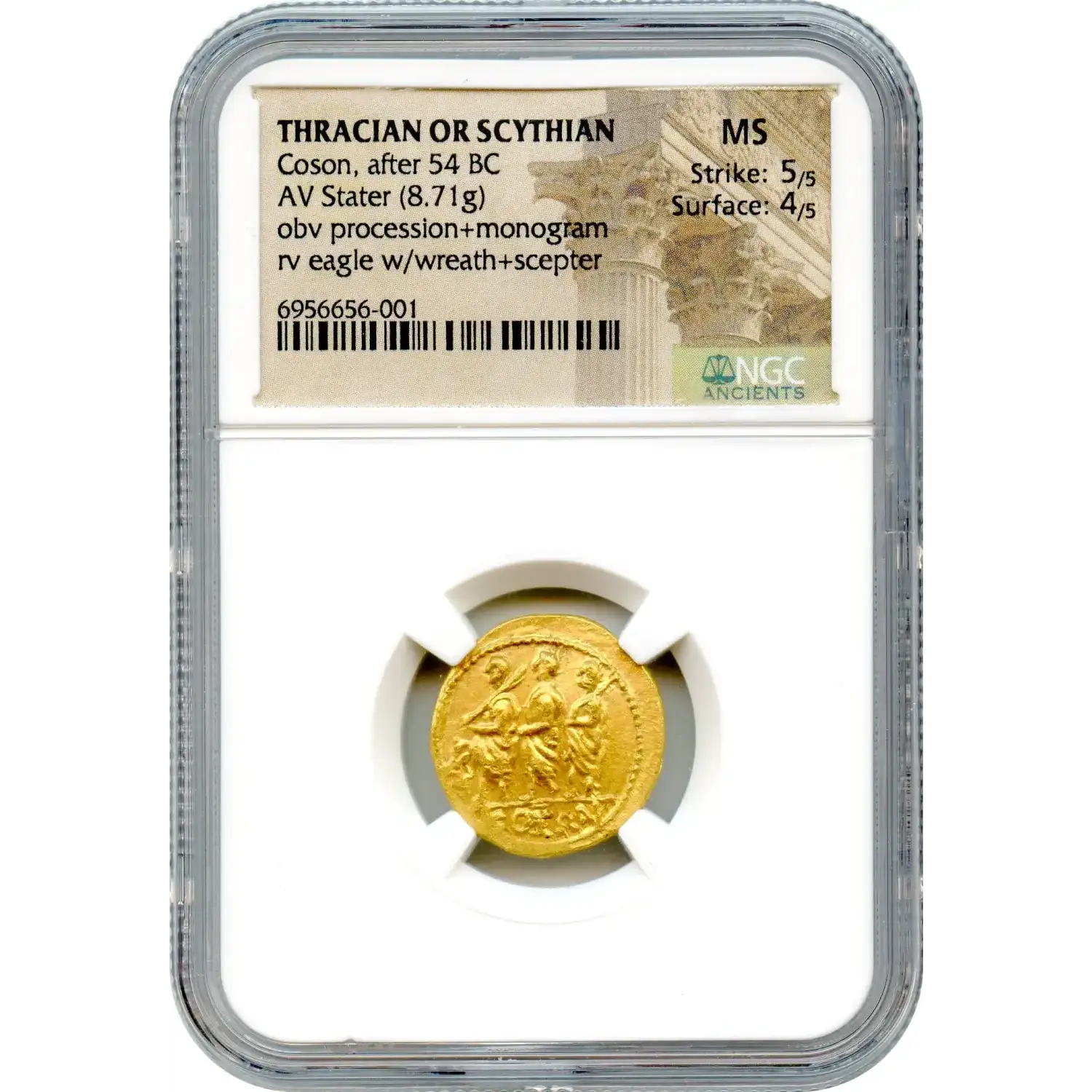 The Coson Stater, 54 BC, 8.71 g of sun-bright gold, whispers “KOSON” in a single proud line. NGC Ancients MS freezes every strike: luster like steppe snow, relief sharp enough to cut the thumb. Melted from Roman spoils, these coins armed Burebista’s riders, then slept two millennia in clay pots beneath Transylvanian oaks. Fewer than two hundred survive certified—each a hoofbeat locked in metal.