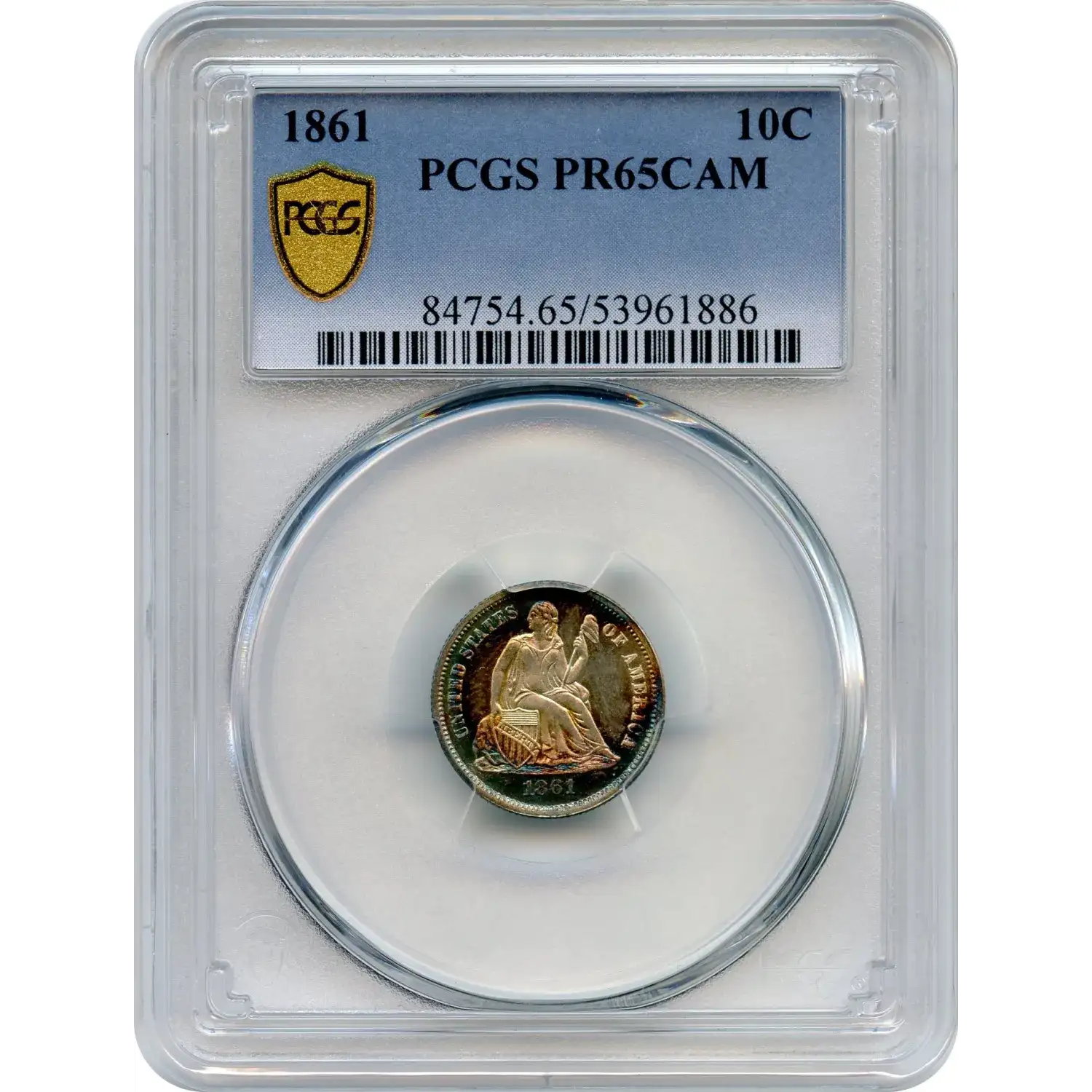 The 1861 10C Liberty Seated Dime in PCGS PR-65 CAM stands as a pinnacle of numismatic artistry, its proof surfaces capturing the elegance of James B. Longacre's design amid the Civil War's shadow. PCGS has graded 3 as PR65CAM with only 3 finer.