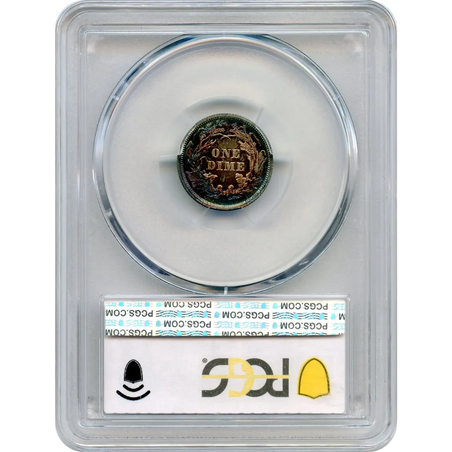 This toning is no mere patina; it is a symphony of natural oxidation, where delicate rainbow gradients frame the cameo contrast, with frosted portraits popping vividly against mirror-like backgrounds. Such chromatic depth not only enhances the dime's diminutive scale but evokes the era's turbulent beauty, transforming metal into a living canvas.