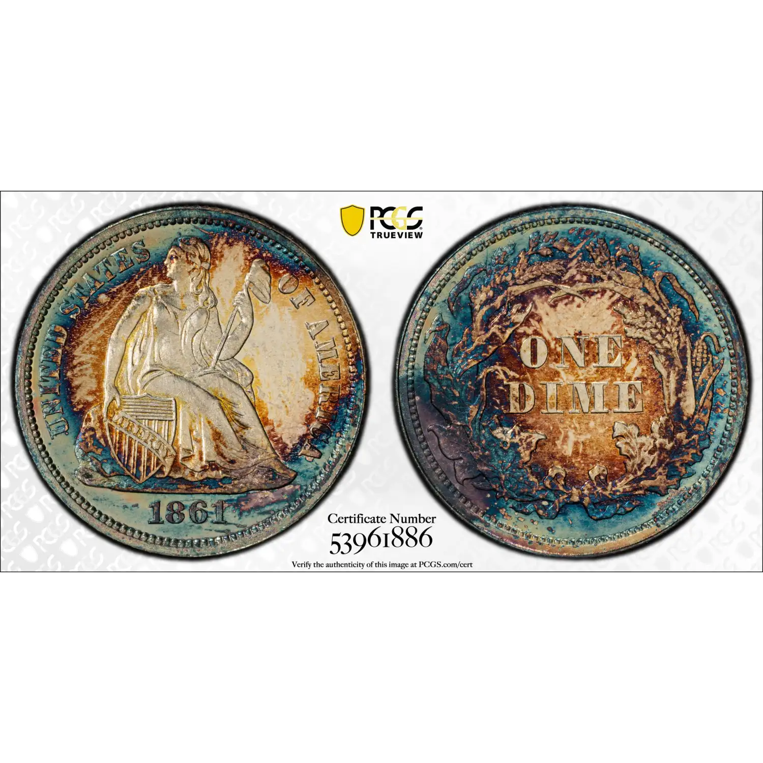 PCGS, in recognition of this exceptional allure, selected this very specimen to grace the CoinFacts page for 1861 Proof Liberty Seated Dimes in Cameo designation. Amid countless survivors, its toning's purity and vibrancy embody the issue's finest potential, serving as a benchmark for collectors seeking historical poetry in proof coinage.