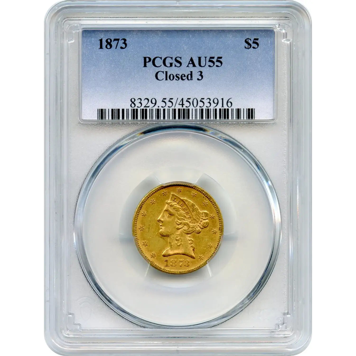The 1873 Closed 3 Liberty Head Half Eagle, struck at the Philadelphia Mint, marks a subtle but important variety in the long-running series designed by Christian Gobrecht. PCGS has graded 64 as AU55 with 158 finer.