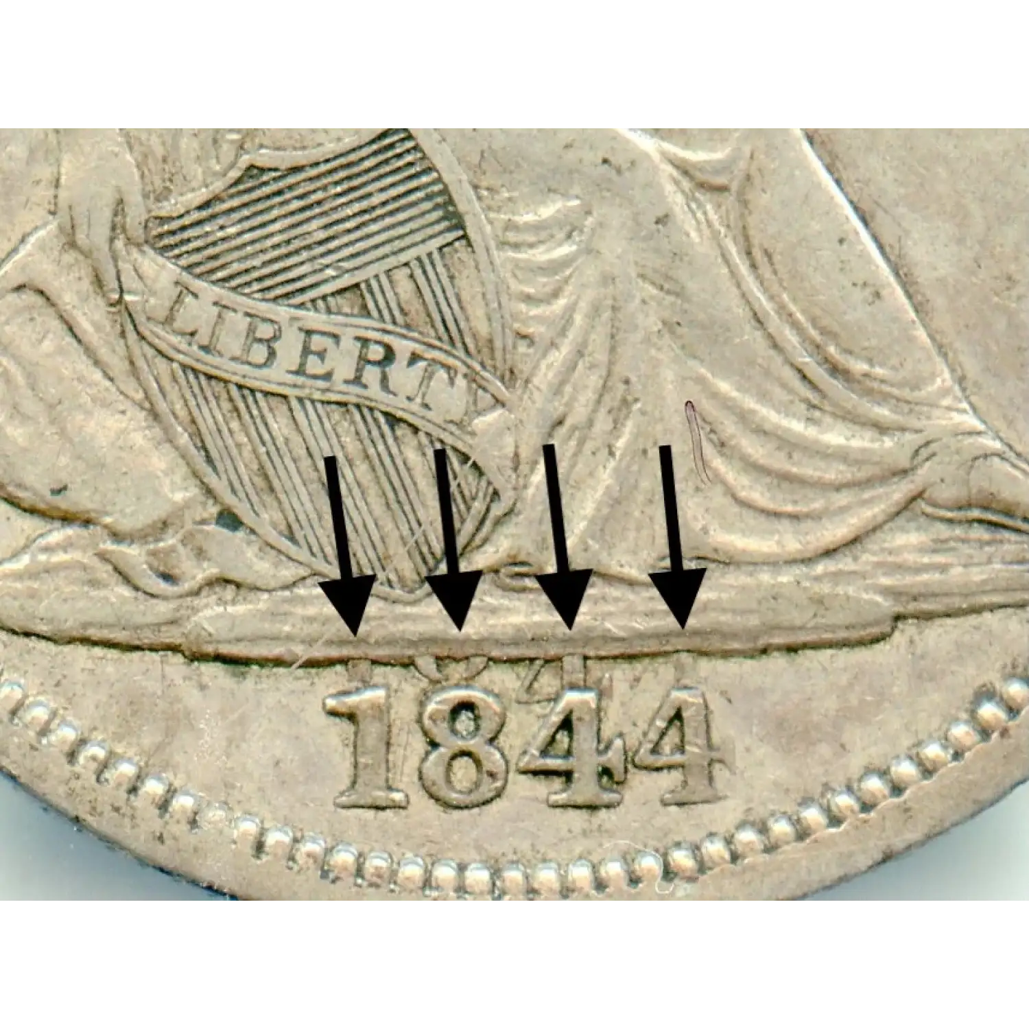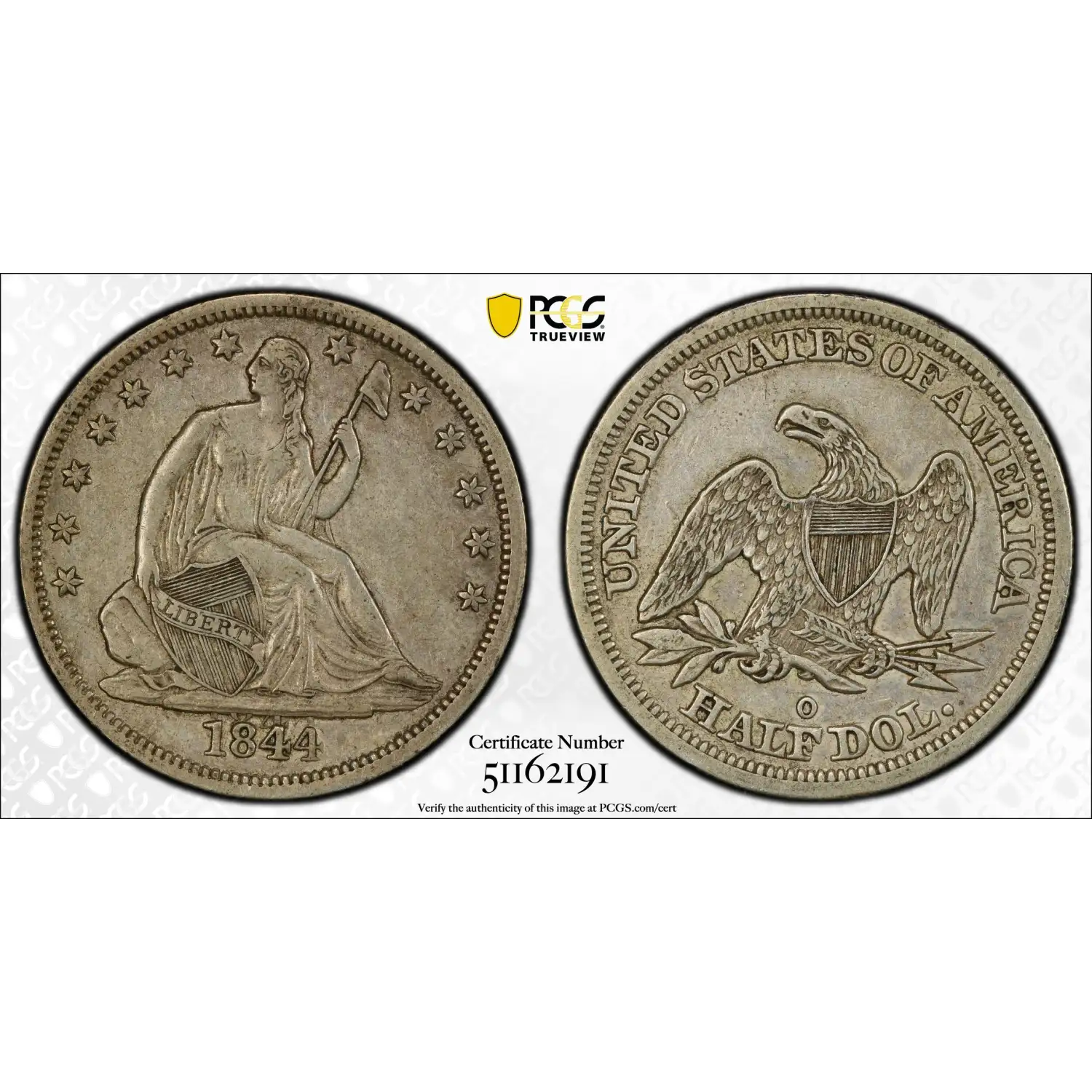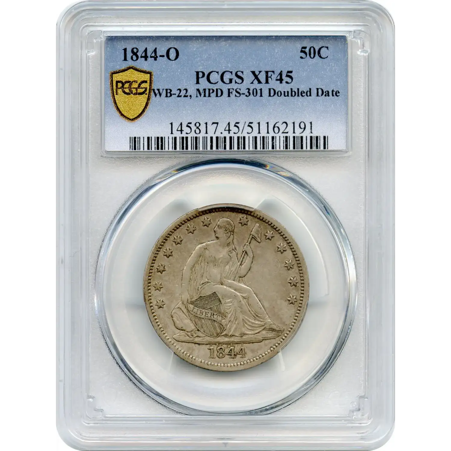 This 50-cent piece features Liberty seated on the obverse, holding a Liberty cap on a staff, with an eagle on the reverse. Graded PCGS XF-45, it shows moderate wear while retaining sharp details. The date 1844 displays dramatic doubling. The doubling is most prominent in the “84” of the “1844” date on this offering from AU Capital Management. It is visible, however, on the entire date. Please take a look at the photo provided and you will easily see the doubling.