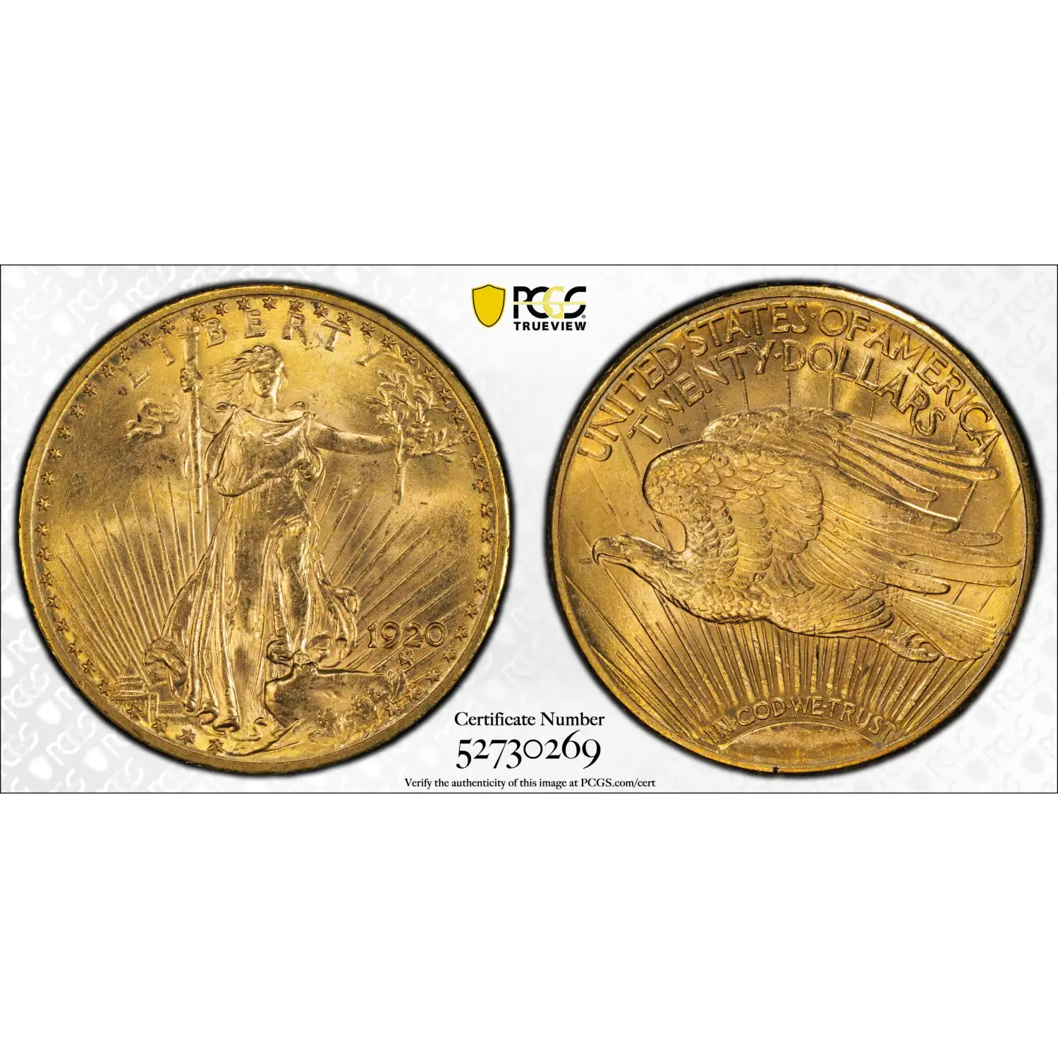 The 1920 Saint-Gaudens Double Eagle features Liberty on the obverse, standing amid sun rays with a torch in one hand and an olive branch in the other. The reverse shows a flying eagle above "UNITED STATES OF AMERICA" and "TWENTY DOLLARS." Augustus Saint-Gaudens designed this motif in 1907, incorporating Roman numerals for the date and subtle stars.