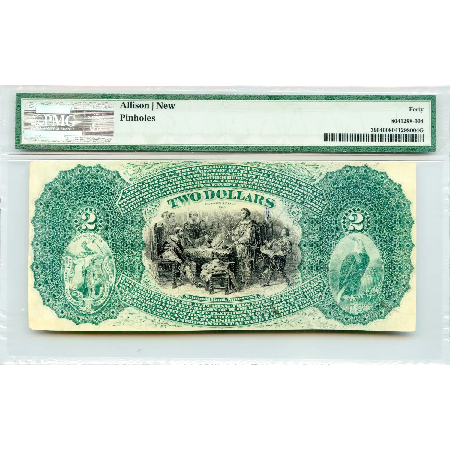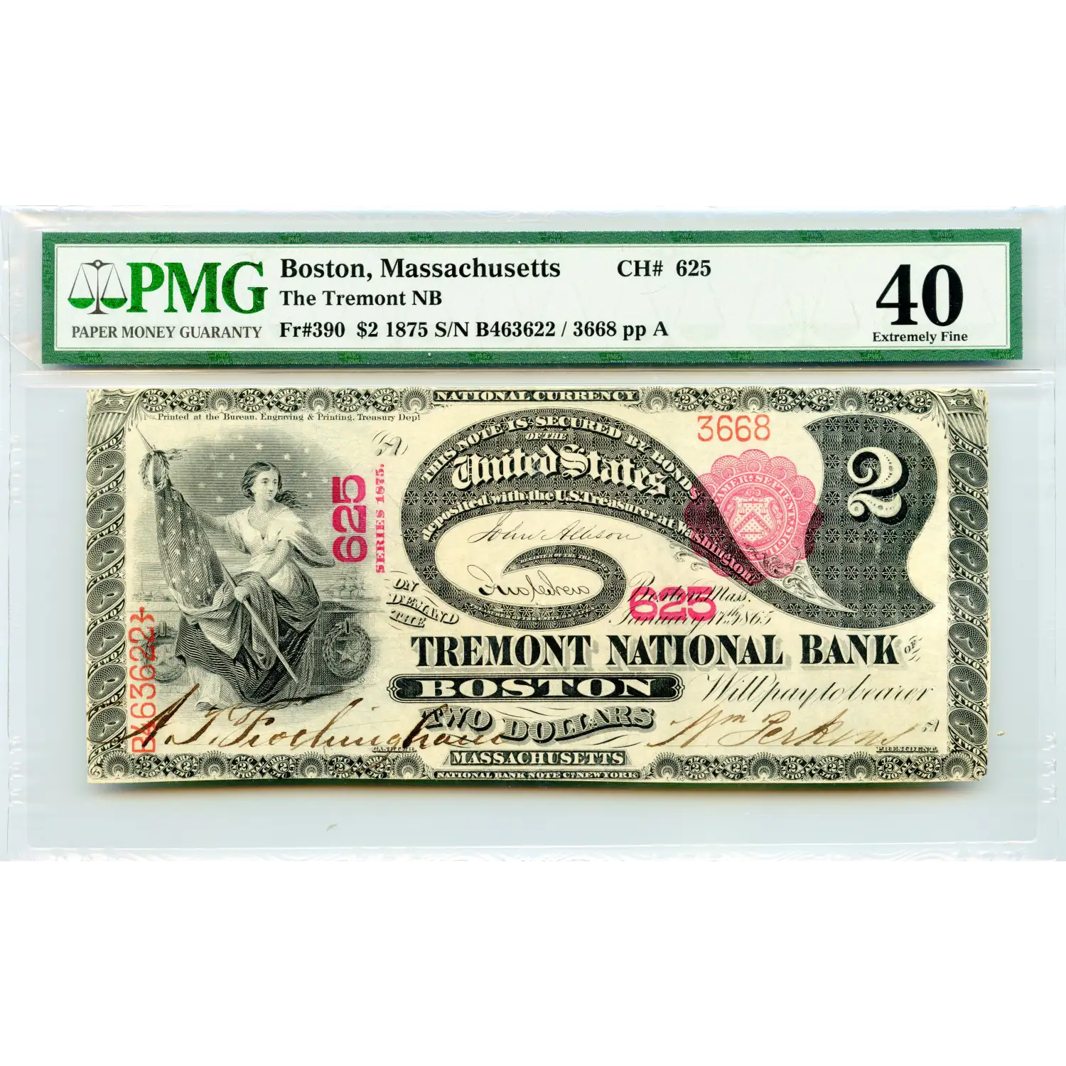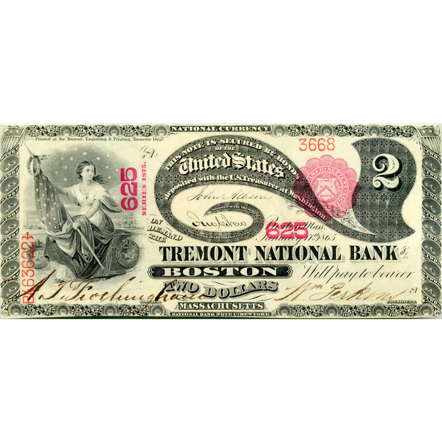 This is a $2 original series National Bank Note (1875), First Charter Period, specifically the scalloped-seal variety cataloged as Friedberg 390 in Paper Money of the United States by Robert Friedberg. It is a large-size note issued under the National Banking Act of 1863, which authorized national banks to print their own currency backed by U.S. government bonds. These notes circulated as legal tender alongside federal issues and were redeemable in coin at the issuing bank. Design: The face features the classic design known as the "Lazy Deuce" while an allegorical figure of Liberty is featured at the left. The bank's name, location (Boston, Massachusetts), charter number (625), and series date (1875) prominently displayed. The reverse is a simple geometric guilloche pattern in green ink. The scalloped (wavy-edged) design of the red Treasury seal and serial numbers distinguishes this from earlier ray-design First Charter notes (Friedberg 389). Issuer: The Tremont National Bank of Boston (Charter #625), one of the early national banks formed during the Civil War era to stabilize the currency. It was organized on December 5, 1864, and chartered on December 14, 1864. The bank operated successfully for over three decades, focusing on commercial banking in Boston's financial district, before liquidating on December 20, 1898, and being absorbed by the Eliot National Bank of Boston (Charter #536). Issuance Context: As a First Charter Period note (1864–1875), it was produced by the National Bank Note Company. The 1875 date marks the end of the Original Series, after which designs shifted to "Brown Backs." Banks like Tremont deposited bonds with the U.S. Treasury to secure the notes' value, and this $2 denomination was among the smallest issued, making it less common than $1, $5, or $10 notes. Rarity and Collectibility: These notes are highly sought after by type collectors and those focusing on obsolete bank currency. While Friedberg 390 as a type is scarce (fewer than 100 examples known across all issuing banks), this specific example from the Tremont National Bank is exceptionally rare—only two are known to exist, per auction records and census data from the Society of Paper Money Collectors. Most $2 Original Series notes from any First Charter bank are rarities due to heavy circulation wear and limited production (the $2 was not a popular denomination for everyday use). Survivors from Boston banks like Tremont are prized for their historical tie to one of America's earliest financial hubs. Value: Values vary widely by condition (graded on a 1–70 scale by services like PMG or PCGS), eye appeal, and signatures (yours likely bears those of Treasurer Allison and Register New). Recent auction comps for similar notes in decent circulated grades (VF-20 to XF-40) range from $5,000–$15,000, but high-grade examples or those with specific bank rarities like this Tremont National Bank can exceed $50,000–$100,000+. For instance, a VF example from this bank sold for around $20,000 in recent years.