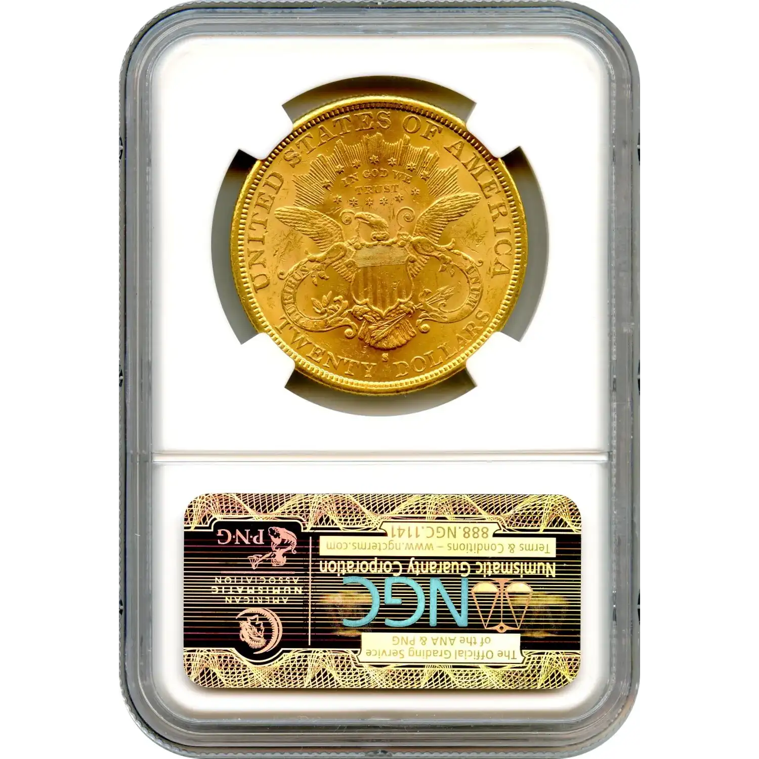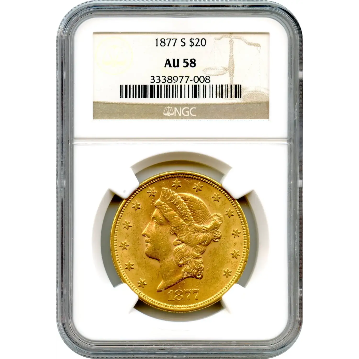 The 1877-S $20 Liberty Head Double Eagle, minted in San Francisco, showcases James B. Longacre’s enduring design. NGC has graded 770 as AU58 with 1,806 finer.