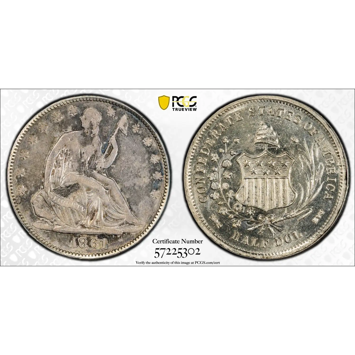 Authorized in 1861 at the New Orleans Mint shortly after Louisiana seceded, just four original examples were produced using a modified U.S. half dollar reverse and a specially cut Confederate obverse die featuring a seated Liberty with shield and liberty cap.
