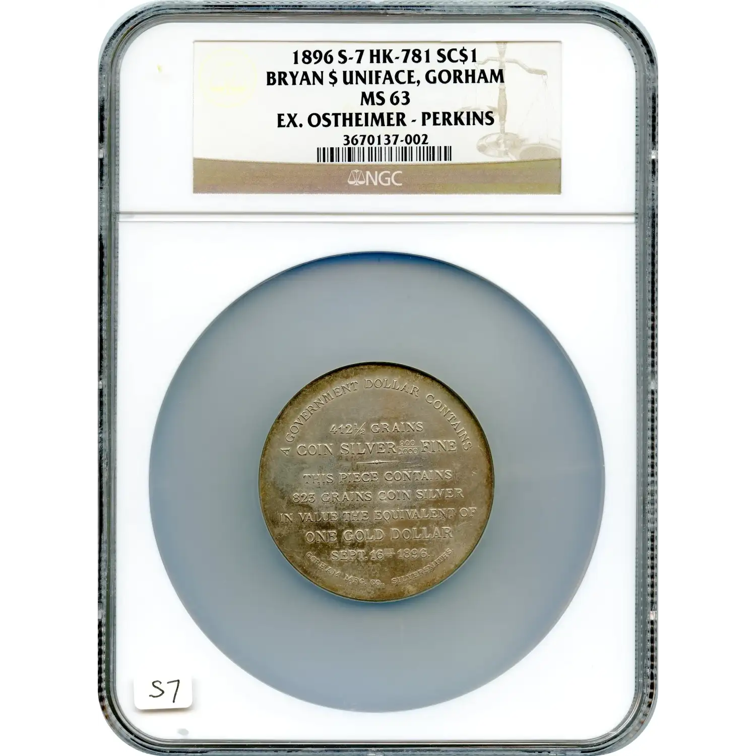 1896 Bryan Dollar. Silver. 52 mm. HK-781, Schornstein-7. Rarity-5. MS-63 (NGC). Exceptional Choice Mint State quality for the type, both sides are smooth and inviting. The eye appeal is well above average, with the surfaces pleasantly toned in blended lilac and olive-gray with iridescent undertones of reddish-gold and powder blue. The obverse features A GOVERNMENT DOLLAR CONTAINS / 412 1/2 GRAINS/ COIN SILVER 900/100 FINE / THIS PIECE CONTAINS / 823 GRAINS COIN SILVER / VALUE THE EQUIVALENT OF / ONE GOLD DOLLAR / SEPT. 16TH 1896. / GORHAM MFG. CO. SILVERSMITHS. The reverse is a blank uniface, as are all. Lustrous grey finish with blue and gold highlights.