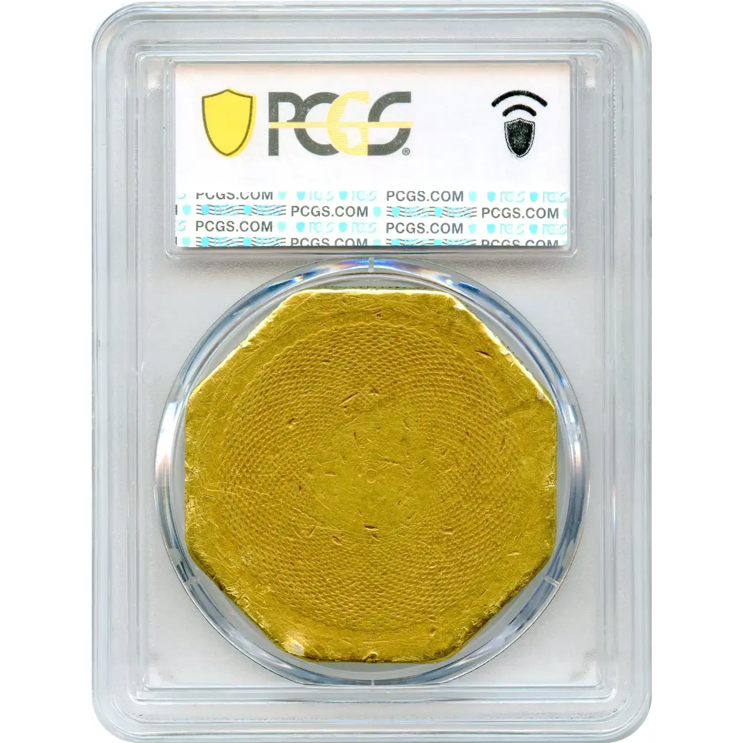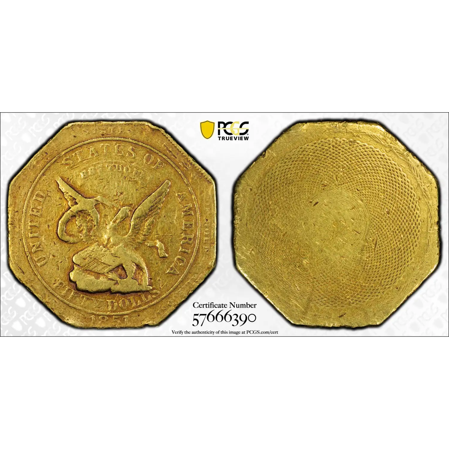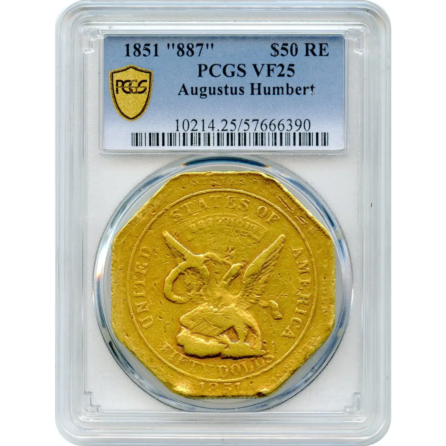 Struck in San Francisco by the newly appointed United States Assayer of Gold, Augustus Humbert, these massive octagonal fifty-dollar pieces served as an emergency private coinage when the federal government could provide no official solution for circulating refined gold. It had a stated weight of “887 Thous” (887 thousandths fine, approximately 41.35 grams).